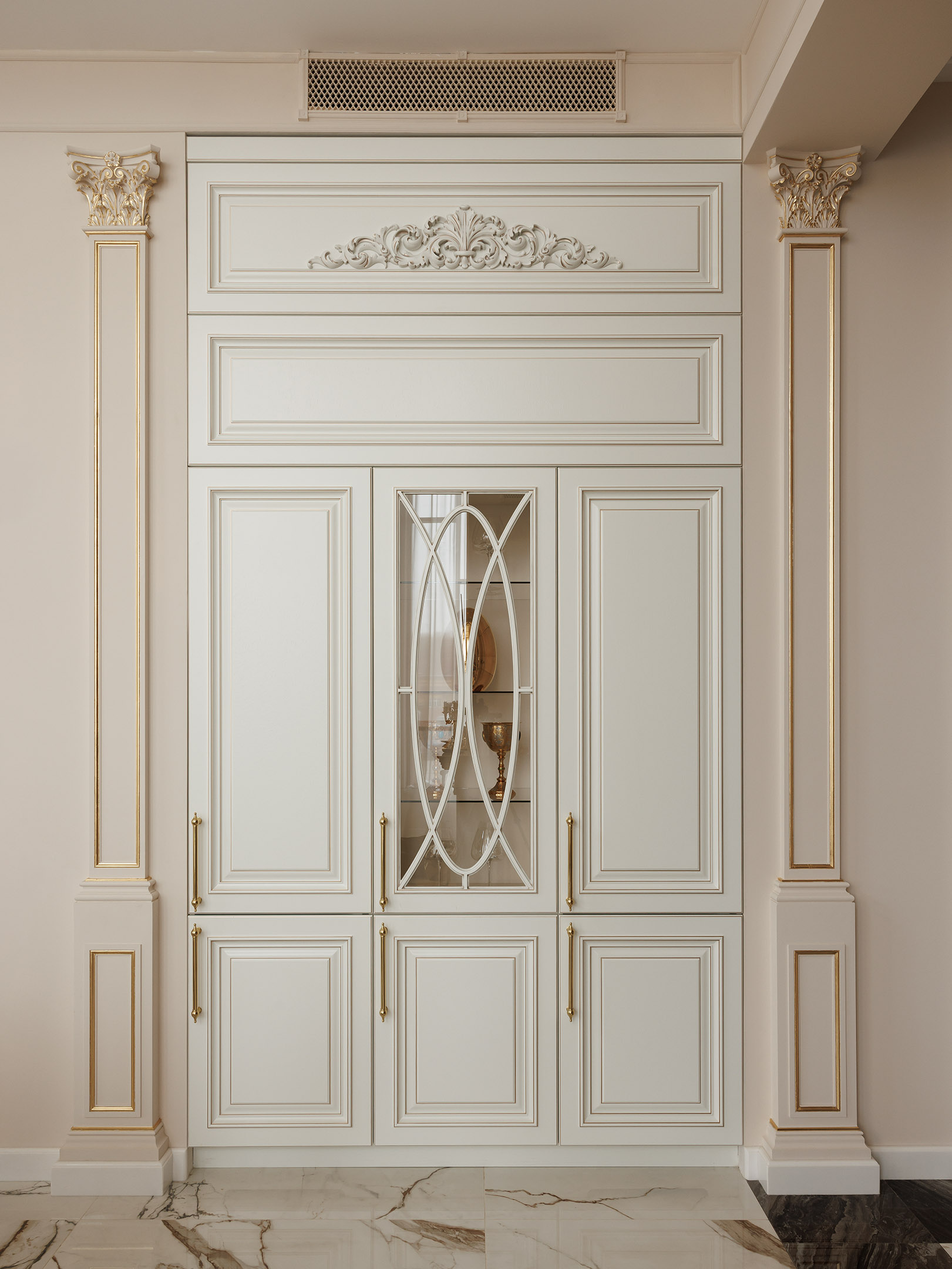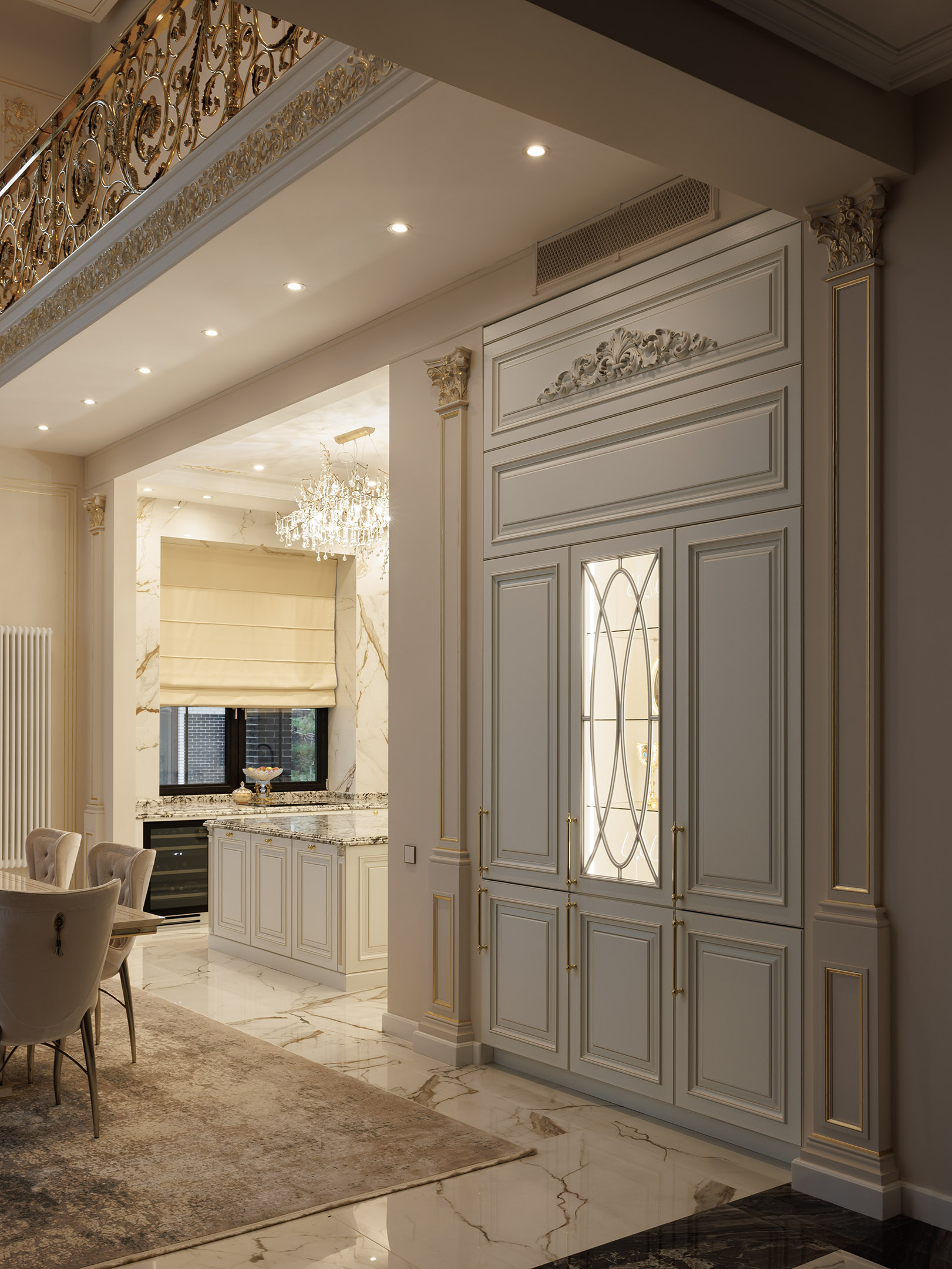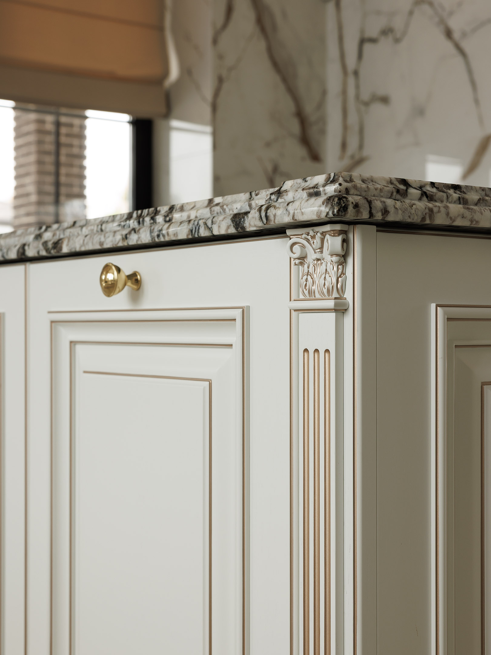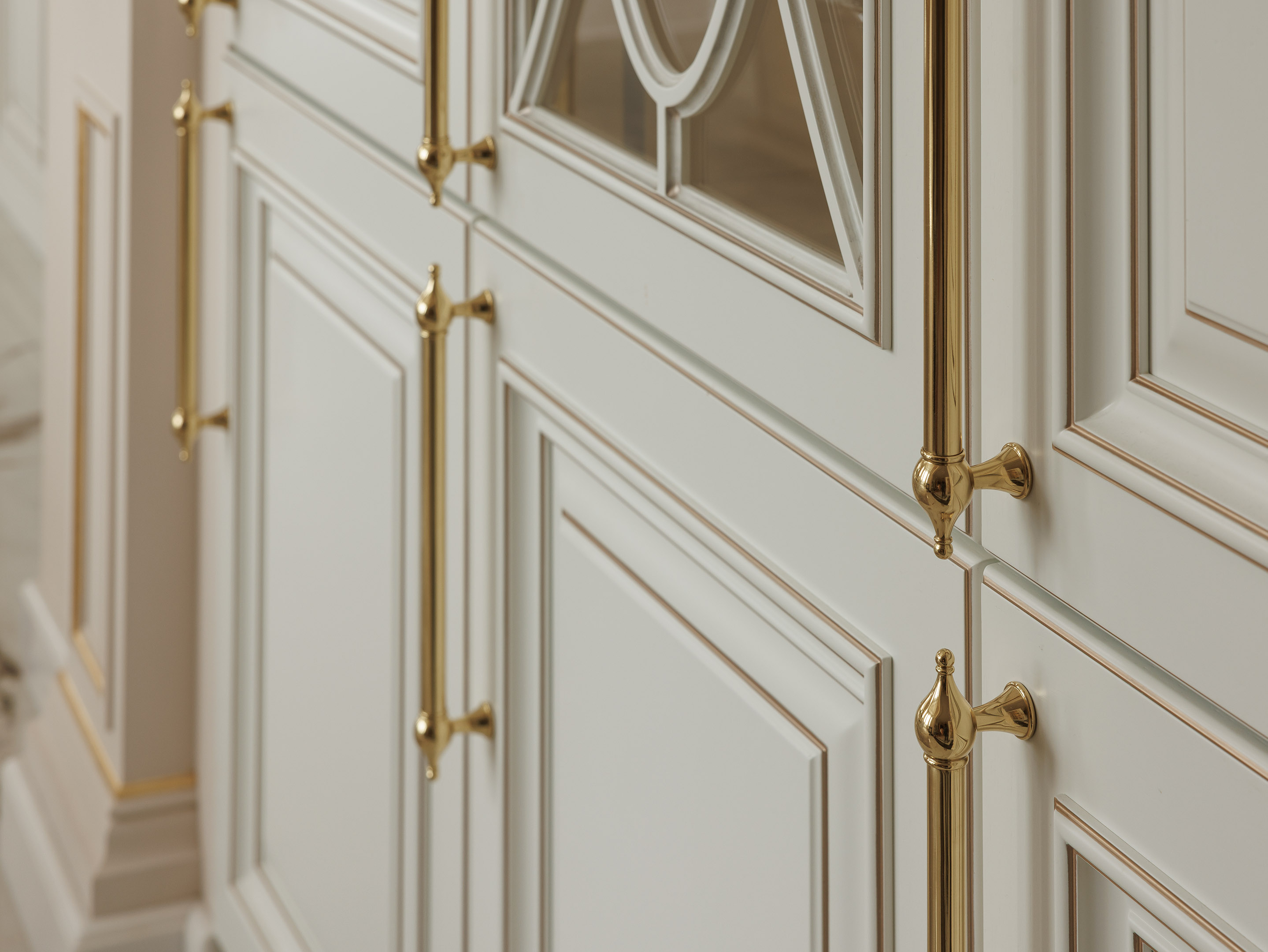 Классическая кухня П-образной формы с островом выполнена без верхних шкафов — их функцию заменяет отдельная кладовая. Композицию дополняют витринные шкафы в классическом стиле и пенальная группа для хранения винной коллекции.