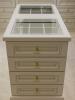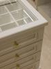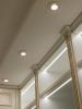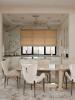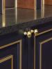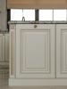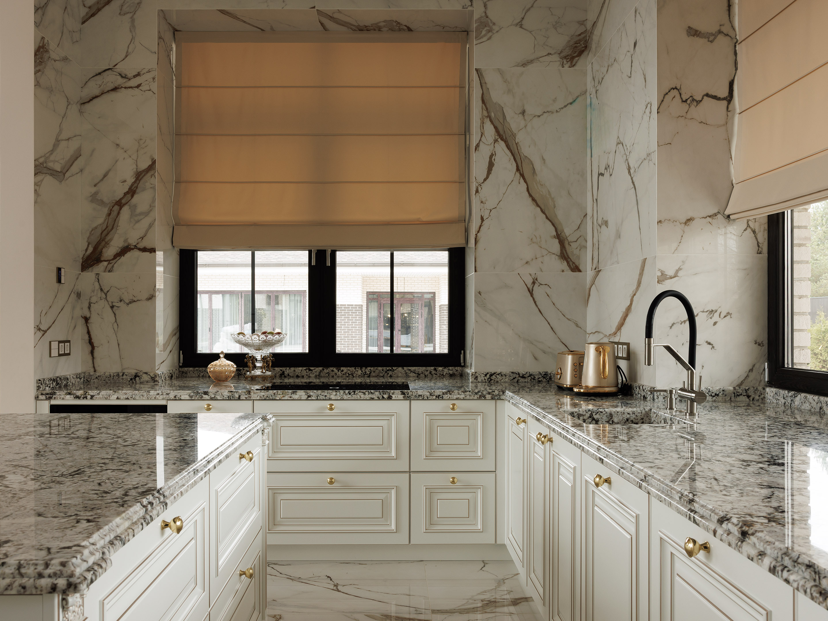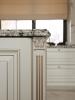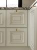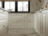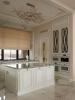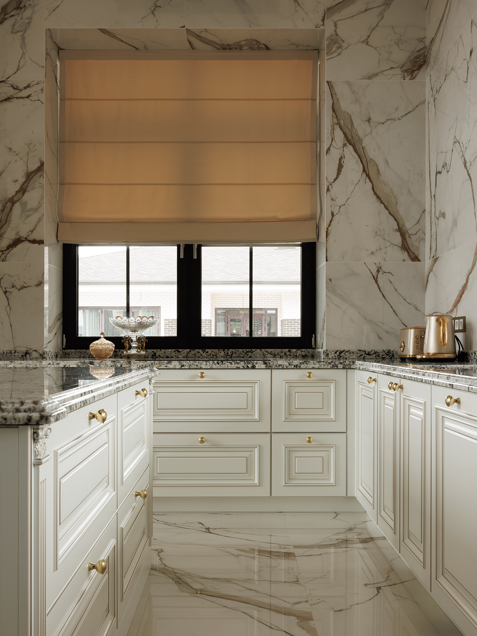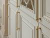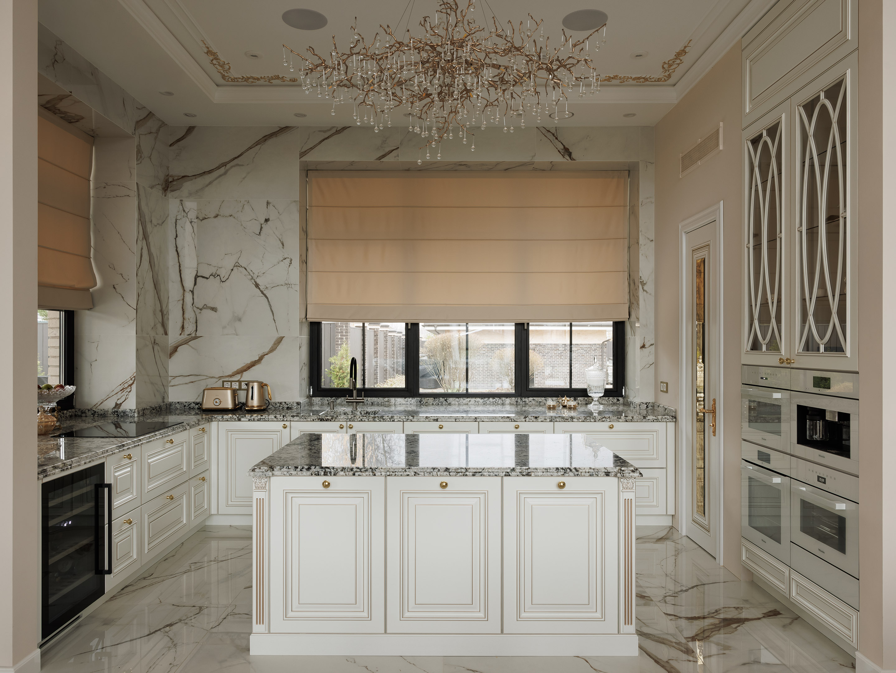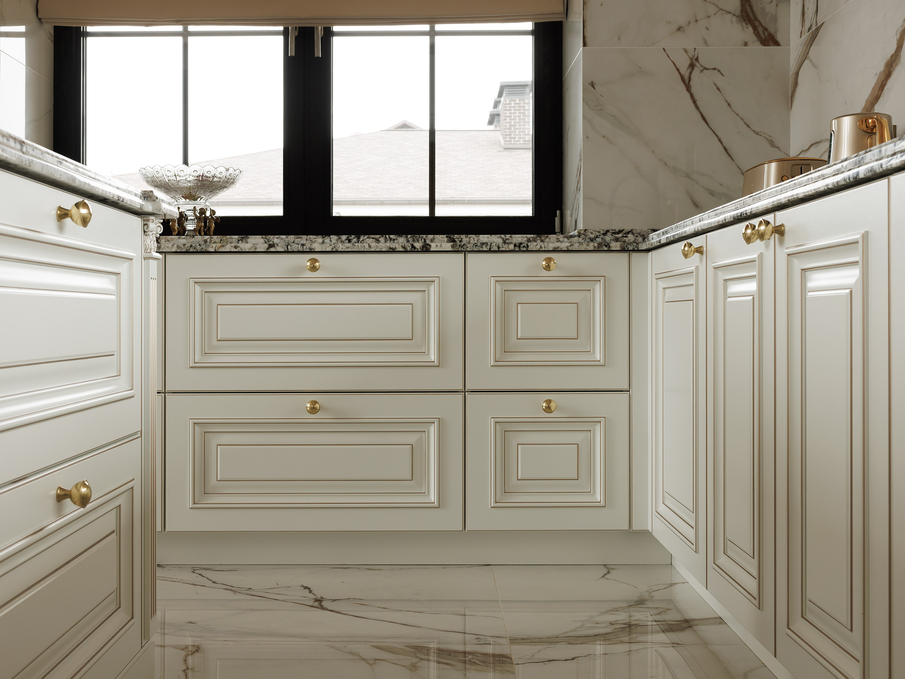Классическая кухня П-образной формы с островом выполнена без верхних шкафов — их функцию заменяет отдельная кладовая. Композицию дополняют витринные шкафы в классическом стиле и пенальная группа для хранения винной коллекции.