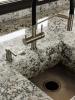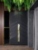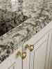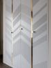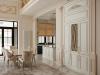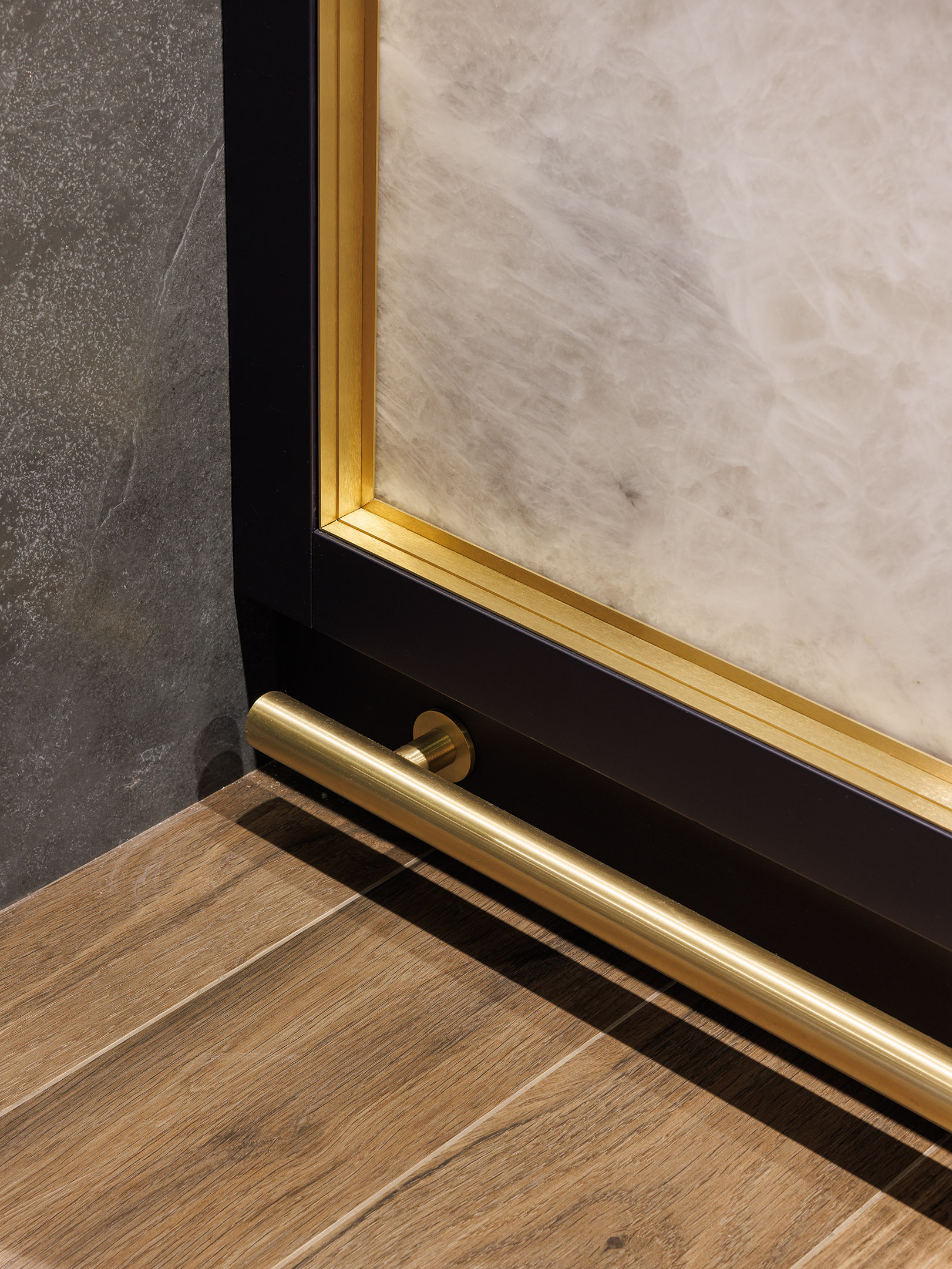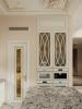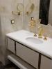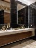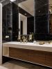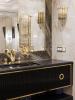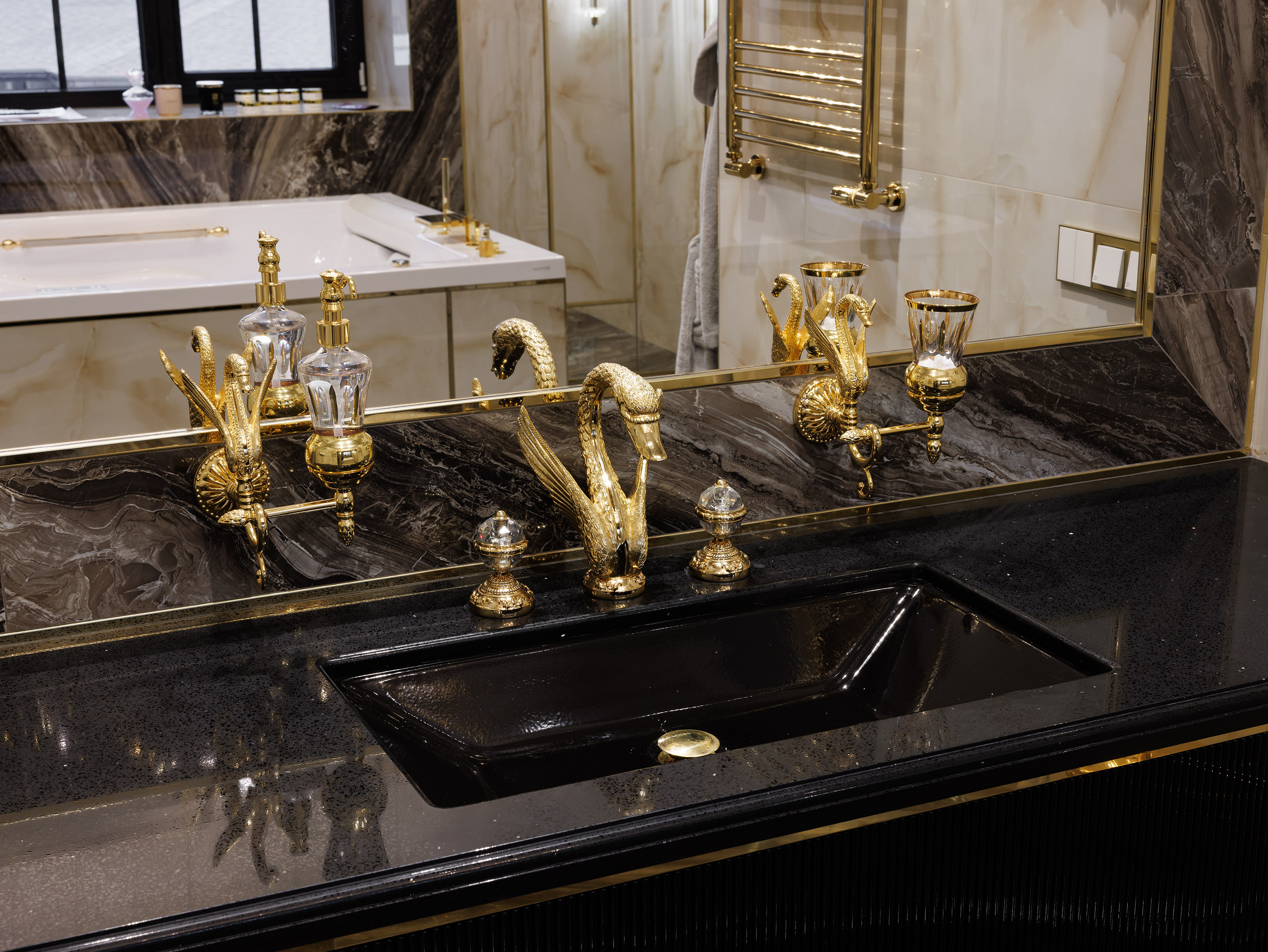 Ванные комнаты оформлены подвесными тумбами с эксклюзивными фасадами. В отделке использованы декоративные металлические элементы в золотистом тоне, подчёркивающие статусность интерьера.