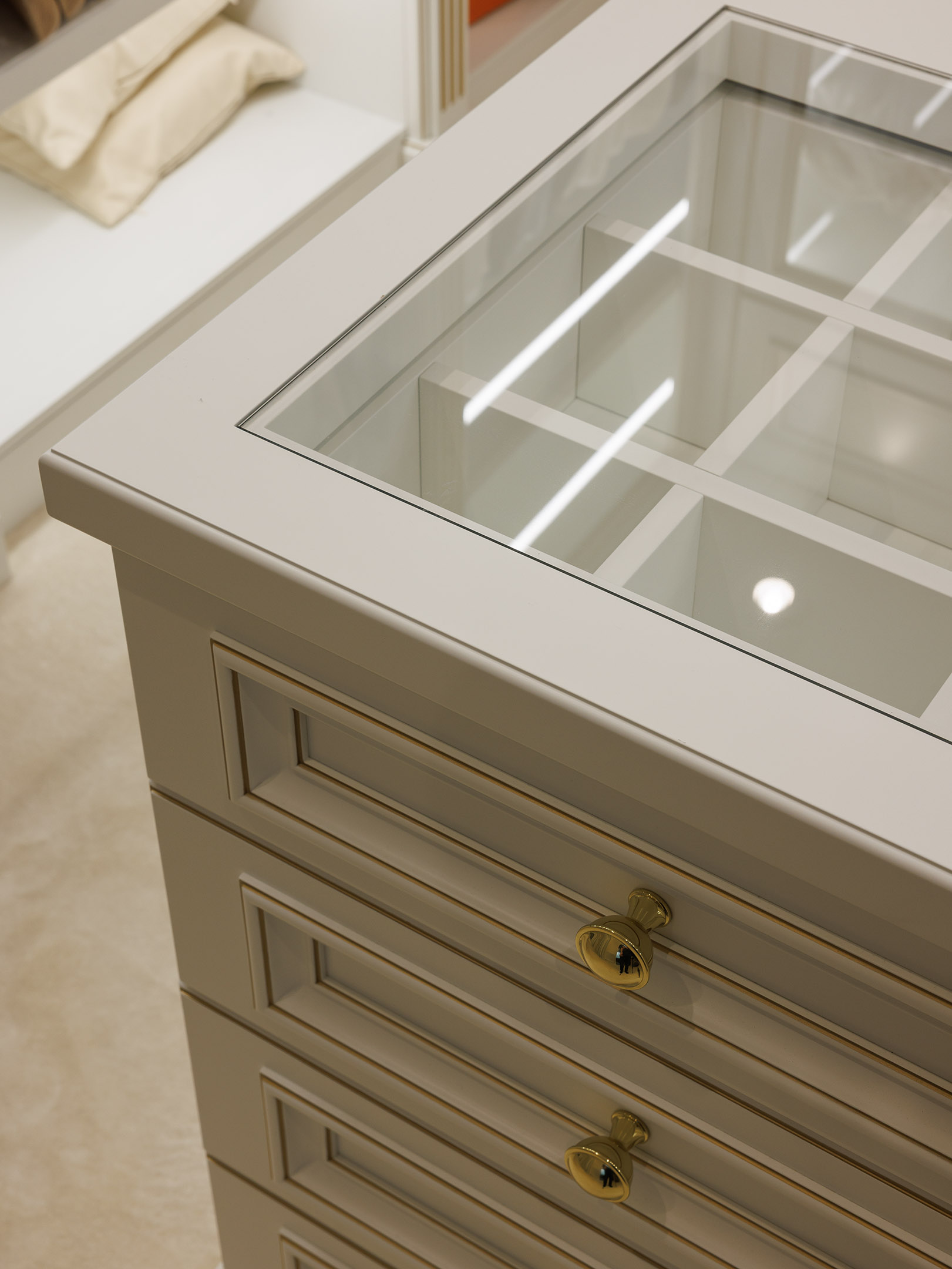 Объёмная гардеробная комната оснащена системами хранения и островом для аксессуаров — всё выполнено в едином стиле и с максимальным вниманием к деталям.