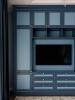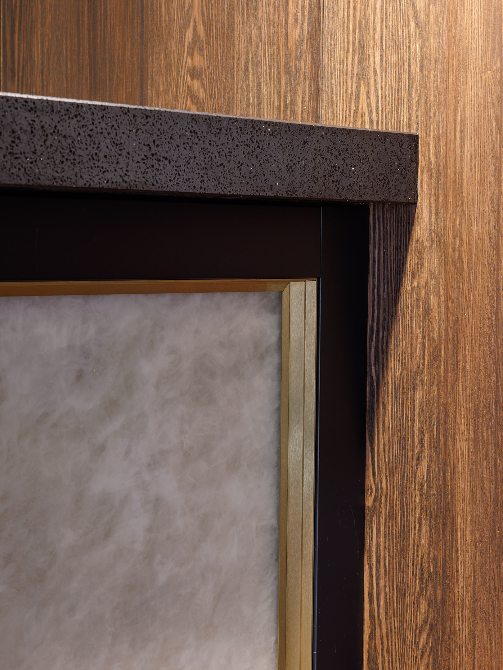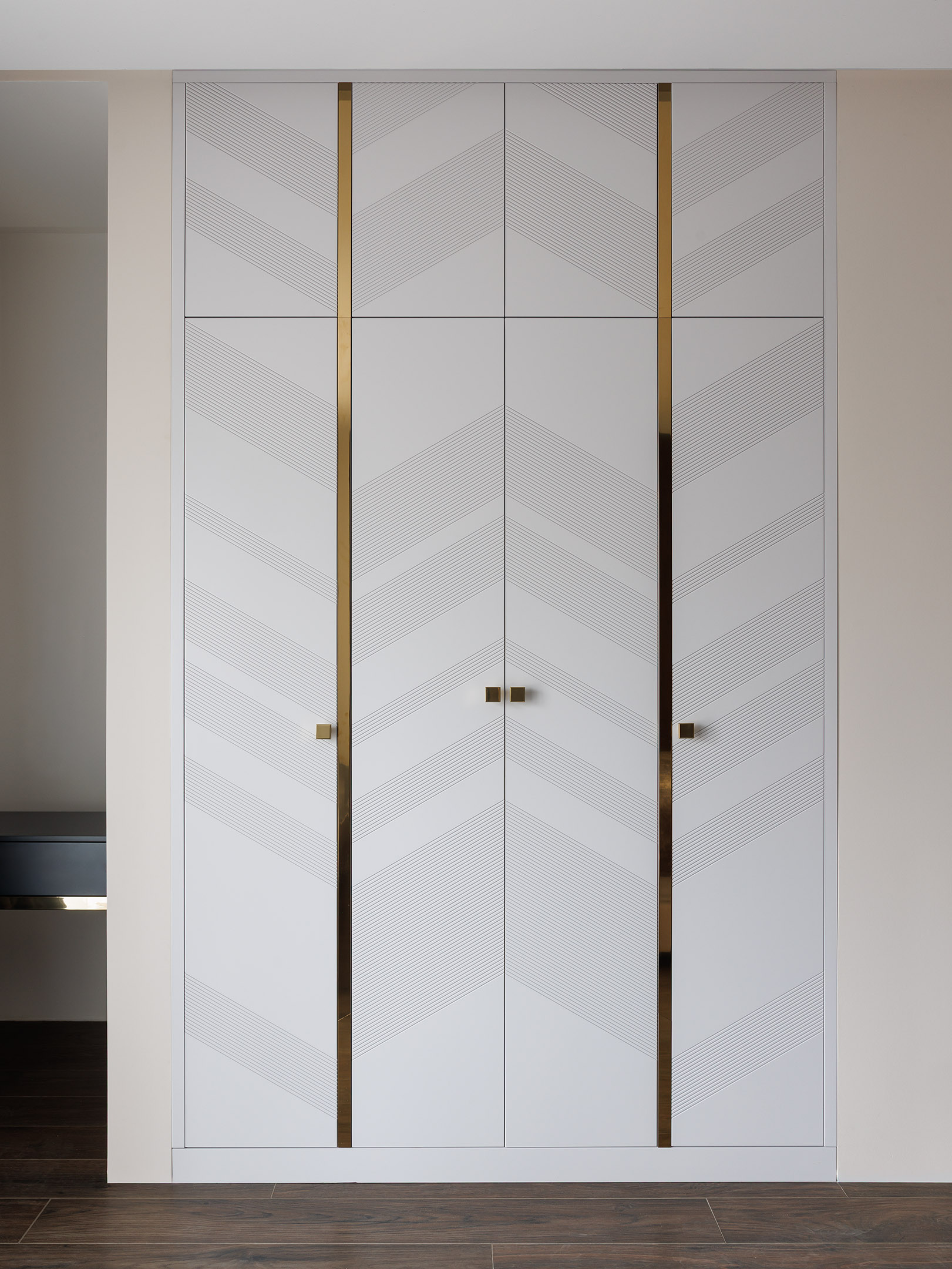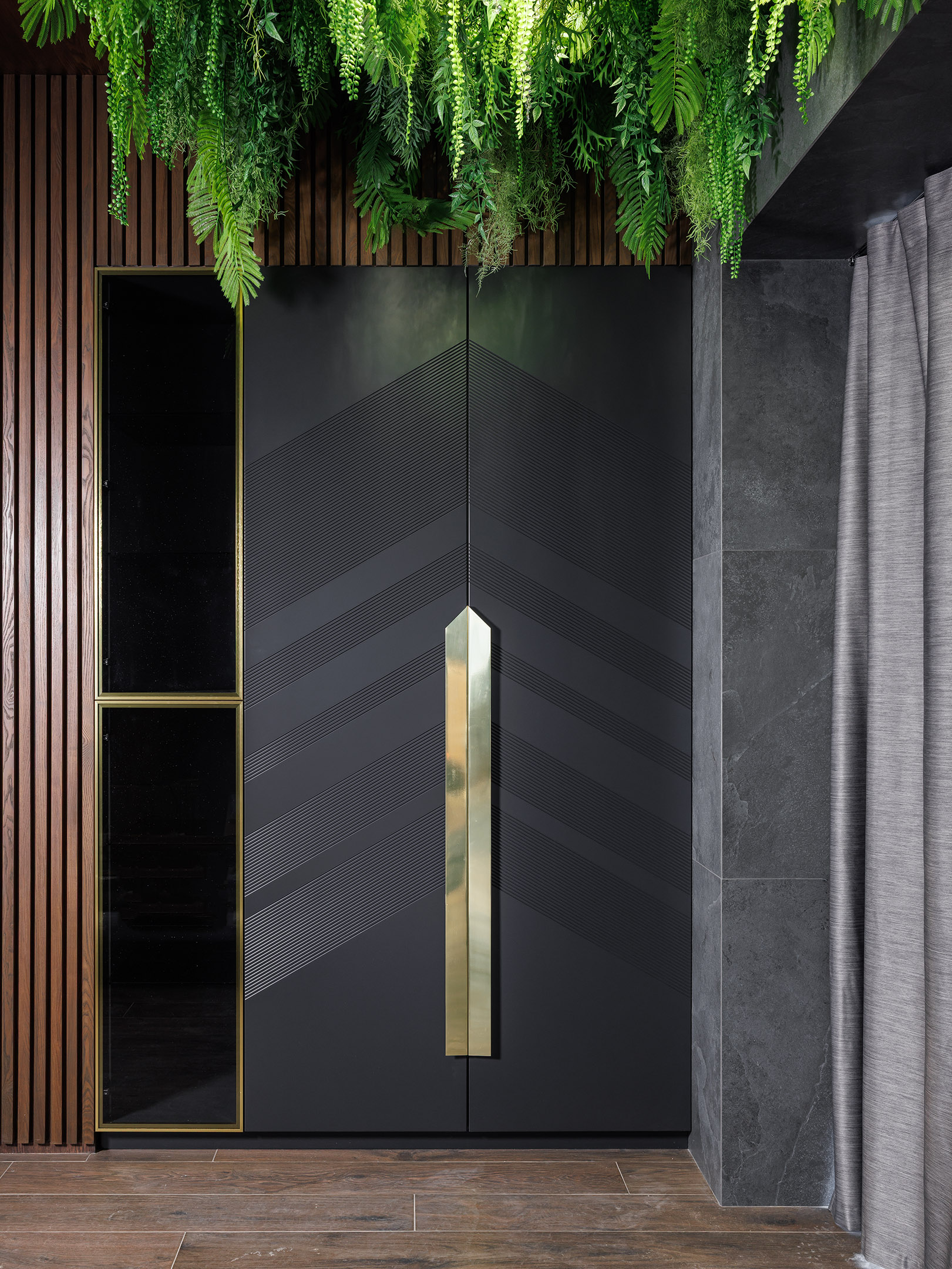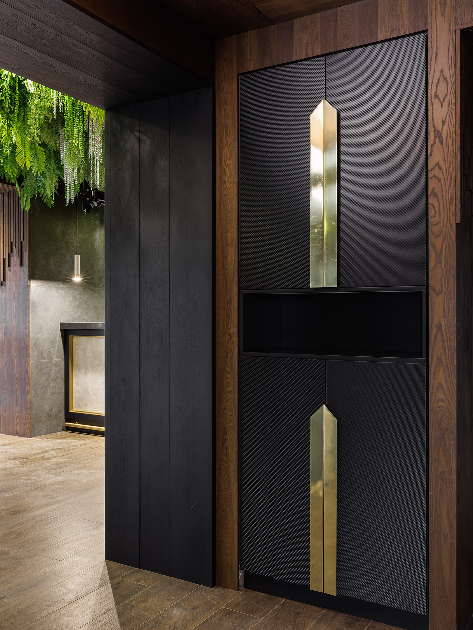 Ярким элементом интерьера стал кабинет. Здесь мы создали уникальные фасады со сочетанием шпона и металлических вставок, изготовили рабочий стол с авторской отделкой и оформили стену объёмными панелями из того же шпона. Даже потолочная зона включает элементы нашей работы.
