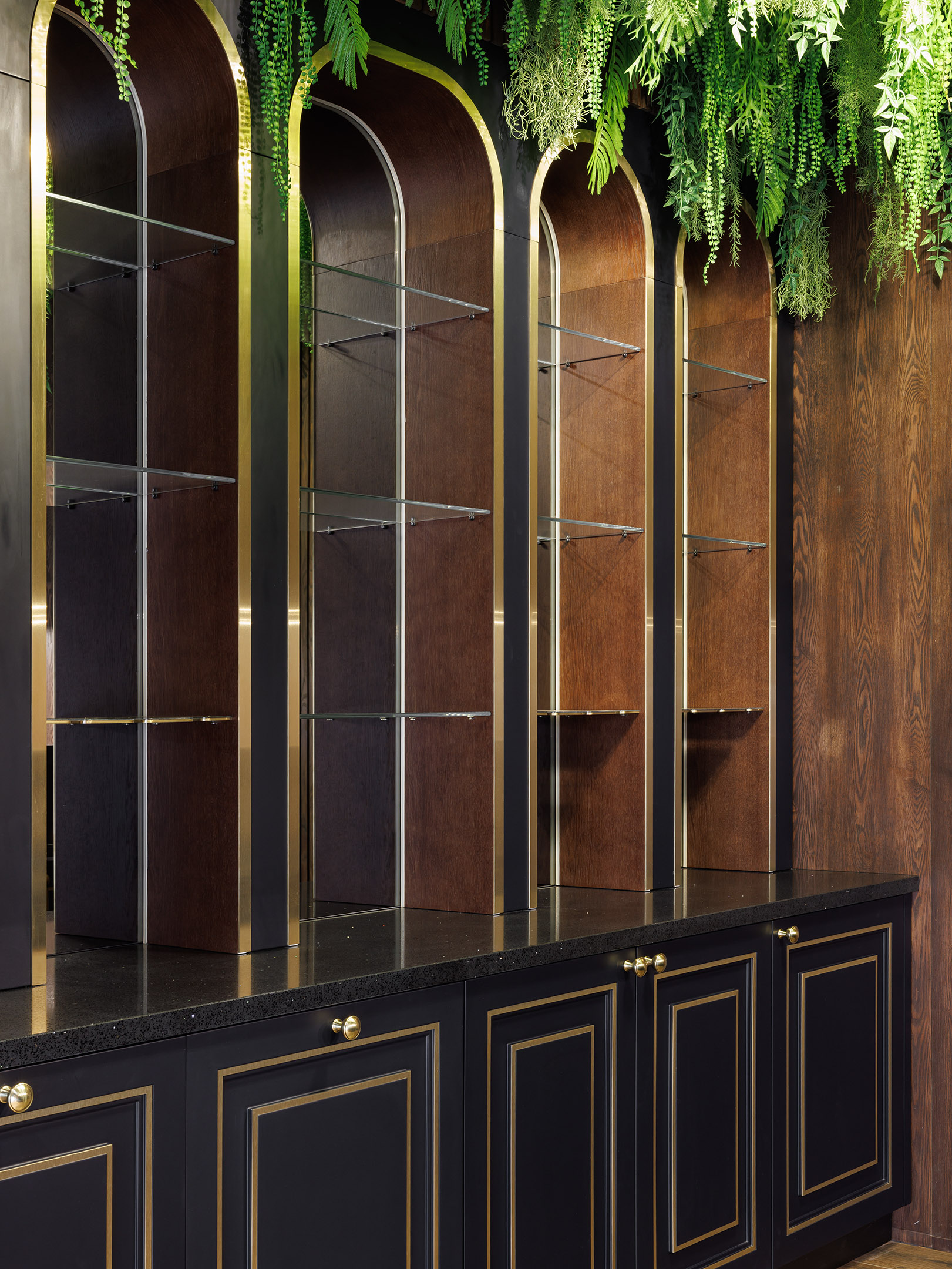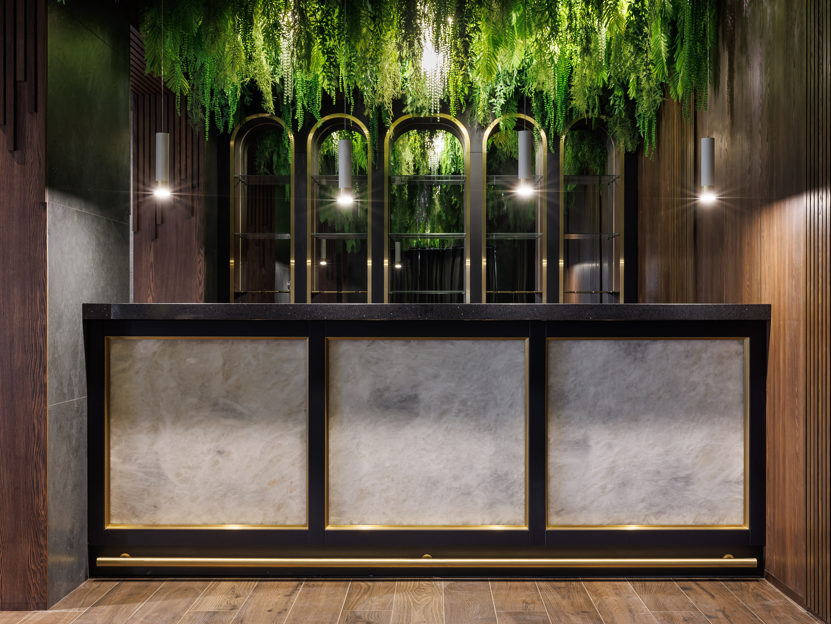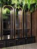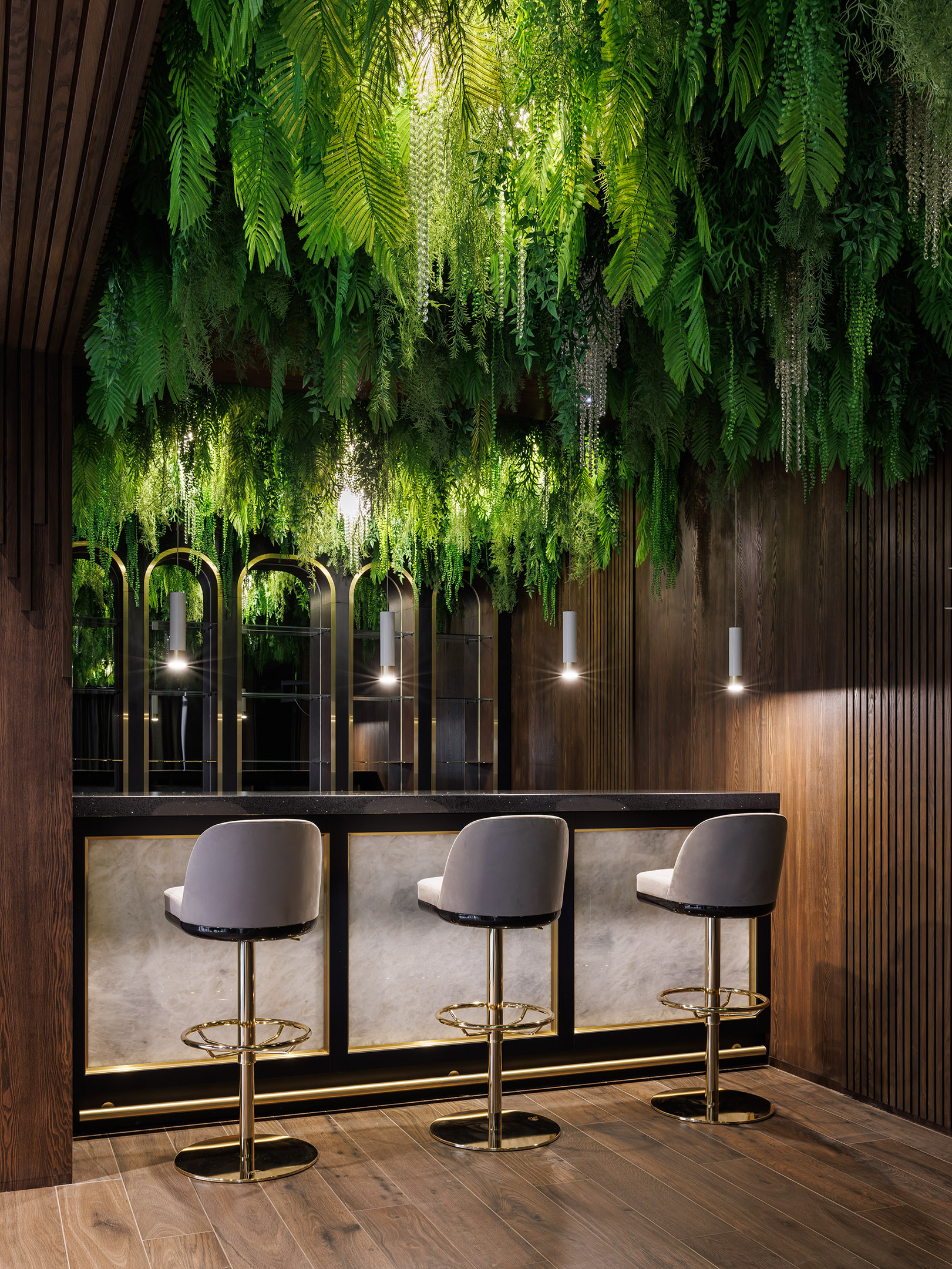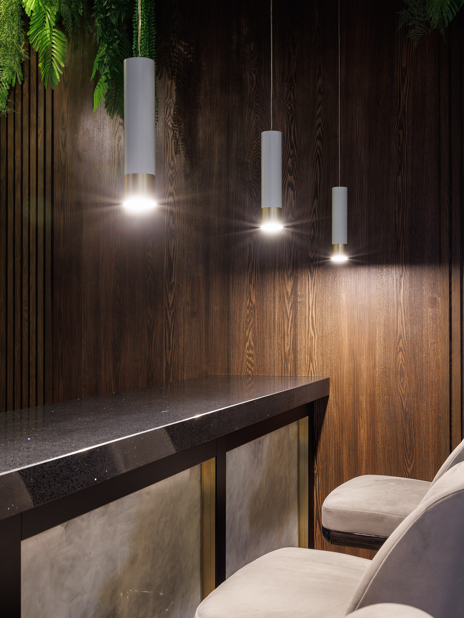 В отдельном здании СПА с бассейном мы разработали и произвели барную зону: металлические и зеркальные элементы, барная стойка с элементами из натурального камня и шкафы для хранения — всё выдержано в одном дизайне.