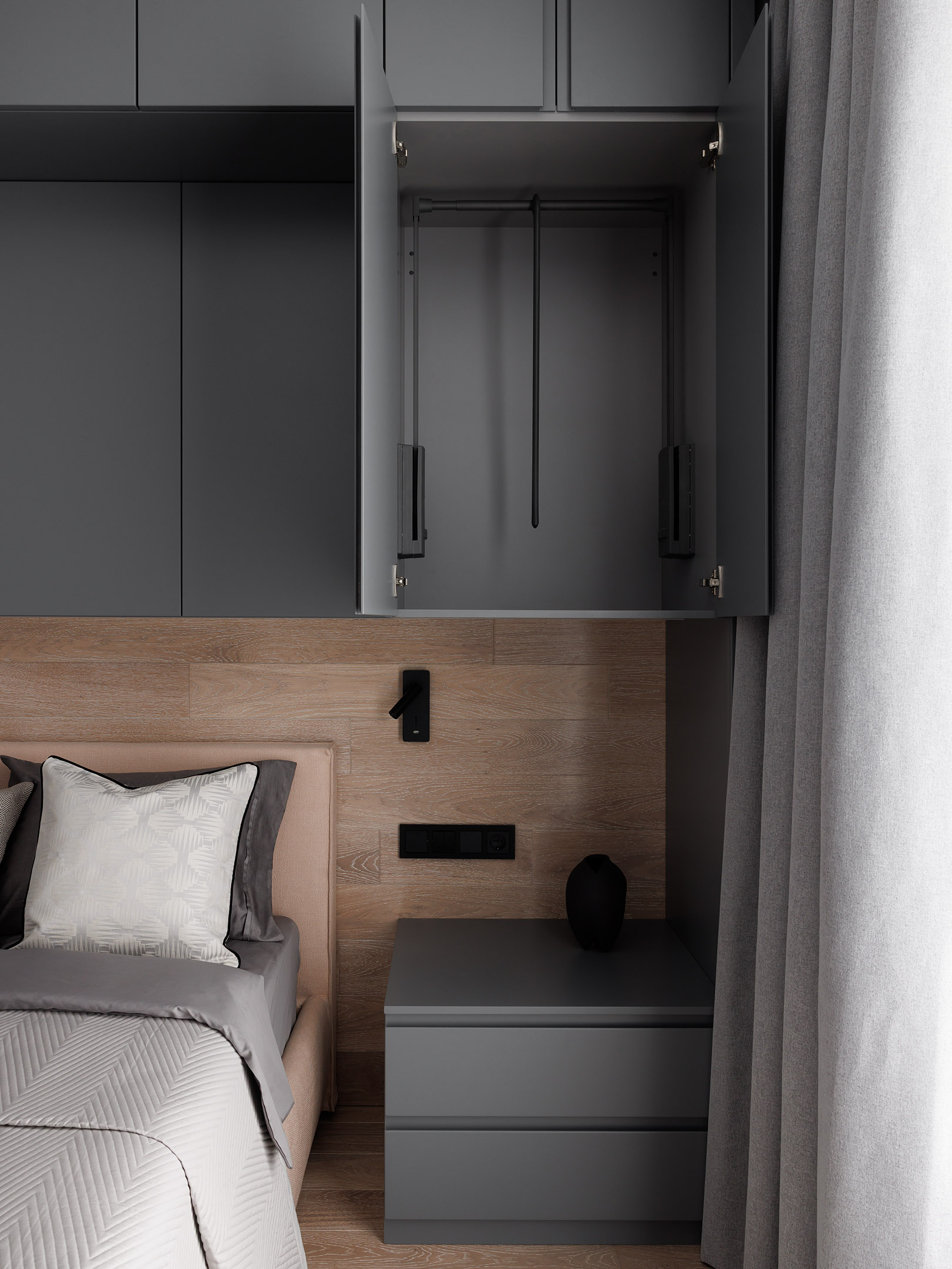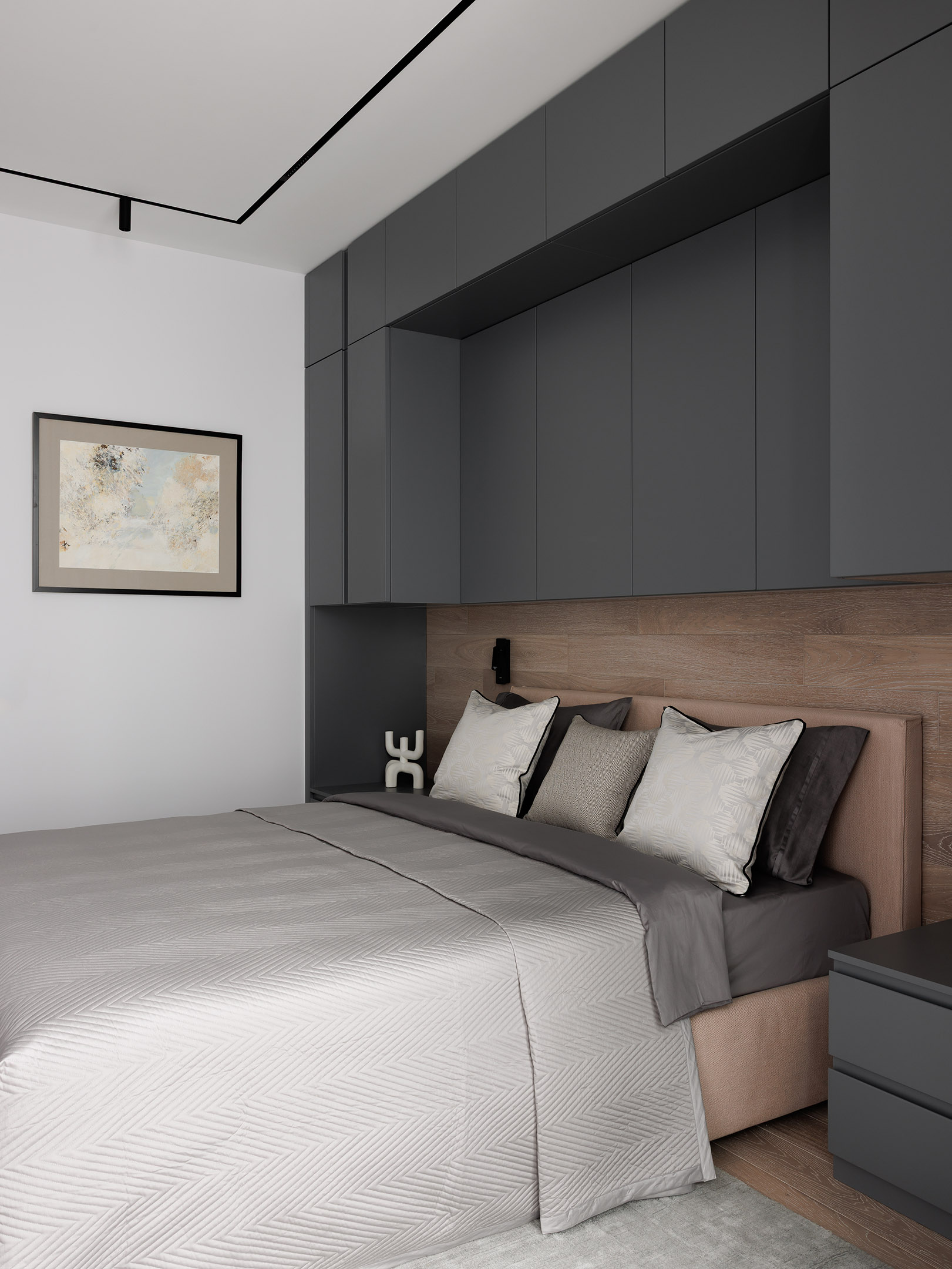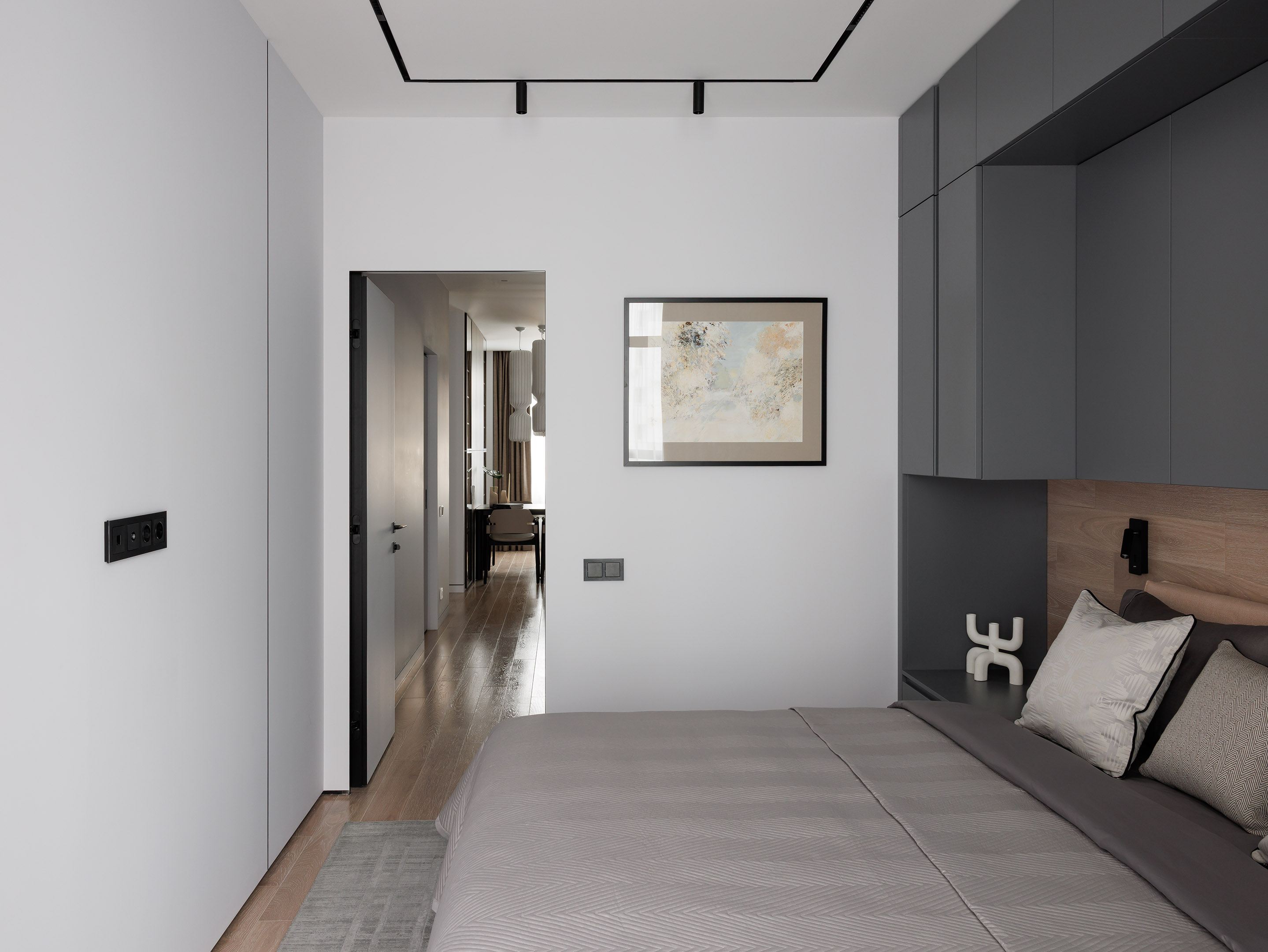 В спальне хозяина выполнена встроенная мебельная композиция вокруг кровати: закрытые шкафы, секции с пантографом, зоны для хранения и прикроватные тумбы — всё в едином стиле и пропорциях. Во второй спальне также наш платяной шкаф в белом цвете.