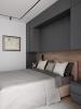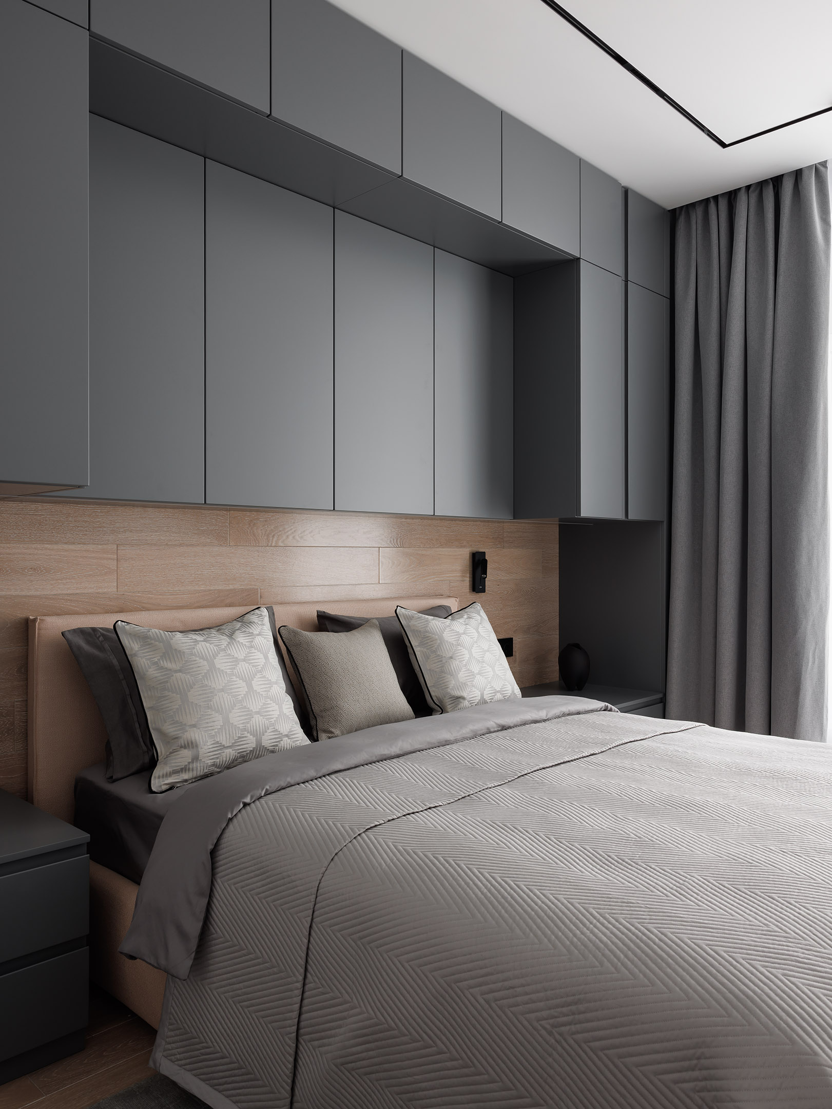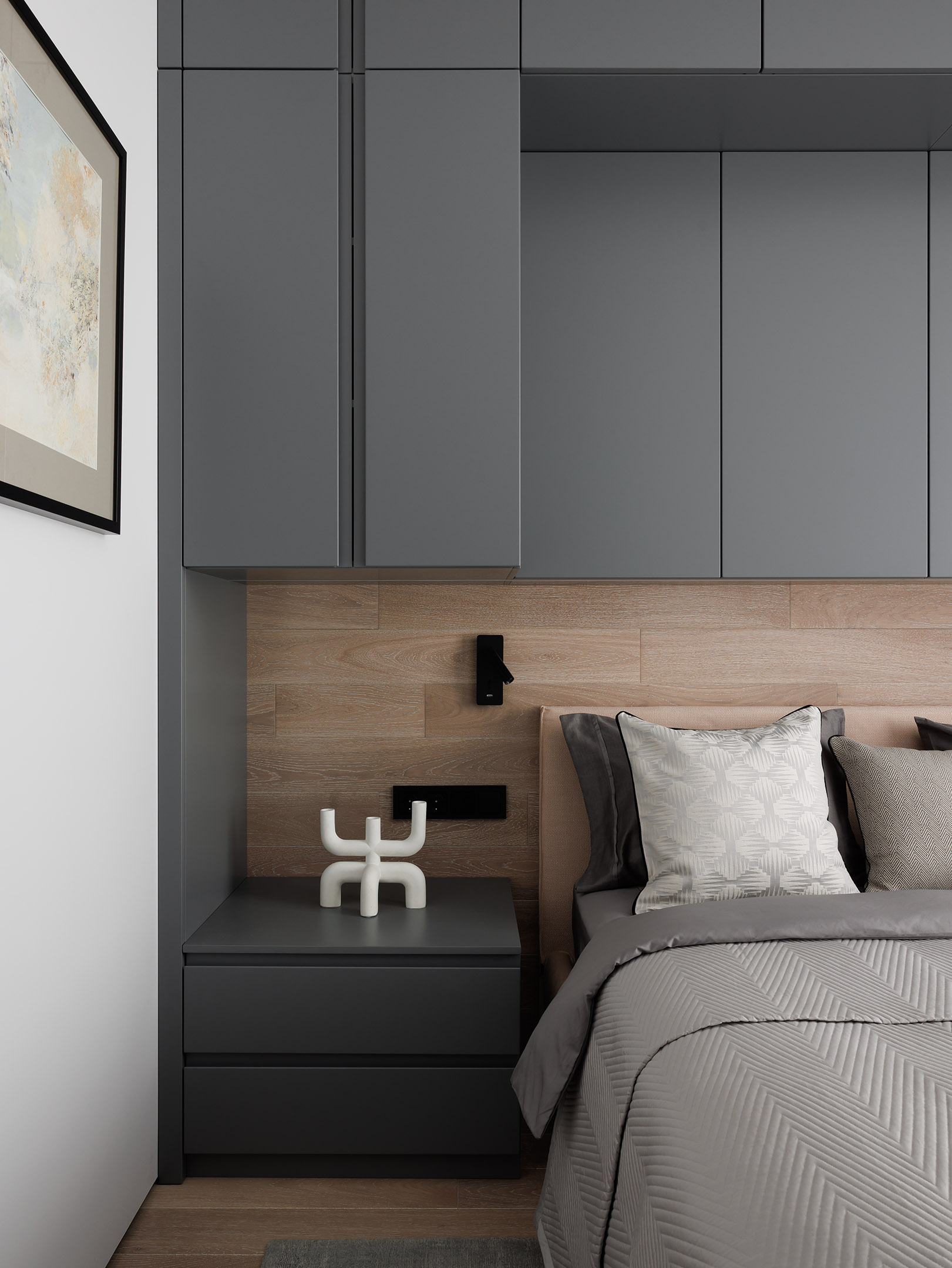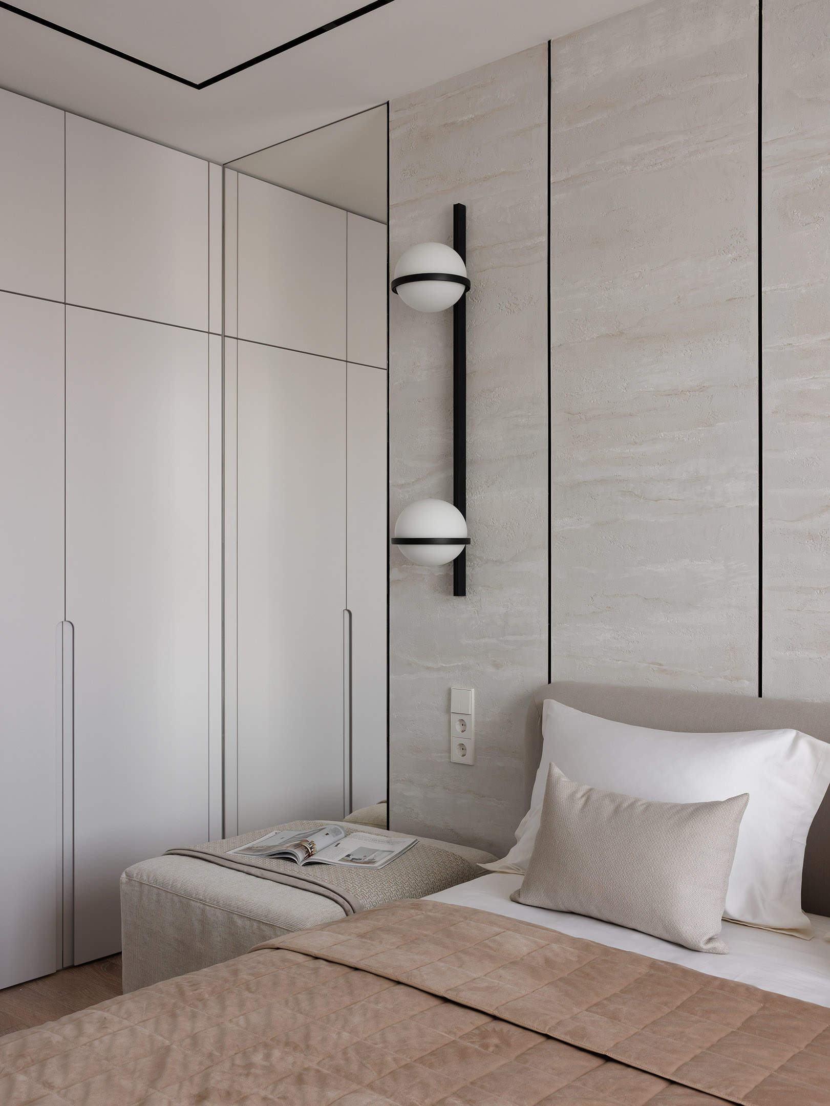 В спальне хозяина выполнена встроенная мебельная композиция вокруг кровати: закрытые шкафы, секции с пантографом, зоны для хранения и прикроватные тумбы — всё в едином стиле и пропорциях. Во второй спальне также наш платяной шкаф в белом цвете.