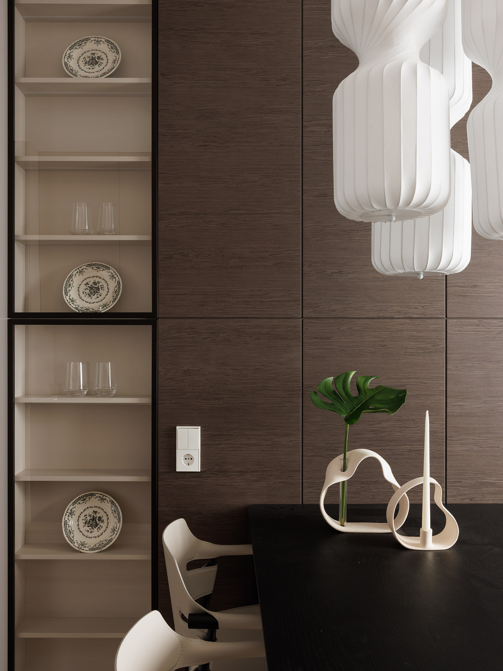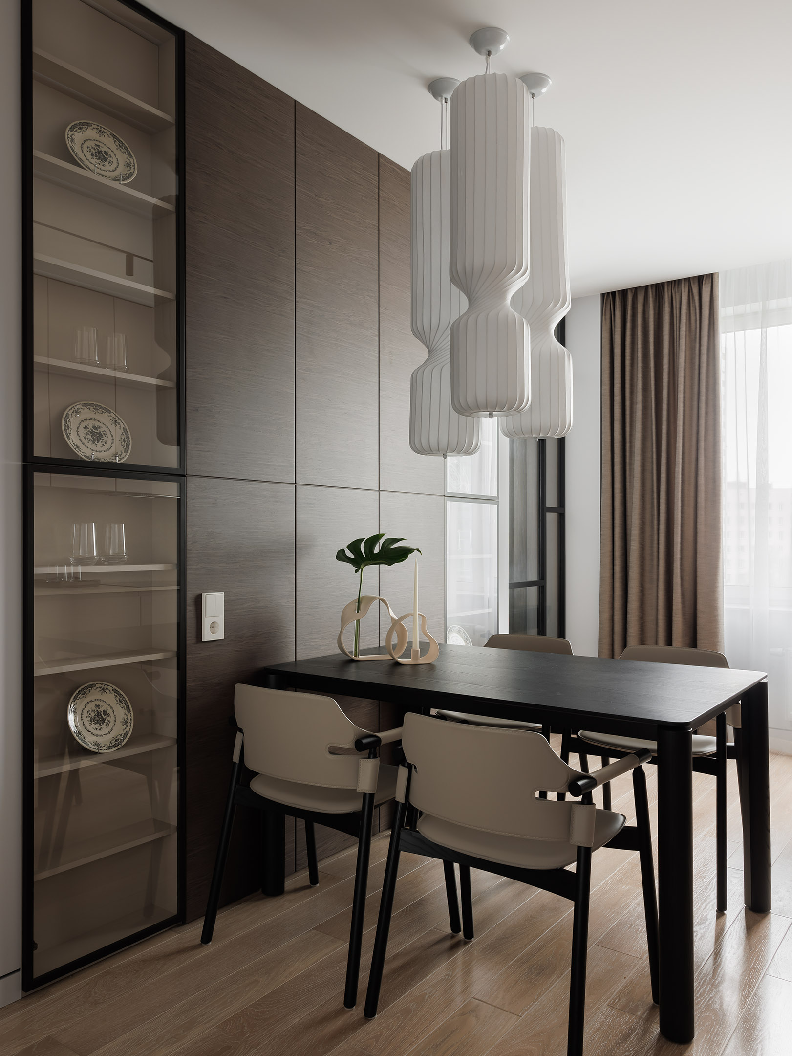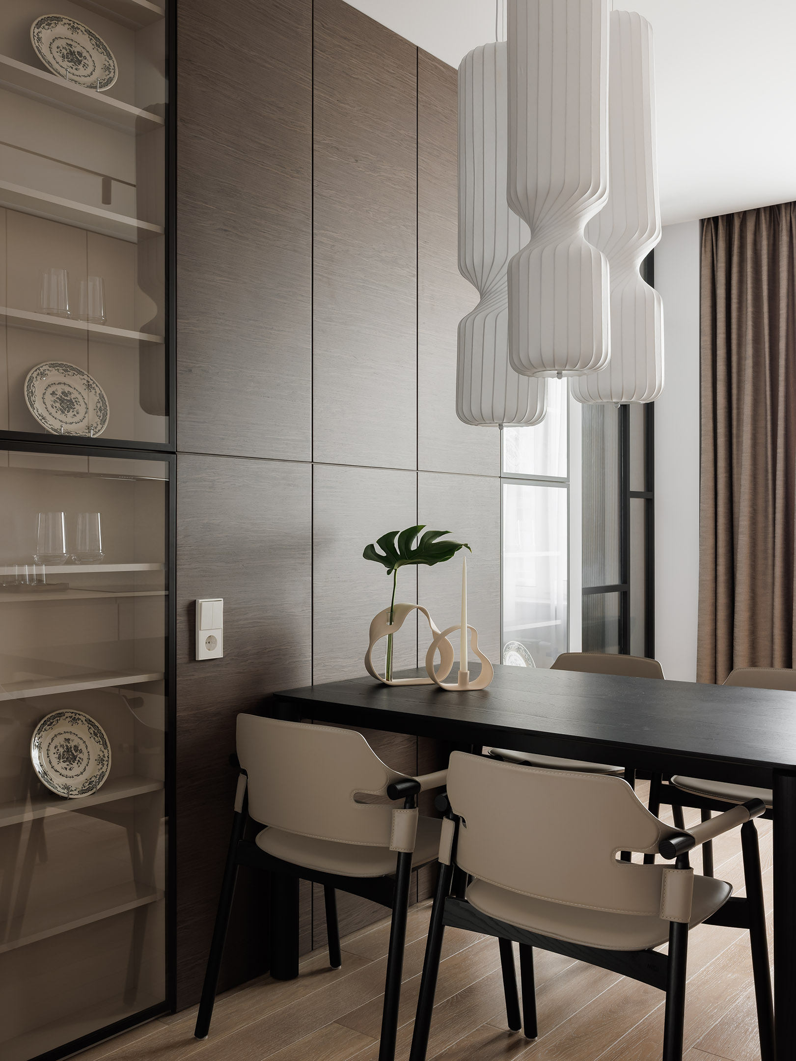 Напротив кухни — две витрины со стеклянными дверцами и встроенной подсветкой. Стена в этой зоне оформлена панелями в том же шпоне, что и кухонные фасады, благодаря чему пространство выглядит цельным и продуманным.