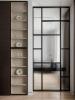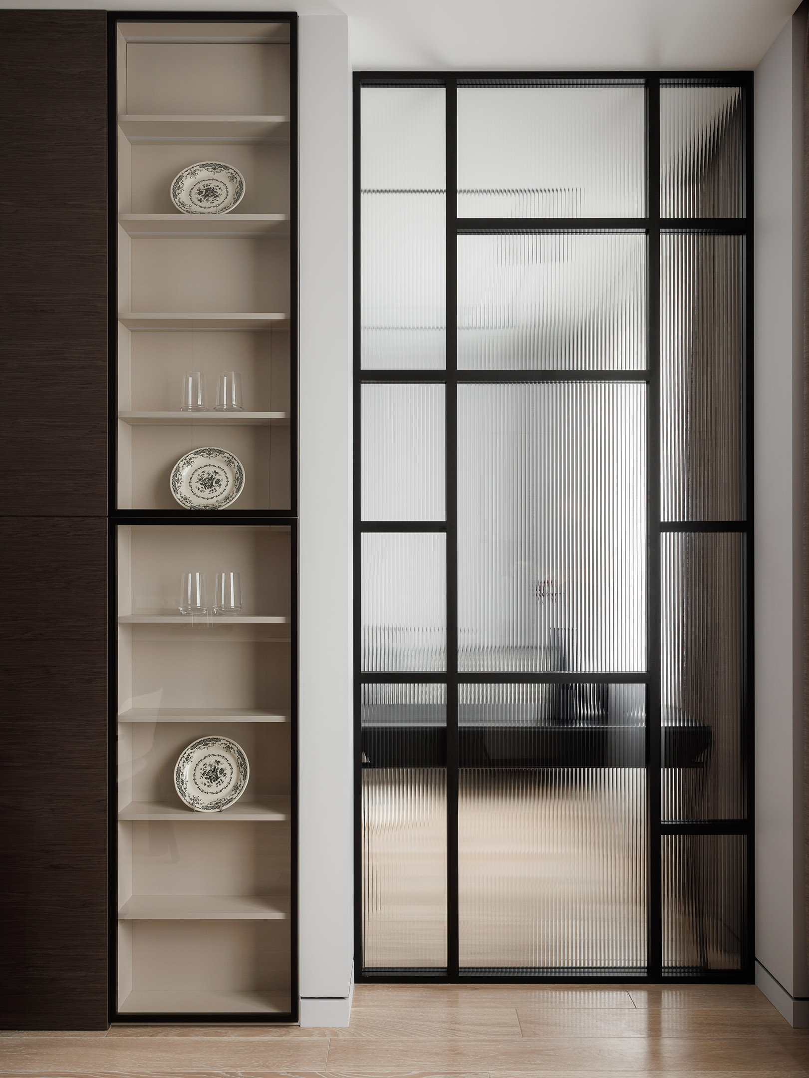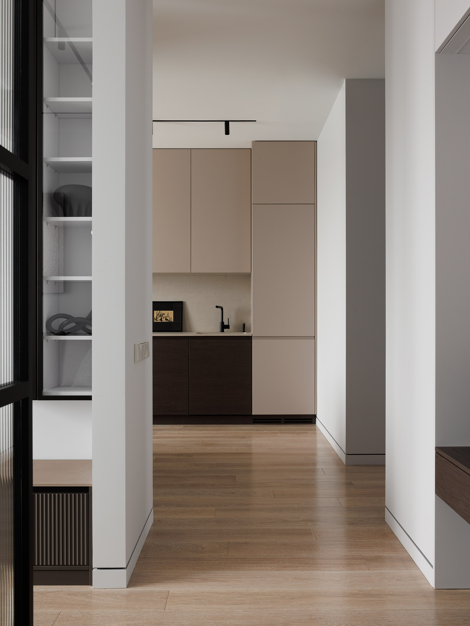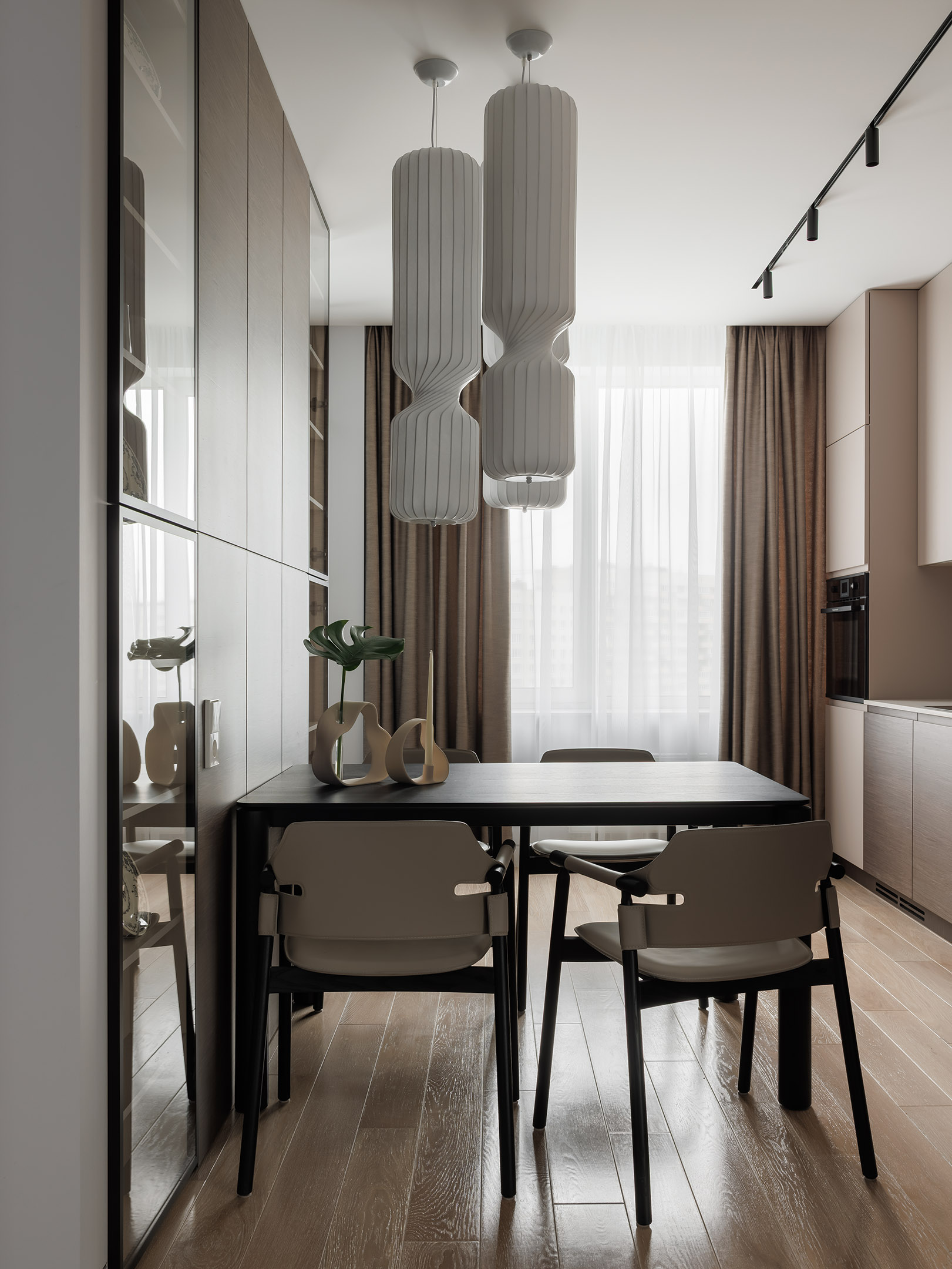 Напротив кухни — две витрины со стеклянными дверцами и встроенной подсветкой. Стена в этой зоне оформлена панелями в том же шпоне, что и кухонные фасады, благодаря чему пространство выглядит цельным и продуманным.