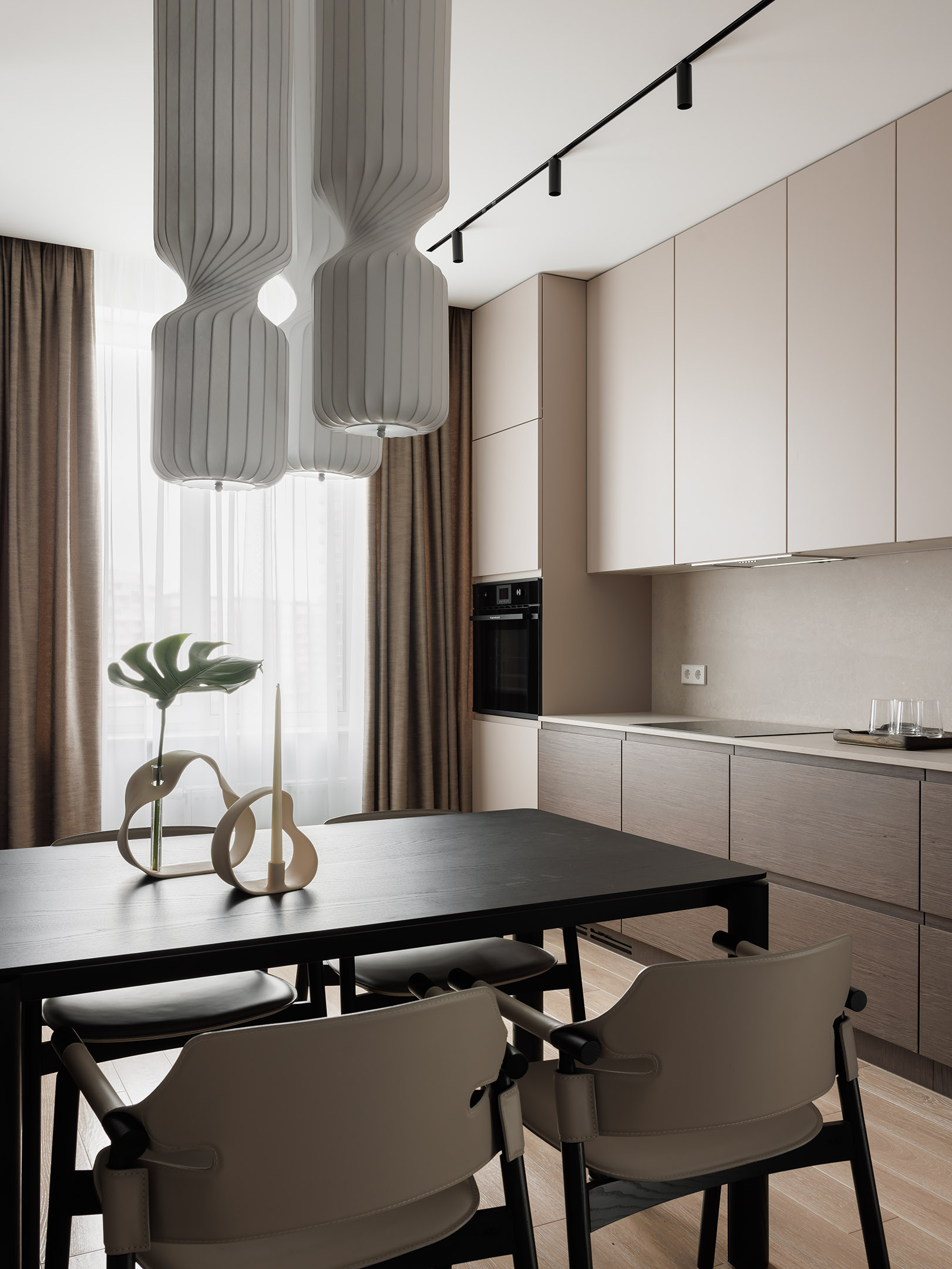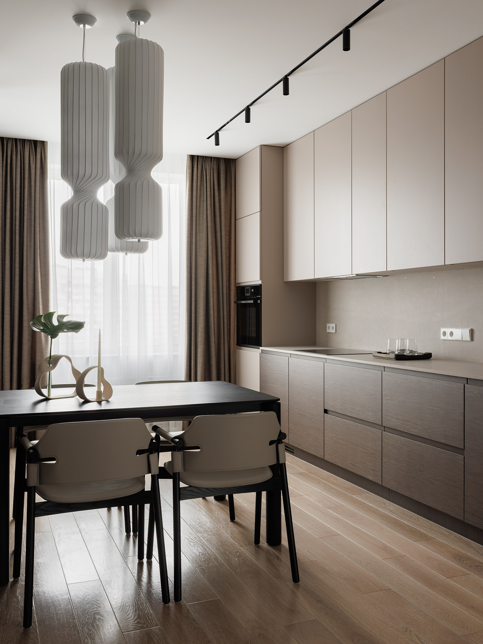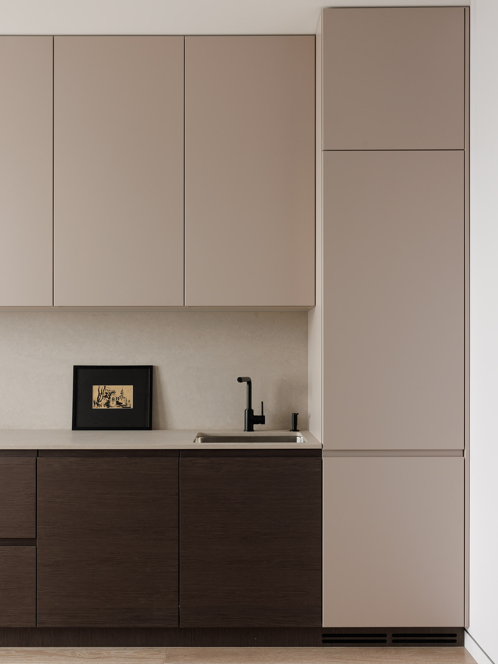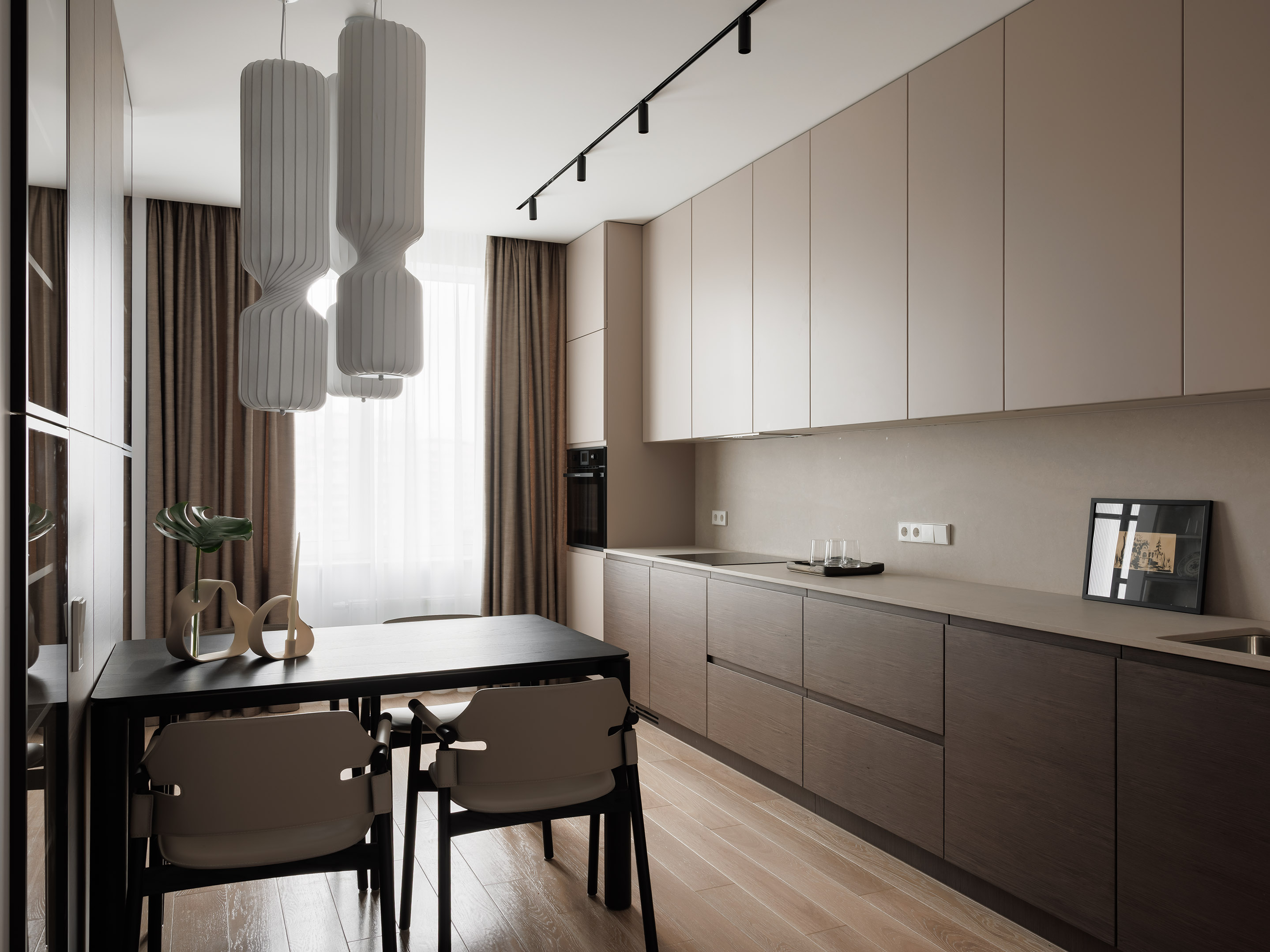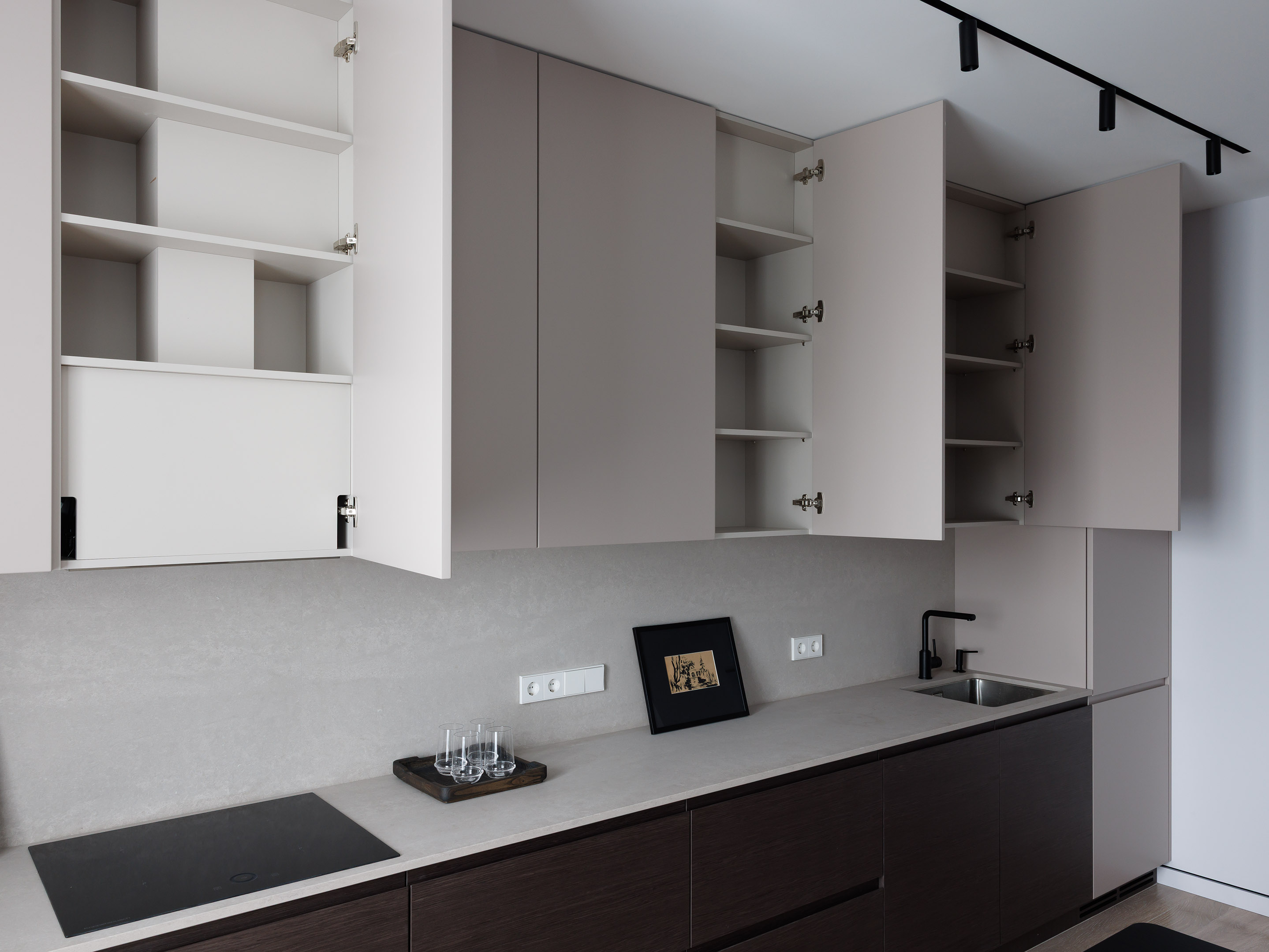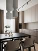 В центре проекта — современная кухня со скрытыми ручками. Отделка выполнена реконструированным шпоном, тонированным в оттенок, согласованный с дизайн-проектом. Нижний ярус — в шпоне, верхние фасады — в матовой эмали. Одной из технических особенностей стало скрытое решение для прокладки гофры от варочной панели к вентканалу — аккуратно интегрированный канал, незаметный в готовом интерьере.