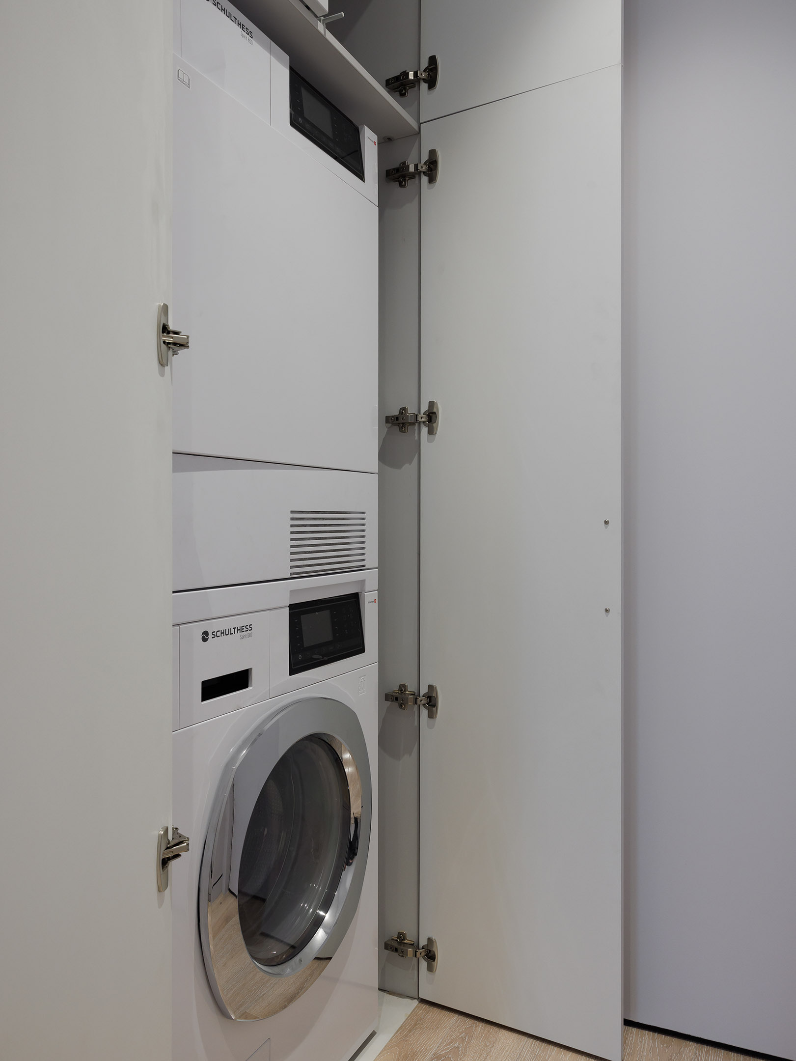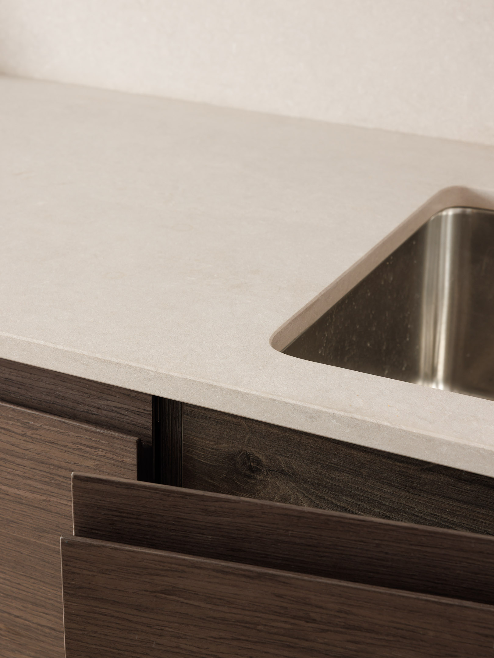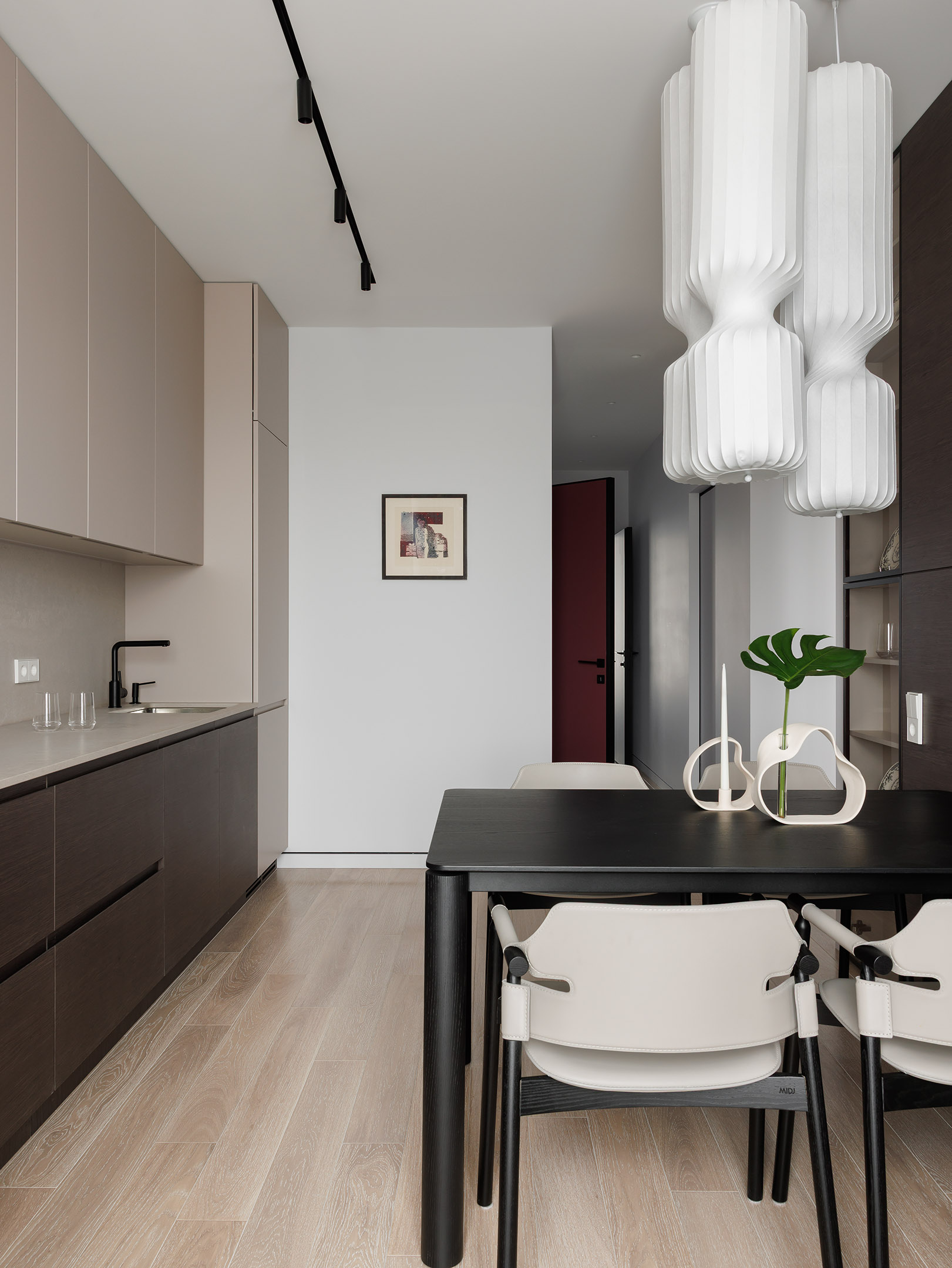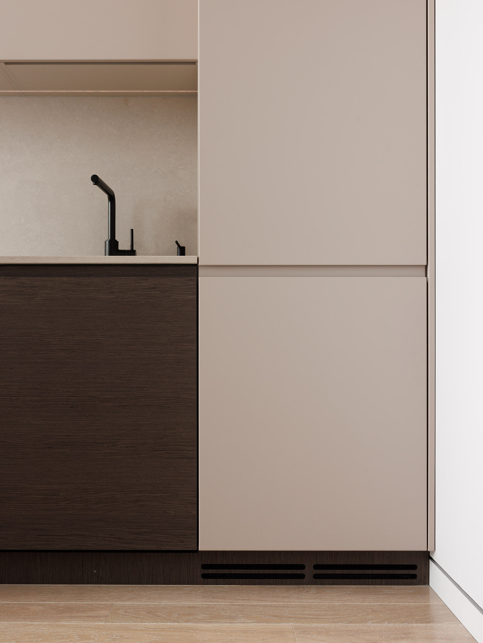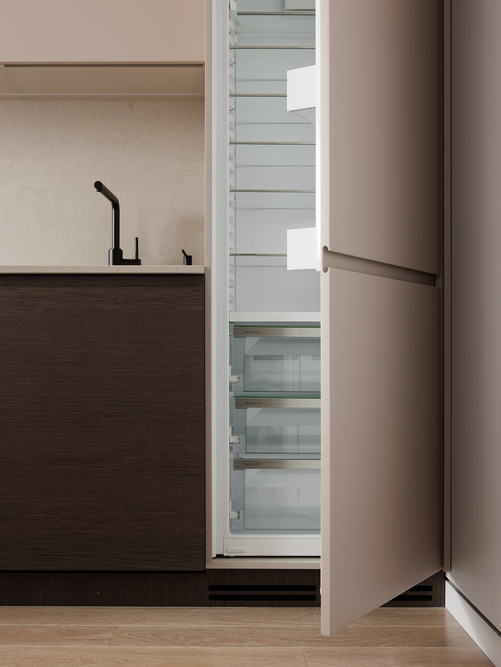 В центре проекта — современная кухня со скрытыми ручками. Отделка выполнена реконструированным шпоном, тонированным в оттенок, согласованный с дизайн-проектом. Нижний ярус — в шпоне, верхние фасады — в матовой эмали. Одной из технических особенностей стало скрытое решение для прокладки гофры от варочной панели к вентканалу — аккуратно интегрированный канал, незаметный в готовом интерьере.