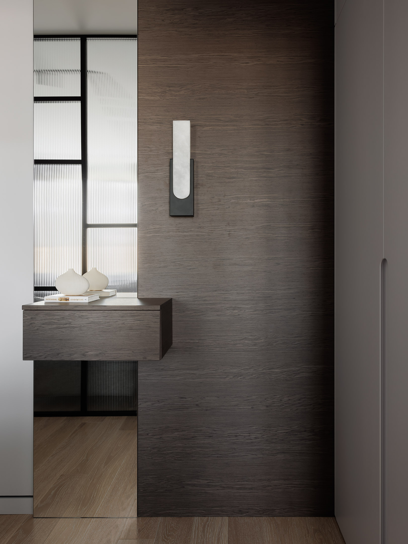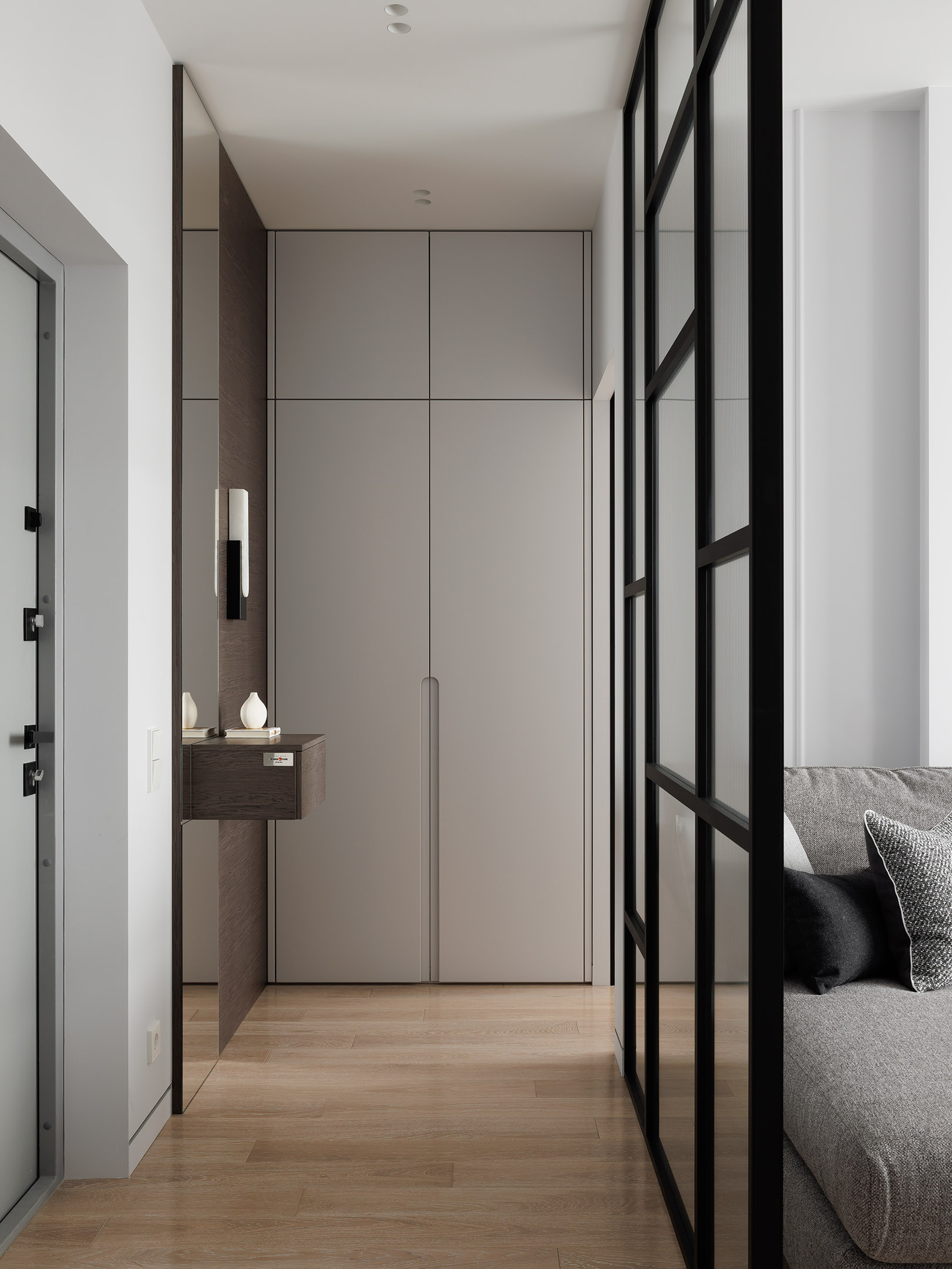 В прихожей мы изготовили платяной шкаф и открытую зону хранения на крючках. Рядом — подвесная тумба-консоль в комплекте с зеркалом и стеновой панелью в шпоне.