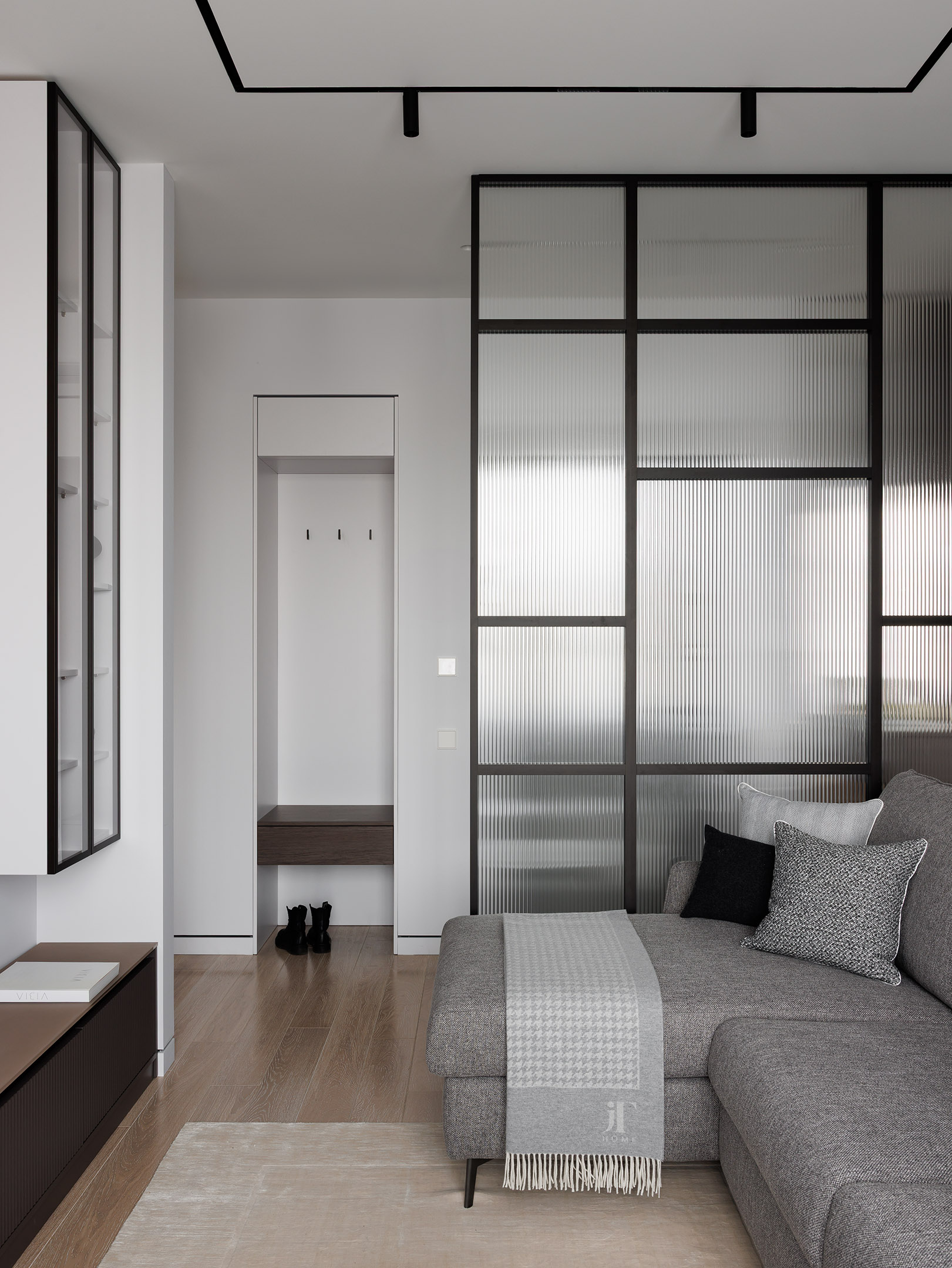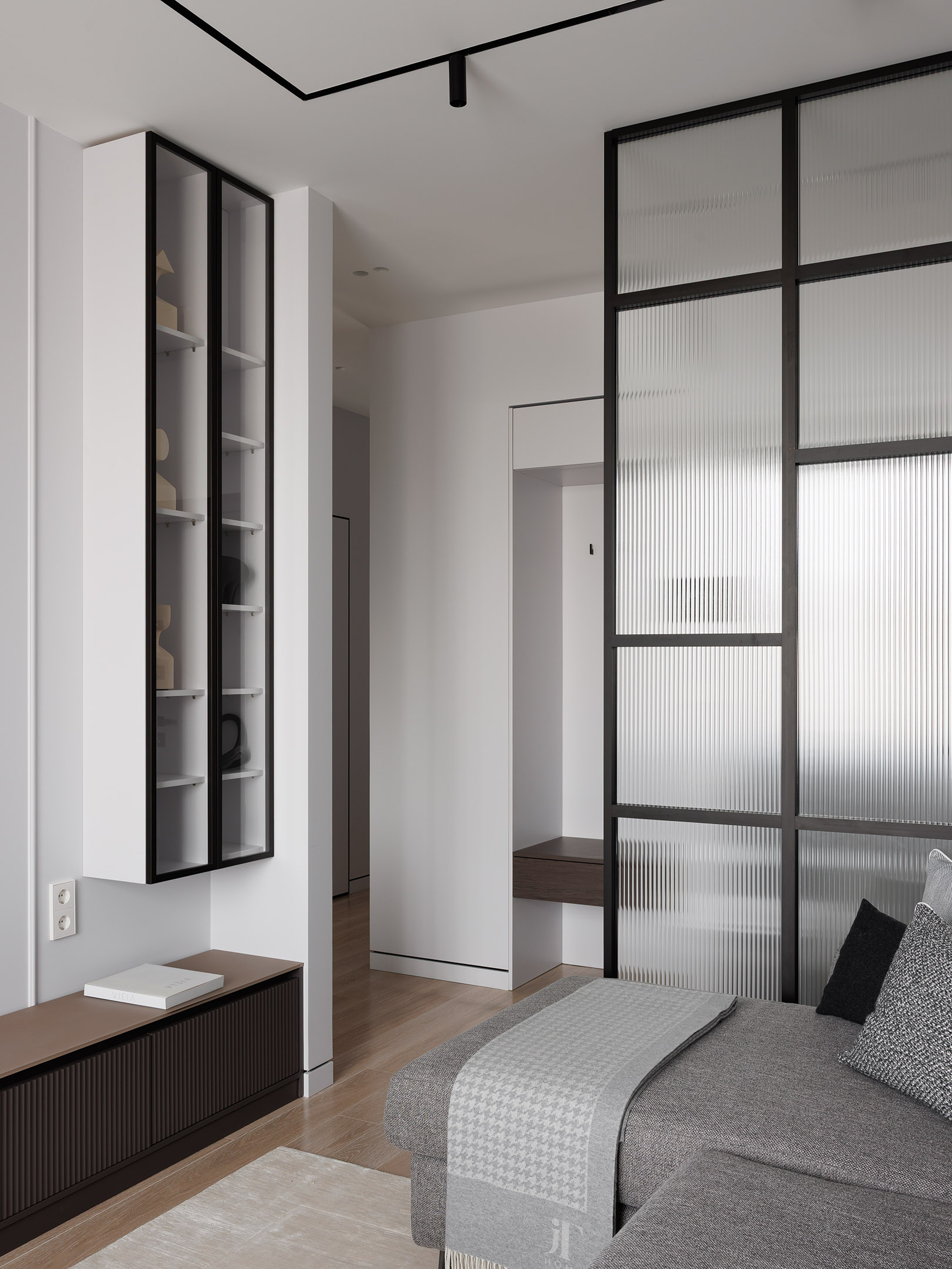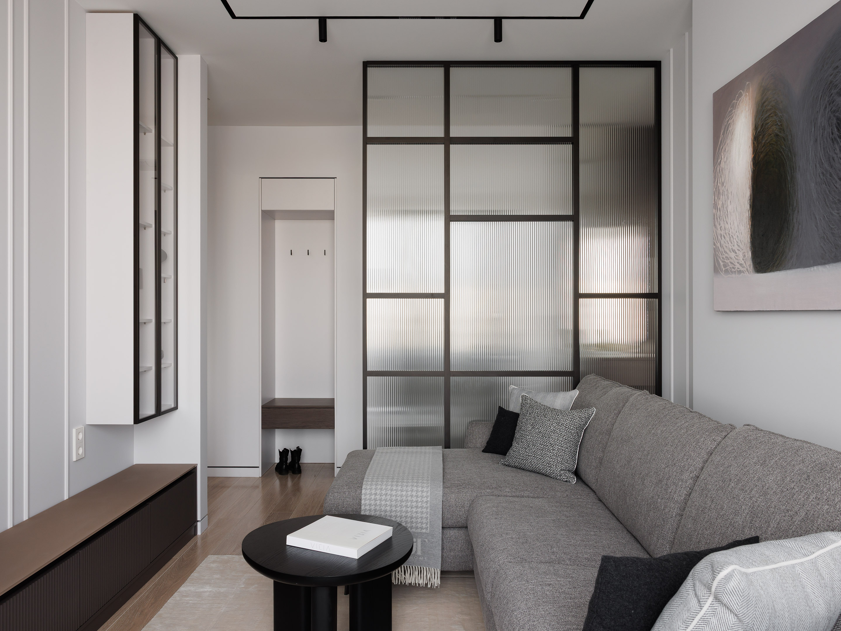 В гостиной — наша тумба под телевизором с рифлёными фасадами и матовой стеклянной столешницей, а также подвесная витрина с подсветкой.