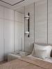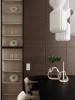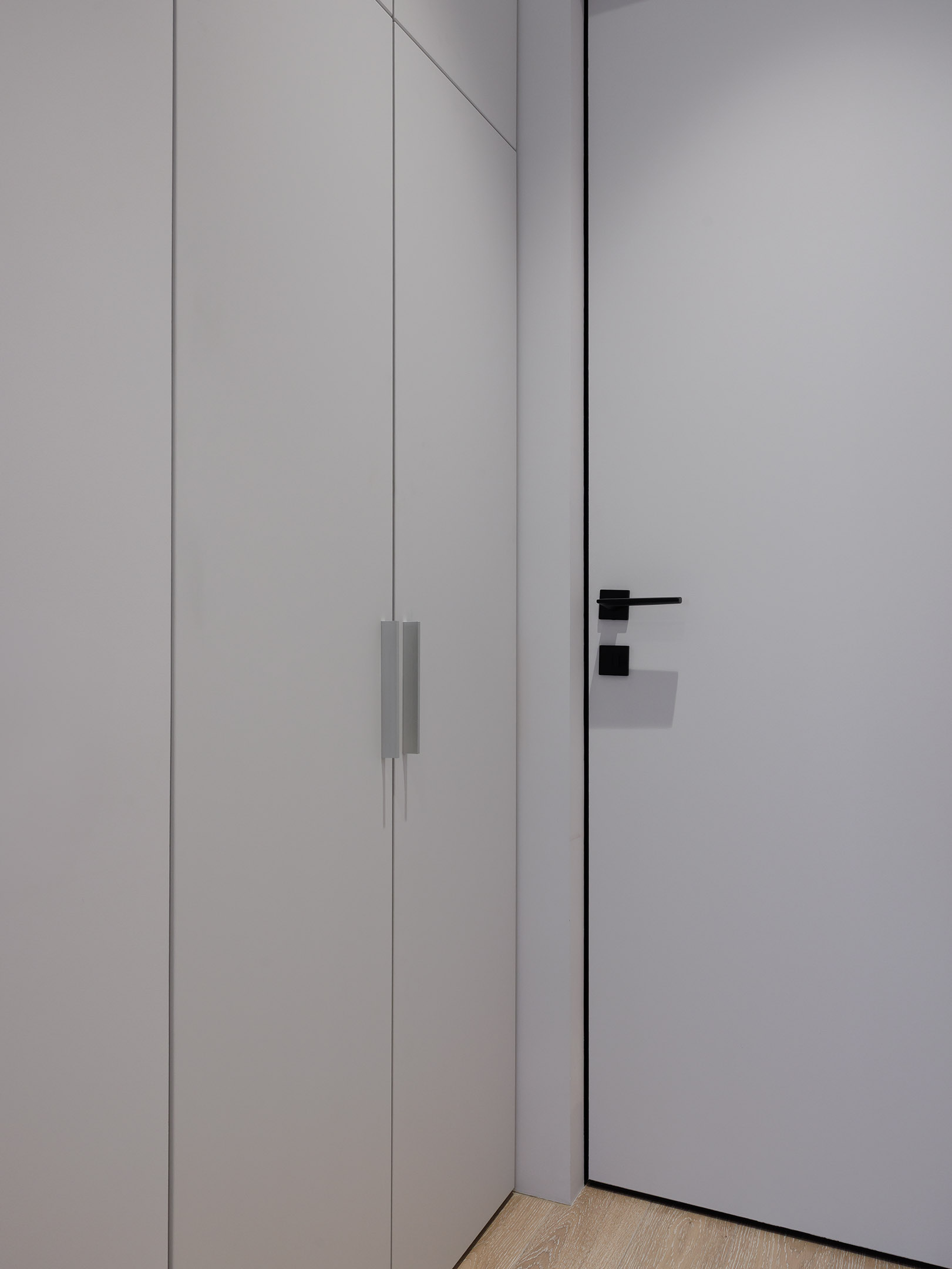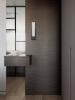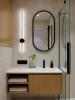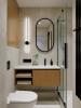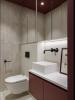 Мы также изготовили мебель для ванной комнаты и санузла. Помимо подвесных тумб, здесь предусмотрены закрытые системы хранения: в одном помещении — двери с зеркальным полотном, в другом — фасады в шпоне.