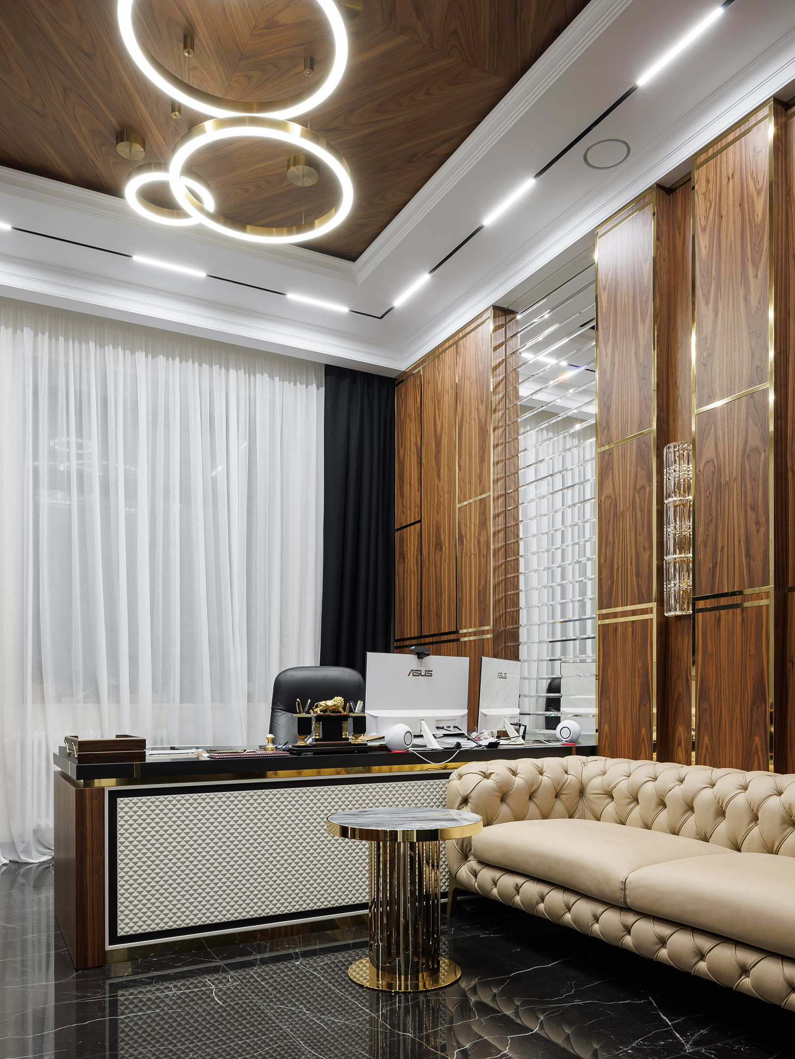 Центральный блок решён более монументально: крупные панели со шпоном и металлической графикой создают акцент и визуально собирают всю композицию. Такое решение позволяет кабинету выглядеть цельно и статусно, не перегружая пространство лишними деталями.