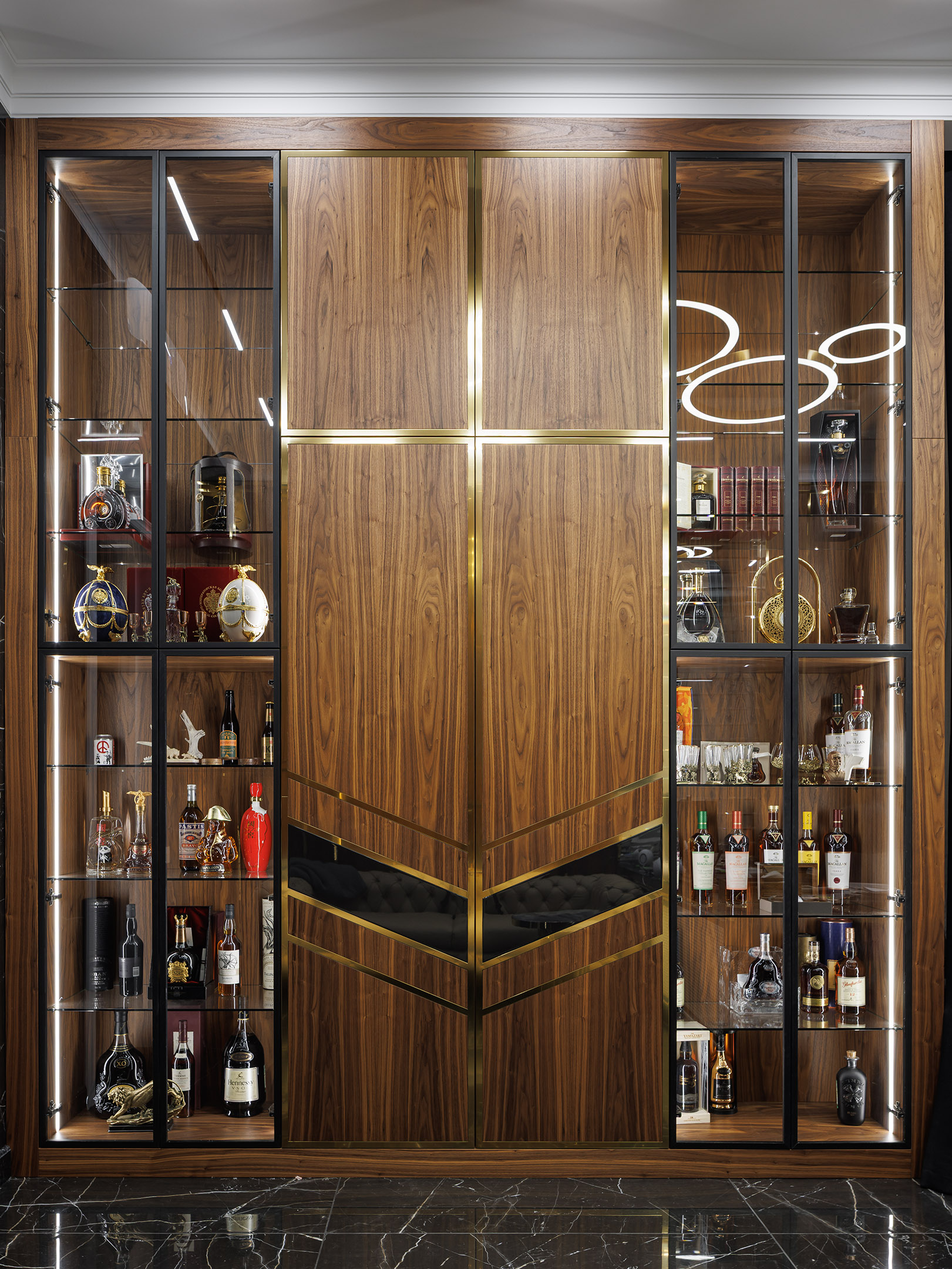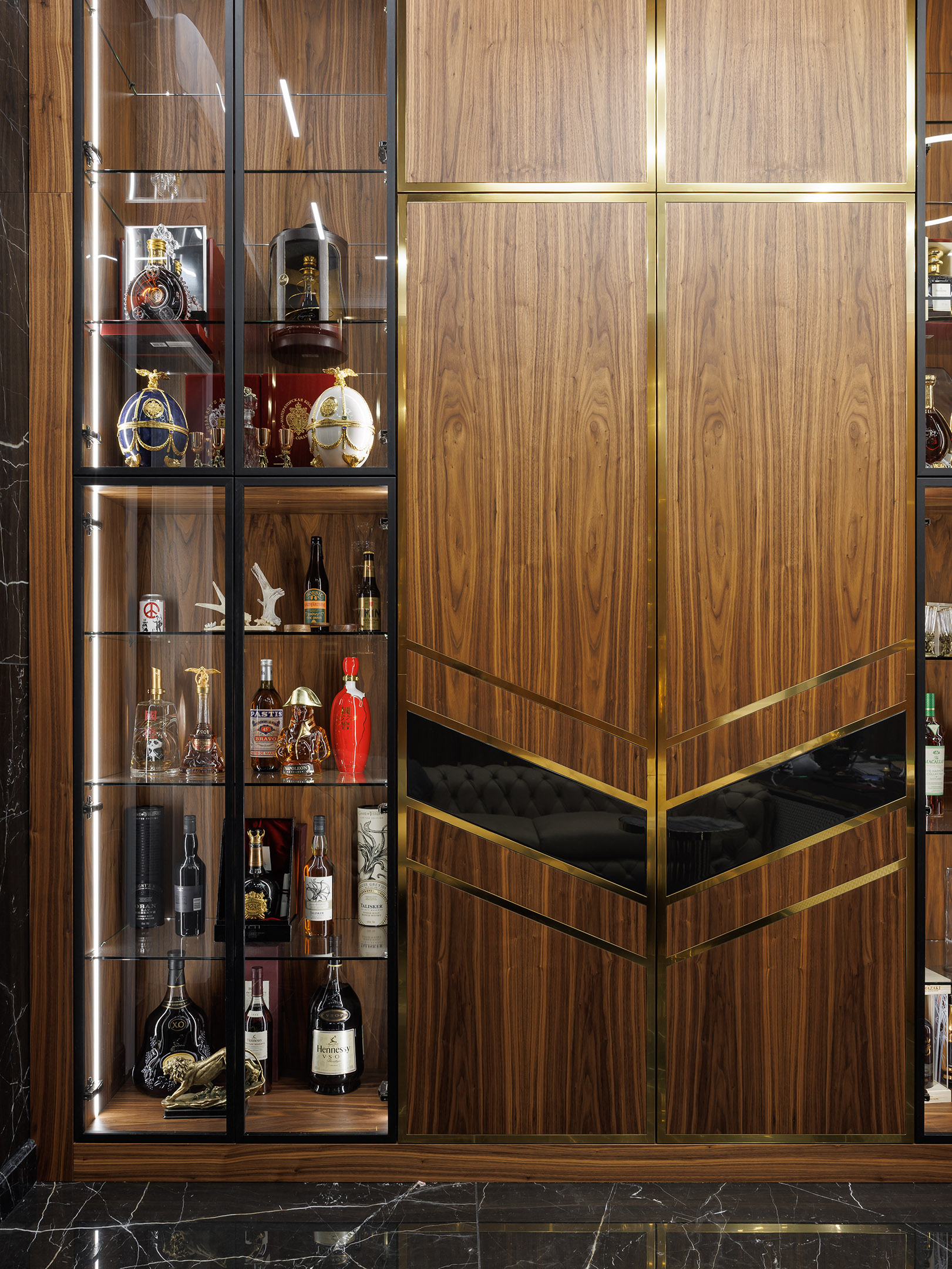 В основе композиции — сочетание натурального шпона с выразительной текстурой и металлических элементов с тёплым золотистым оттенком. Вертикальные панели формируют архитектуру пространства и задают ритм всей стене, одновременно выполняя декоративную и функциональную роль. Часть объёма занимает витринная зона со стеклянными фасадами и внутренней подсветкой — она предназначена для хранения коллекций и предметов, которые становятся частью интерьера.