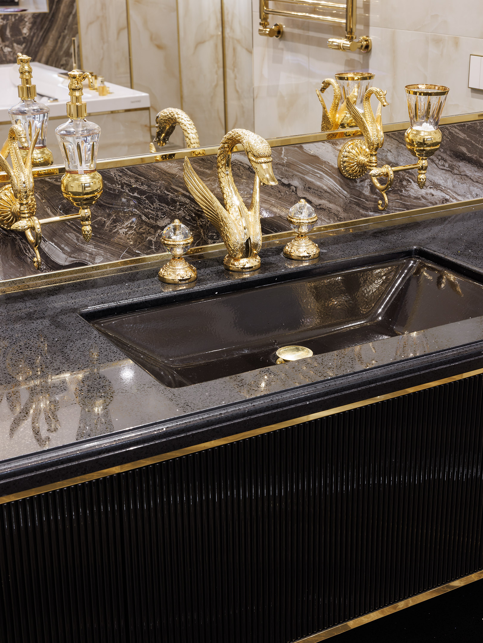 На первый взгляд здесь работает выразительное сочетание материалов — тёмный камень, тёплый золотистый металл и фактурные фасады. Но значительная часть работы скрыта в самой конструкции мебели.
