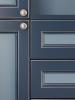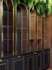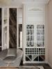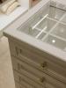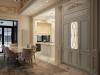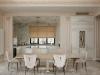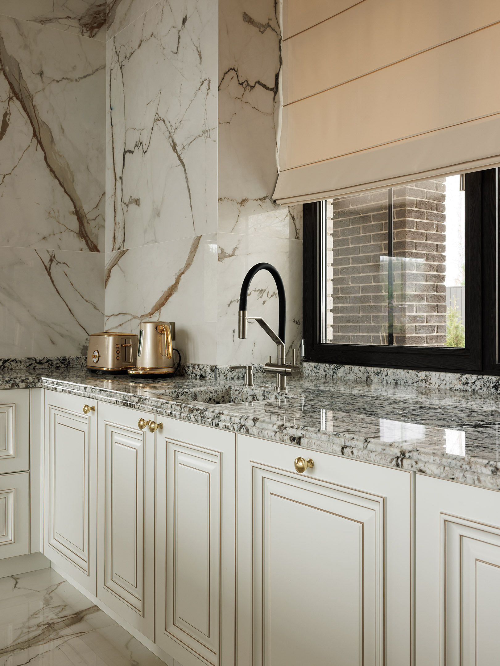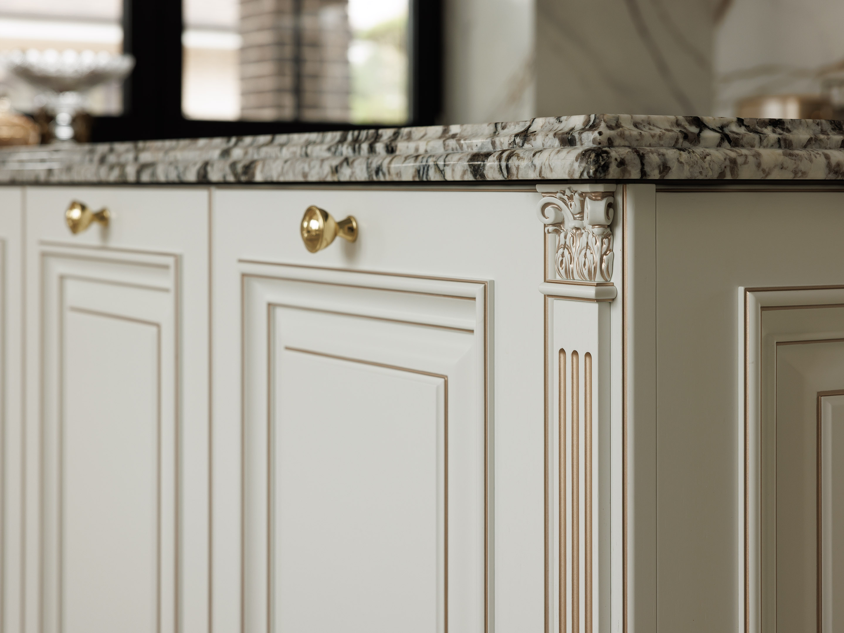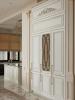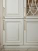 Классическая кухня П-образной формы с островом выполнена без верхних шкафов — их функцию заменяет отдельная кладовая. Композицию дополняют витринные шкафы в классическом стиле и пенальная группа для хранения винной коллекции.
