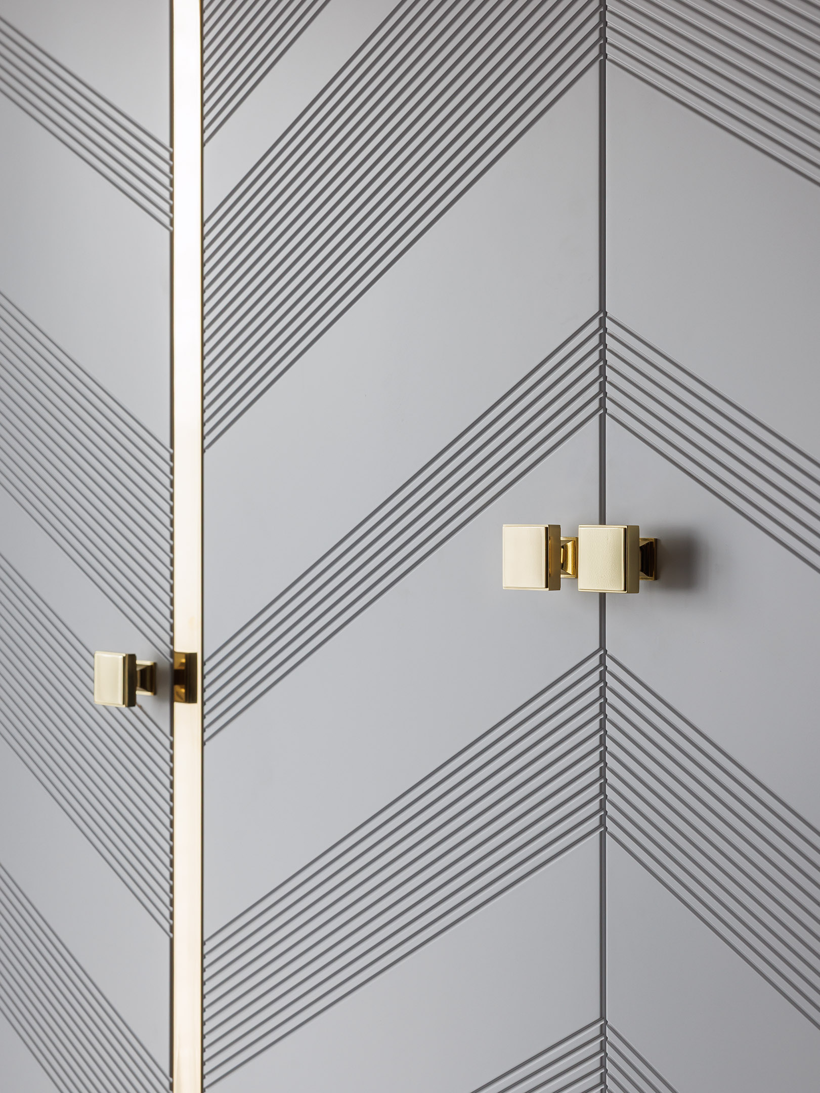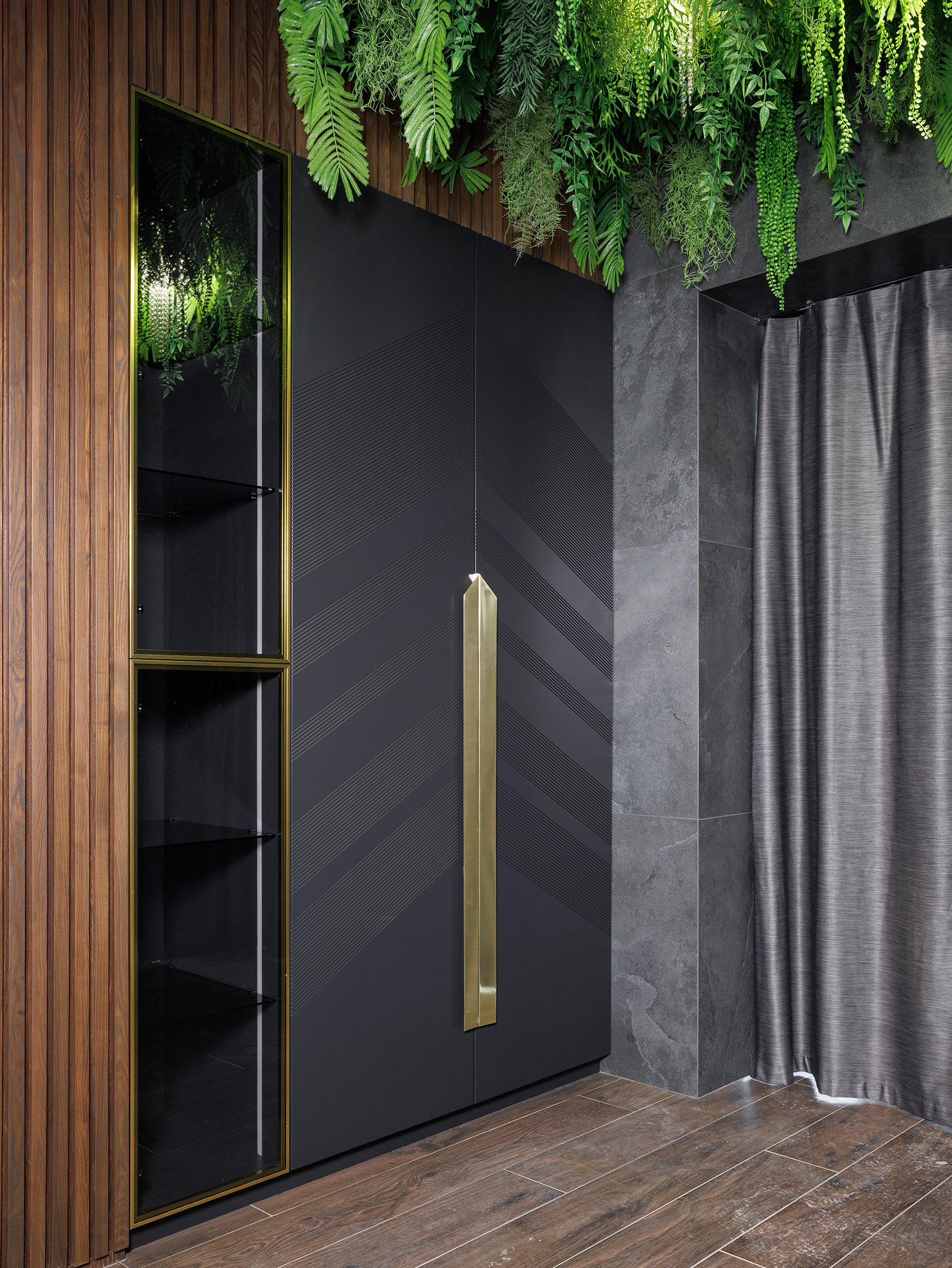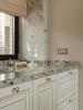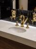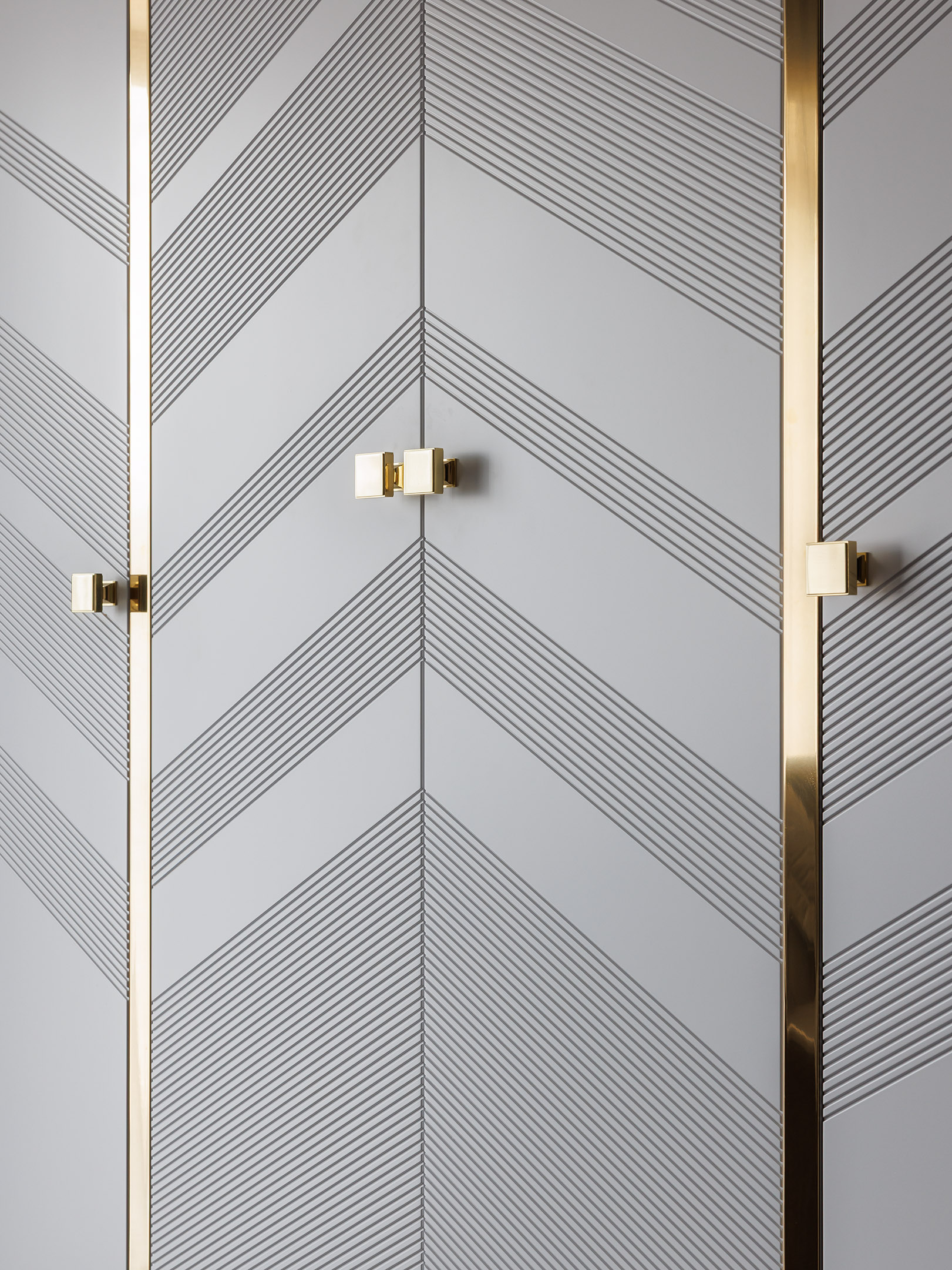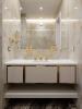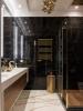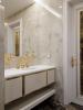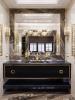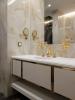 Ванные комнаты оформлены подвесными тумбами с эксклюзивными фасадами. В отделке использованы декоративные металлические элементы в золотистом тоне, подчёркивающие статусность интерьера.