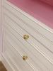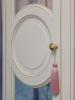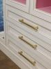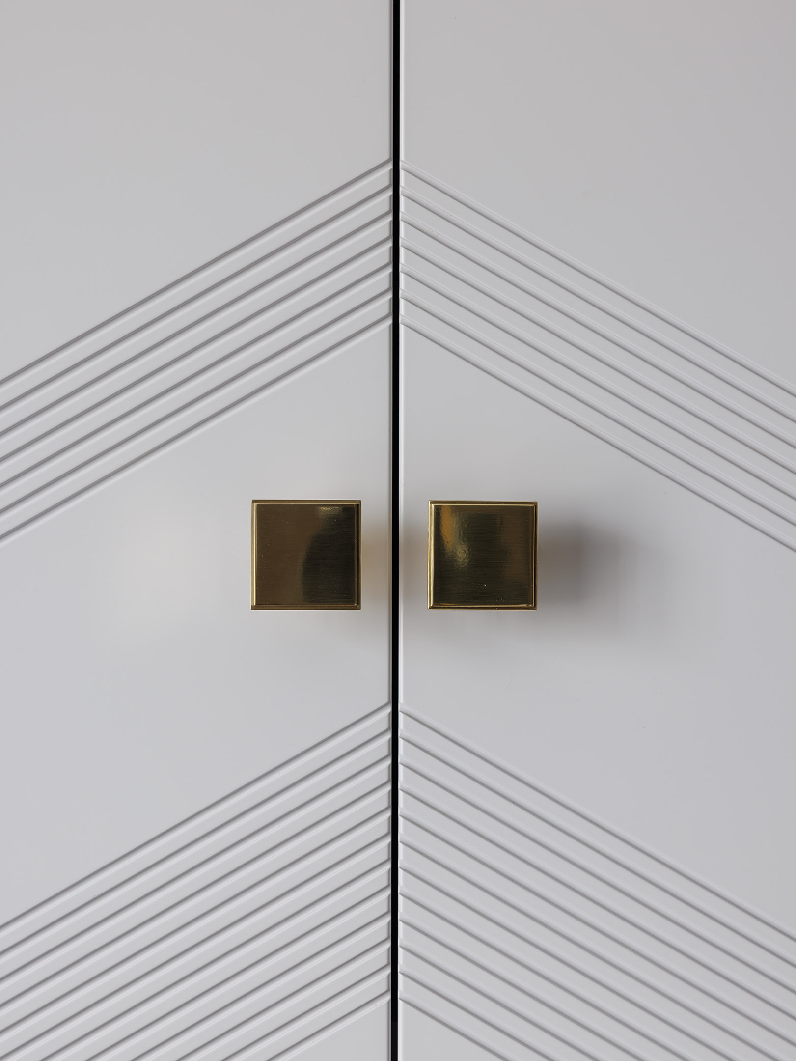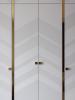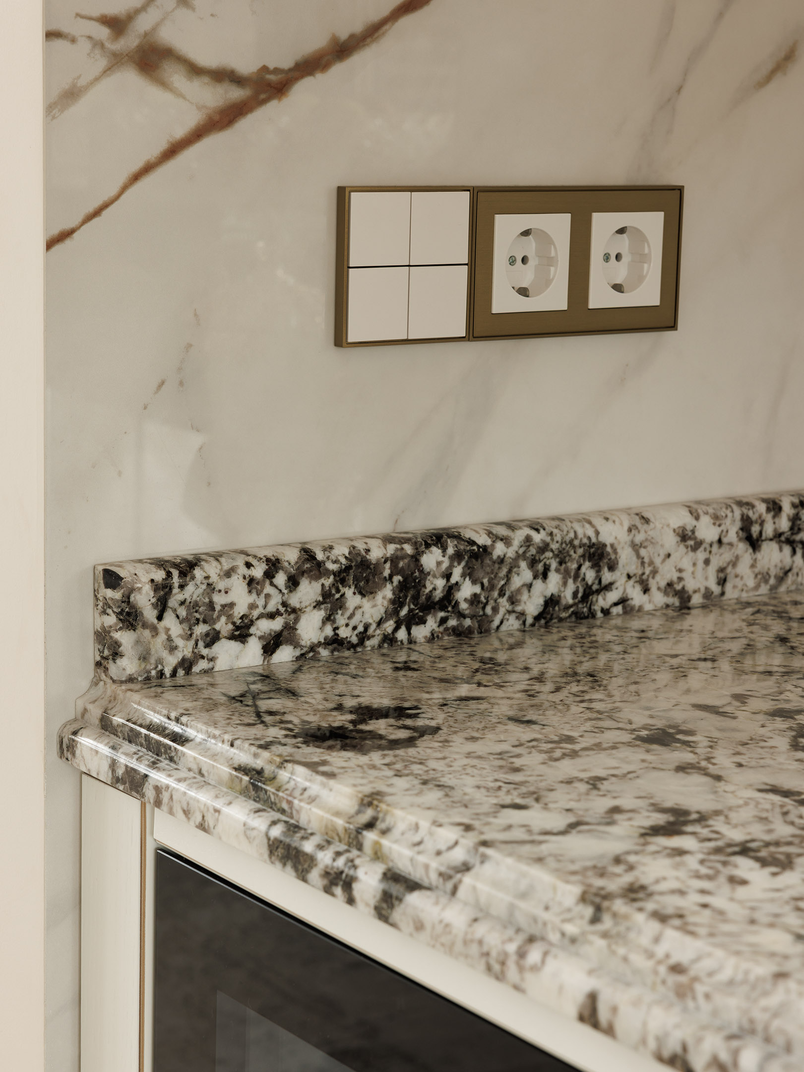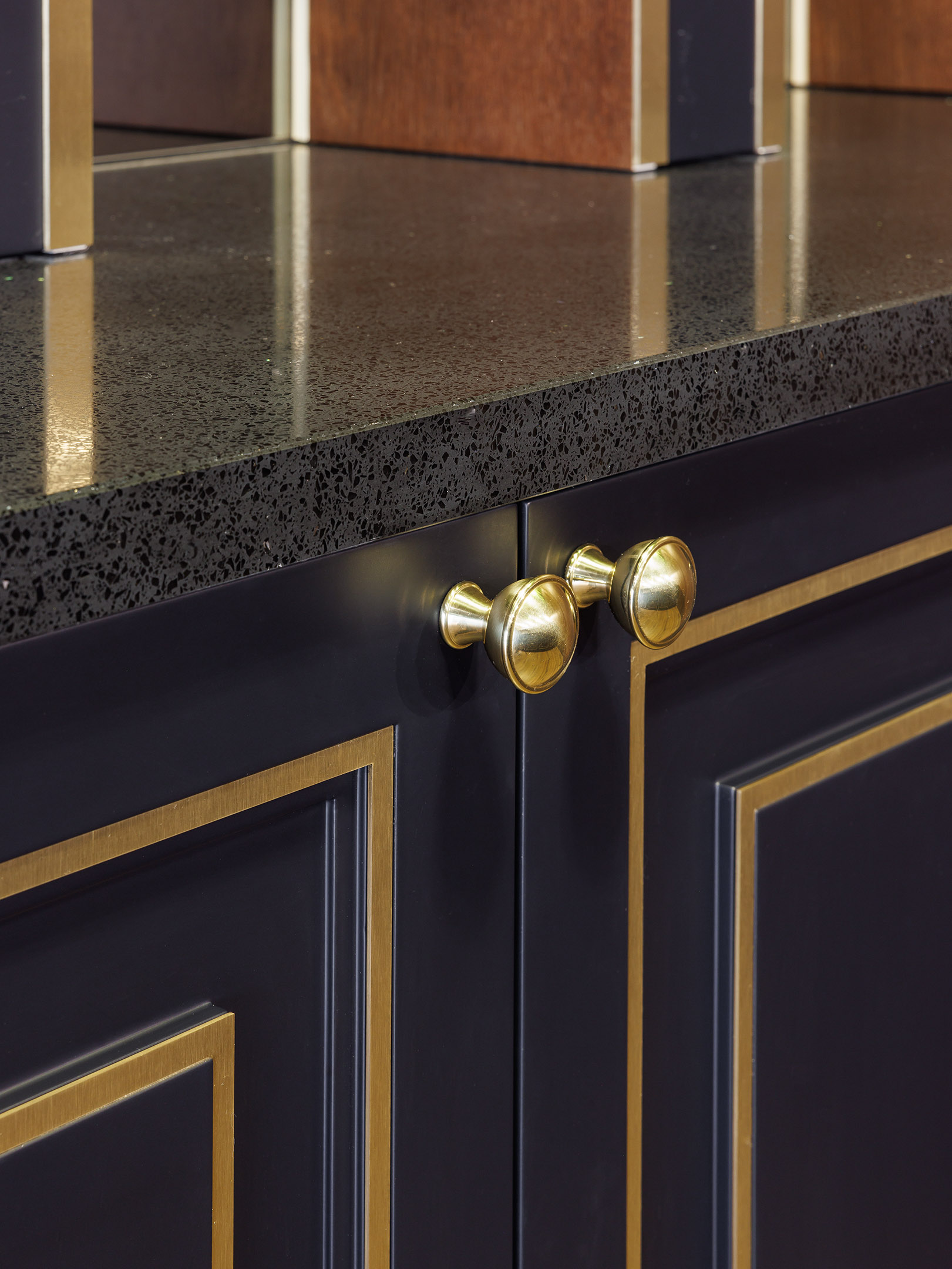 Ванные комнаты оформлены подвесными тумбами с эксклюзивными фасадами. В отделке использованы декоративные металлические элементы в золотистом тоне, подчёркивающие статусность интерьера.