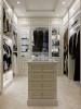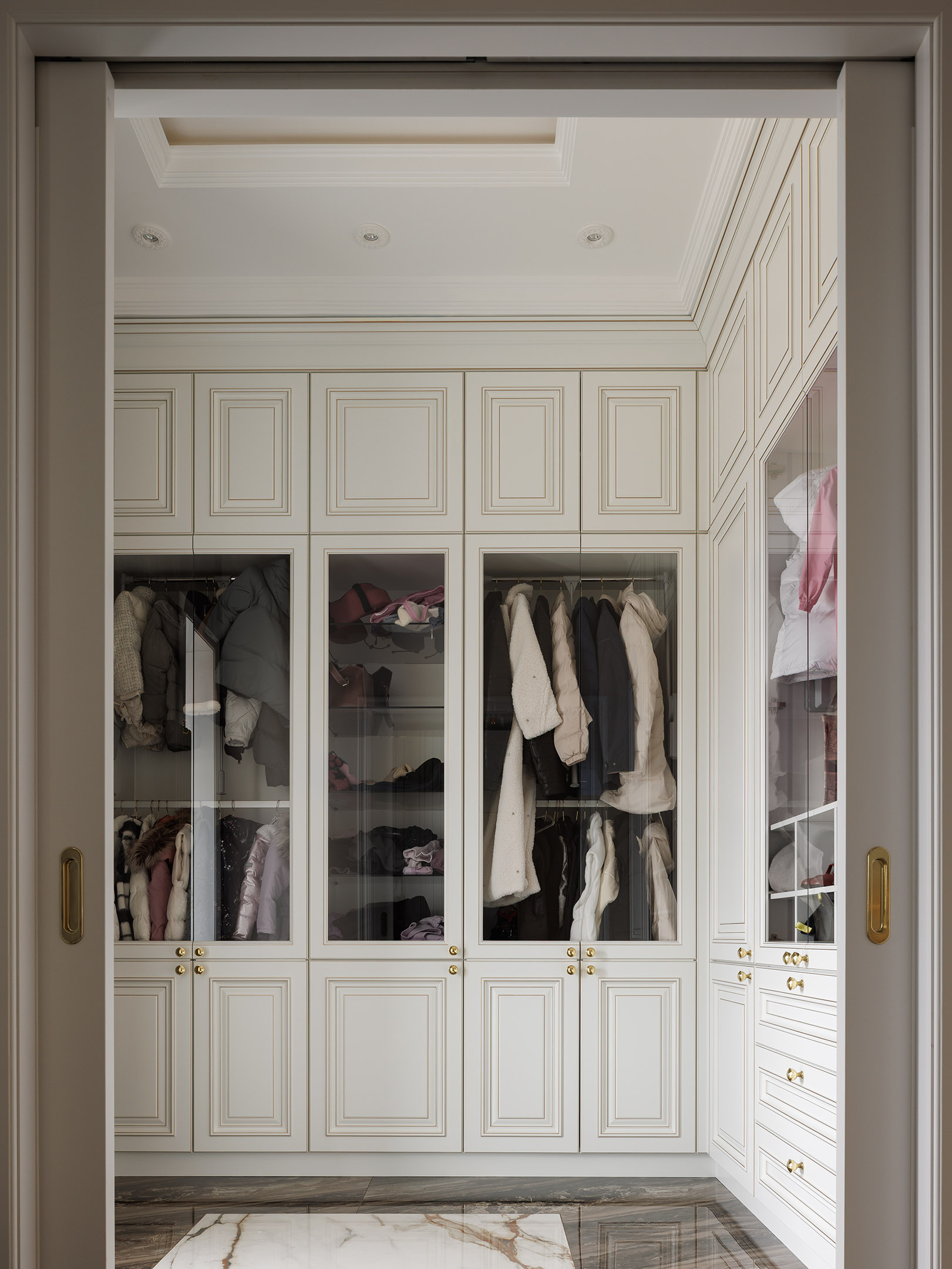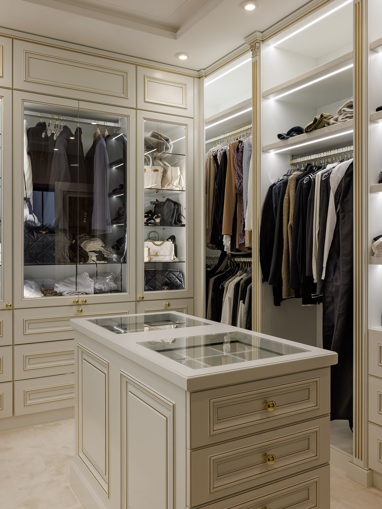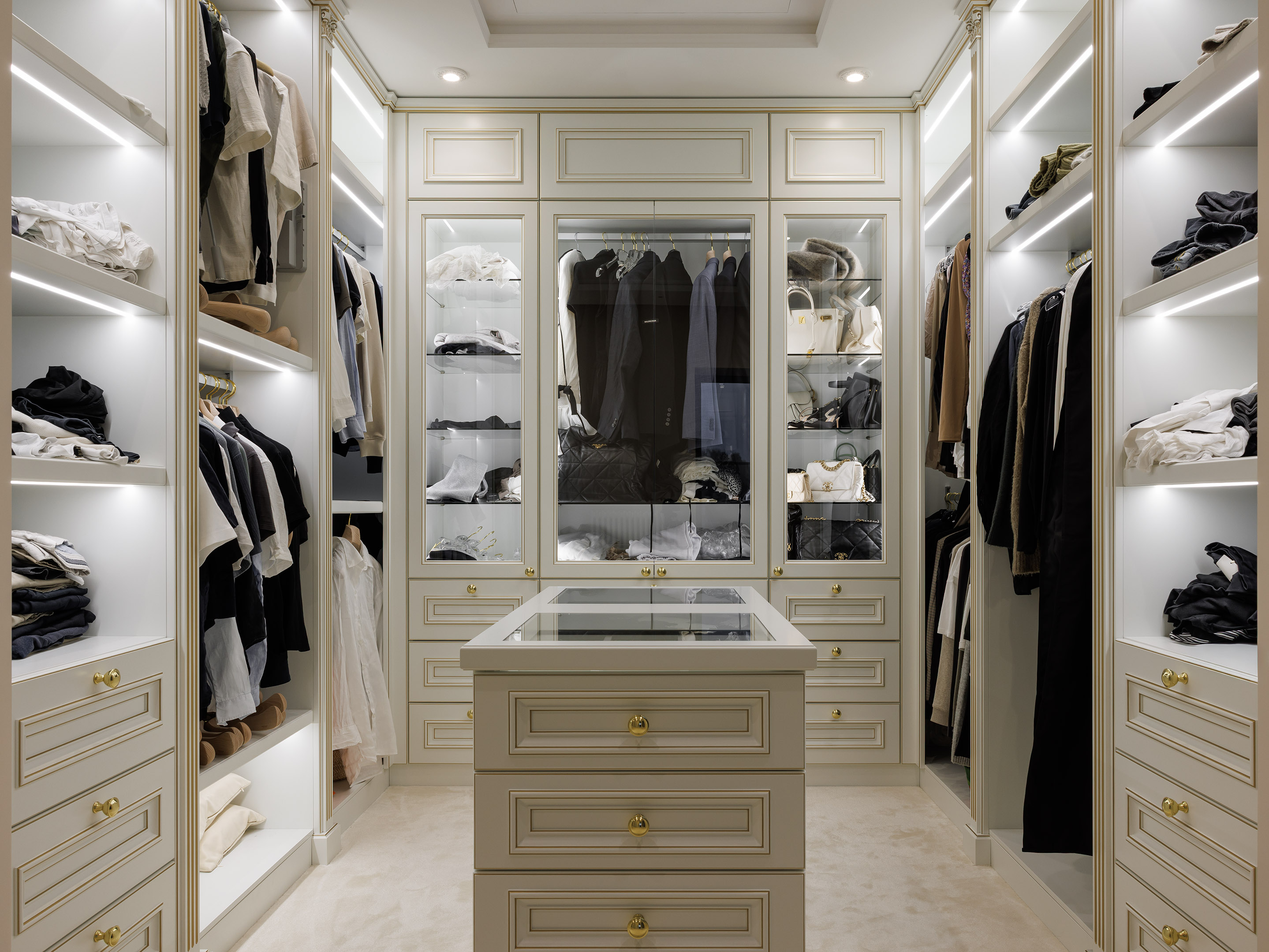 Объёмная гардеробная комната оснащена системами хранения и островом для аксессуаров — всё выполнено в едином стиле и с максимальным вниманием к деталям.