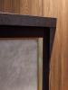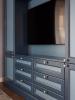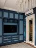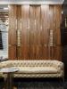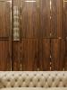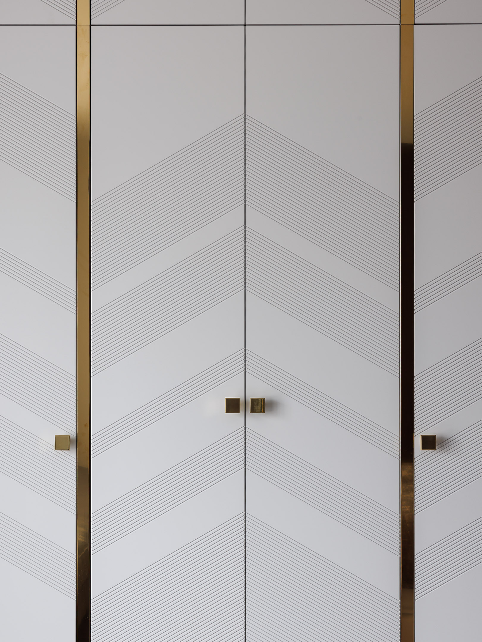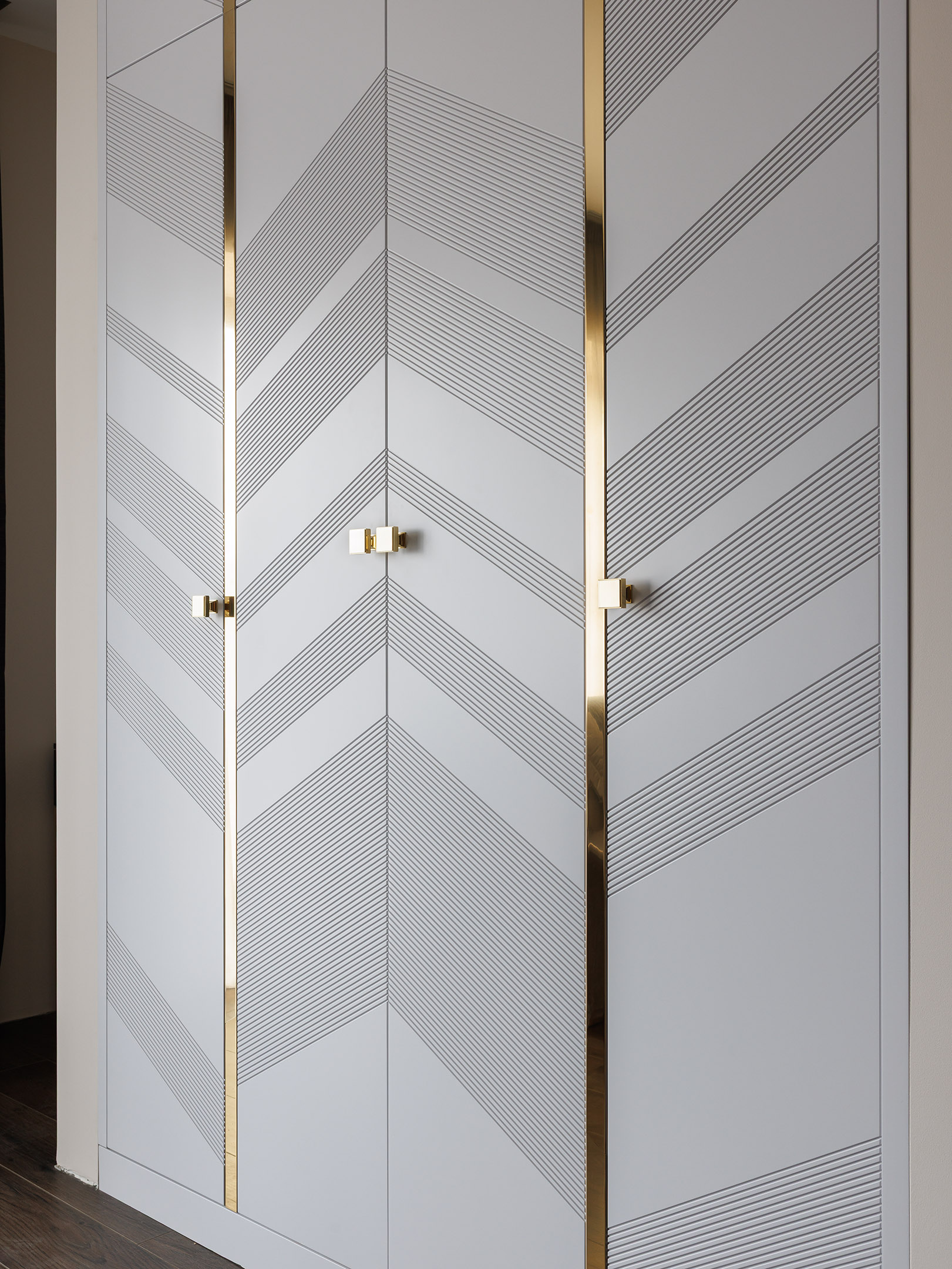 Ярким элементом интерьера стал кабинет. Здесь мы создали уникальные фасады со сочетанием шпона и металлических вставок, изготовили рабочий стол с авторской отделкой и оформили стену объёмными панелями из того же шпона. Даже потолочная зона включает элементы нашей работы.