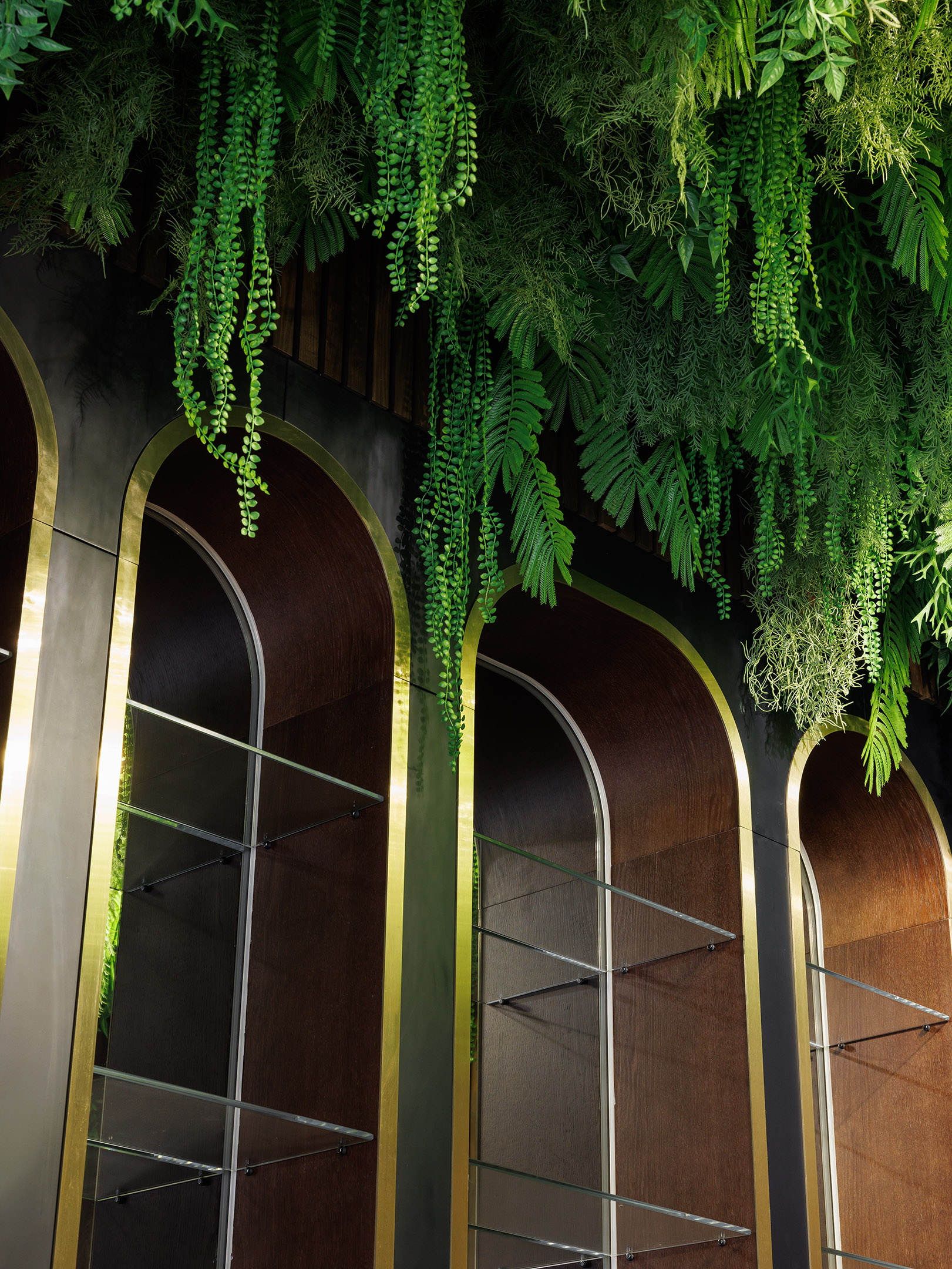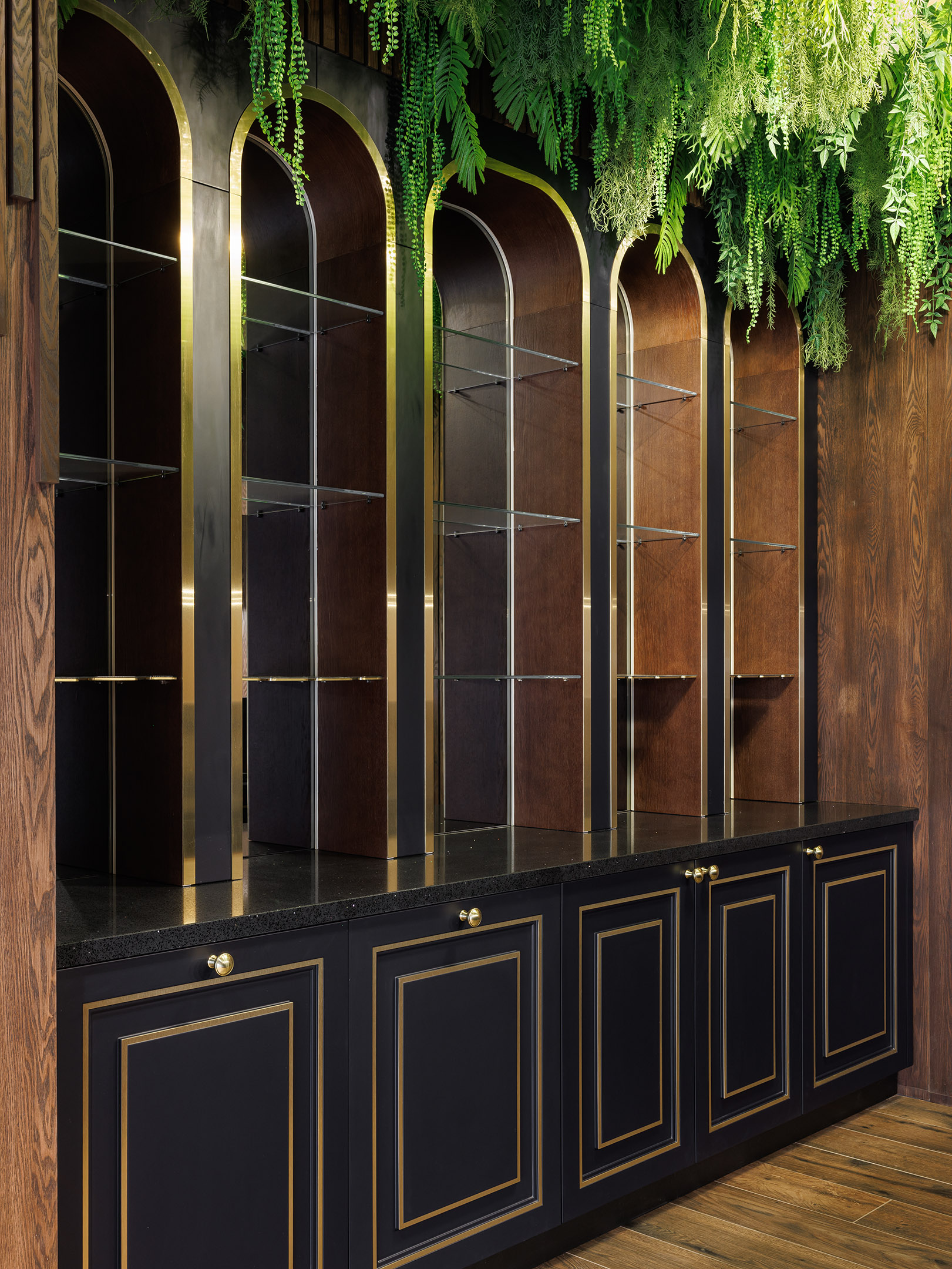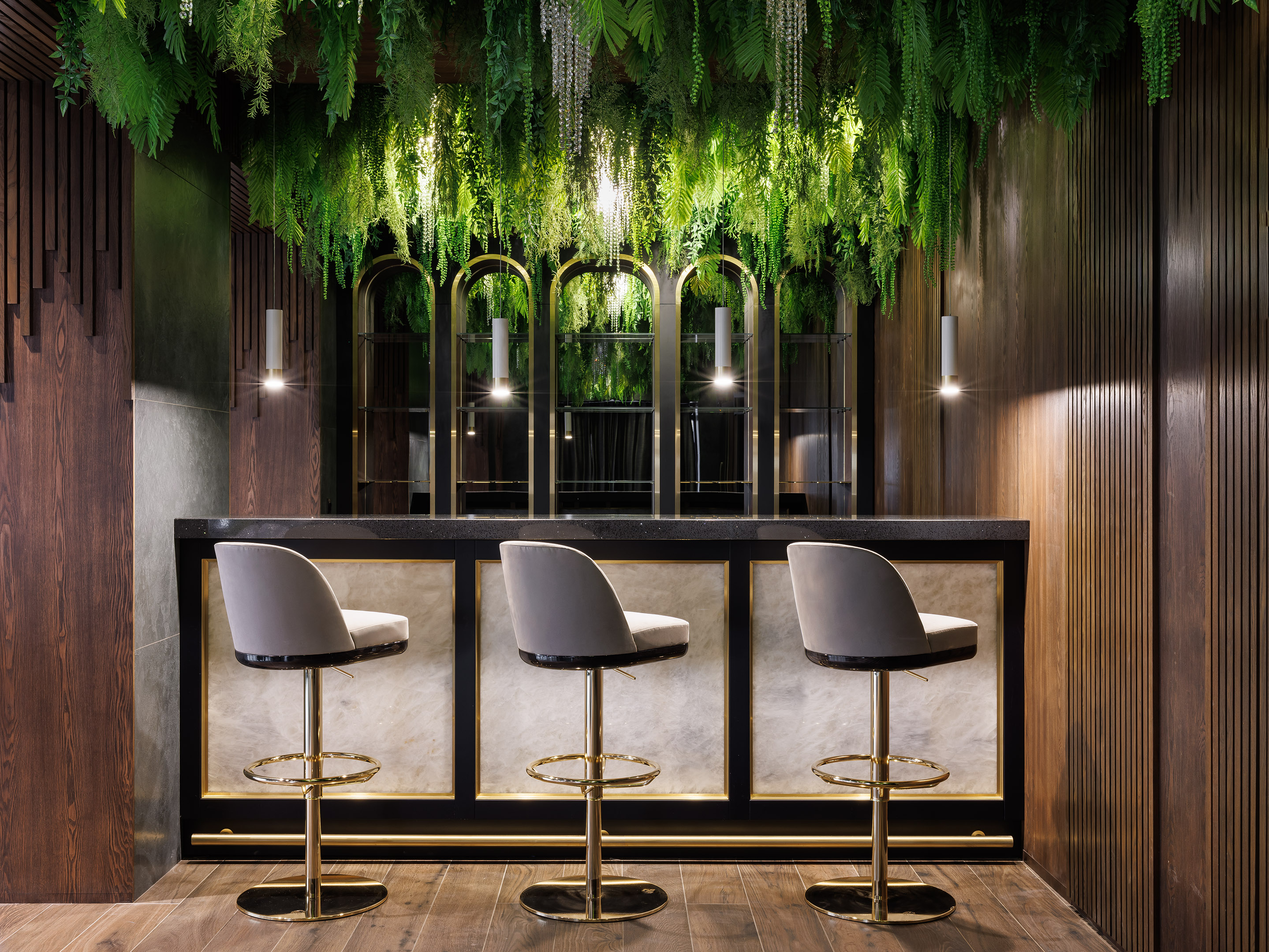 В отдельном здании СПА с бассейном мы разработали и произвели барную зону: металлические и зеркальные элементы, барная стойка с элементами из натурального камня и шкафы для хранения — всё выдержано в одном дизайне.
