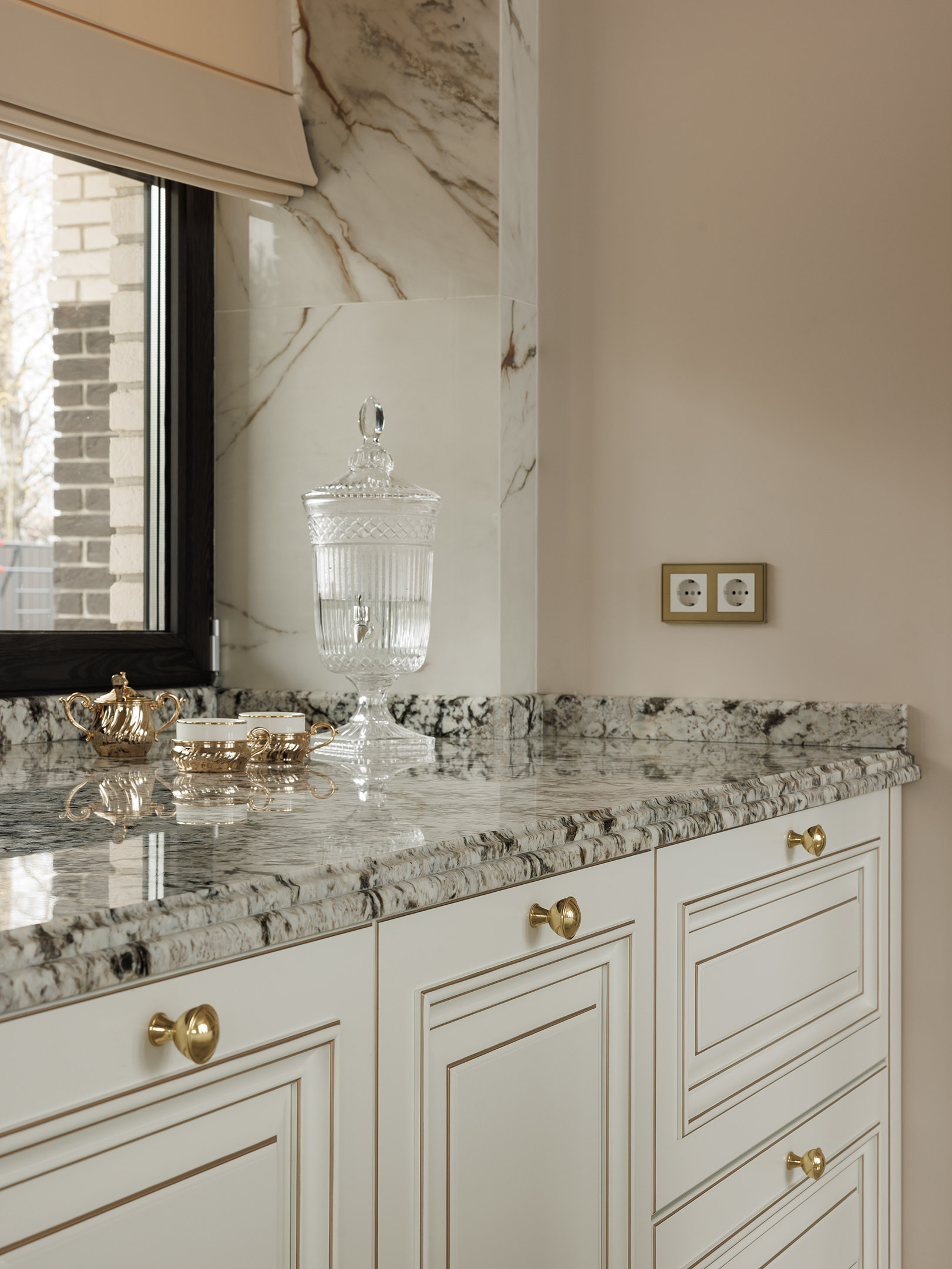 Натуральный камень в столешнице усиливает ощущение основательности и тактильного качества. Здесь нет отдельных акцентов — всё собрано в одной стилистике и поддерживает архитектуру кухни. Именно такая согласованность деталей и создаёт ощущение спокойной, выверенной классики, рассчитанной на долгие годы.