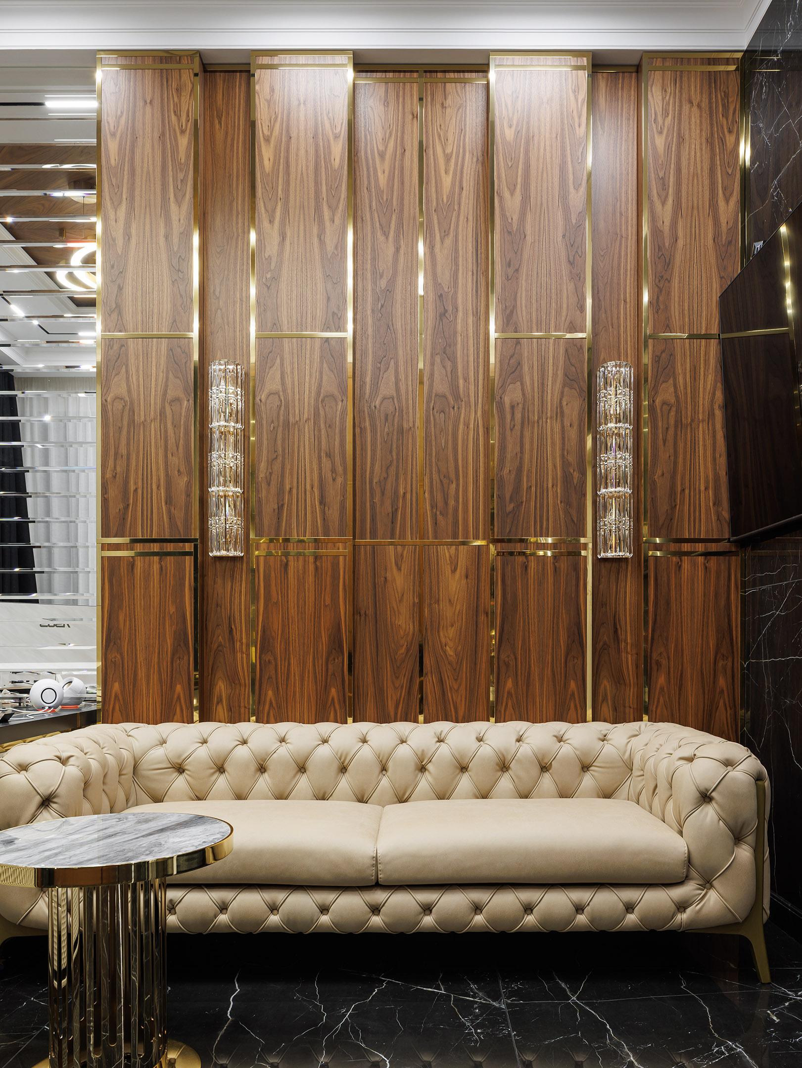 В основе композиции — сочетание натурального шпона с выразительной текстурой и металлических элементов с тёплым золотистым оттенком. Вертикальные панели формируют архитектуру пространства и задают ритм всей стене, одновременно выполняя декоративную и функциональную роль. Часть объёма занимает витринная зона со стеклянными фасадами и внутренней подсветкой — она предназначена для хранения коллекций и предметов, которые становятся частью интерьера.