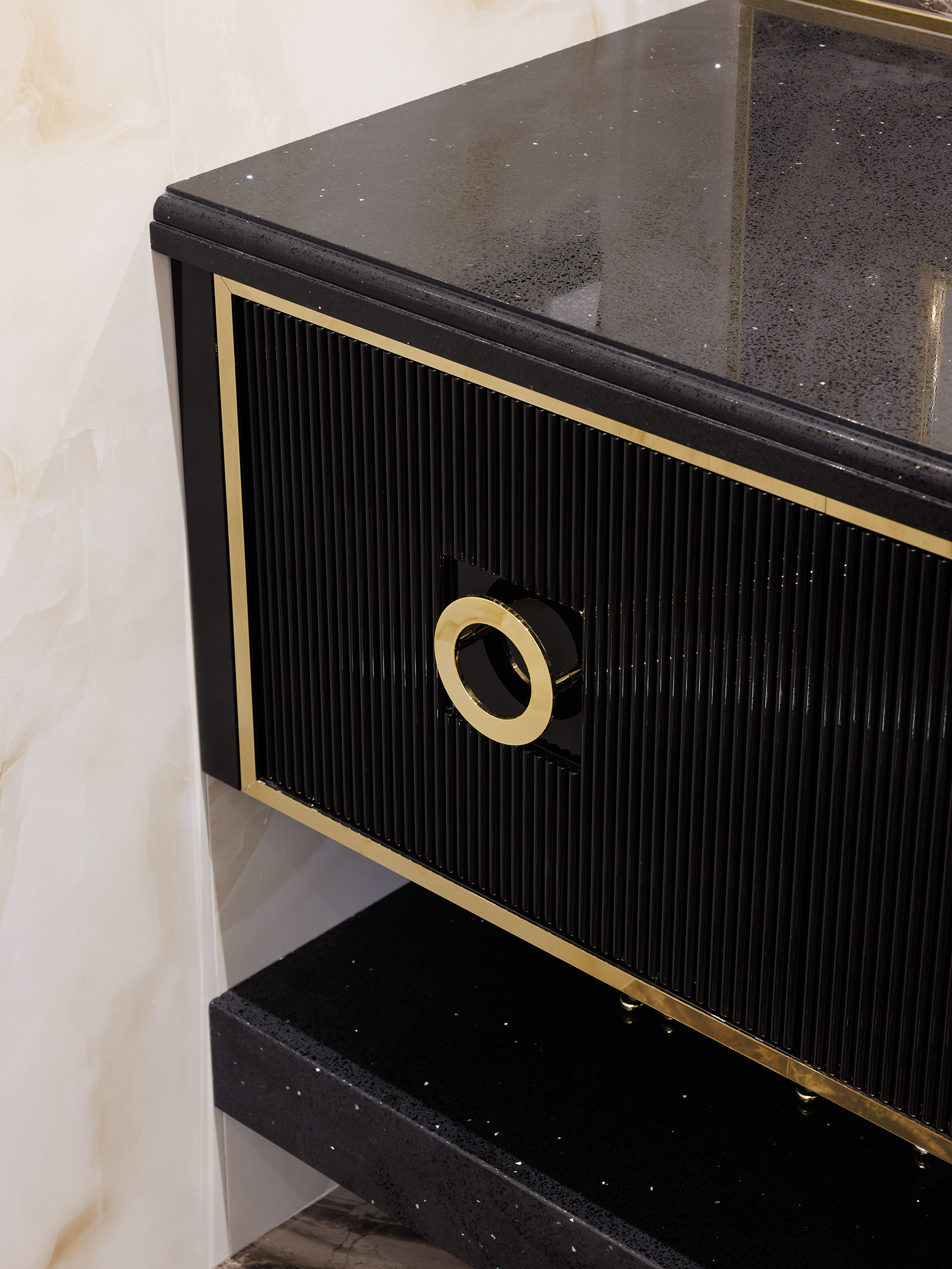 На первый взгляд здесь работает выразительное сочетание материалов — тёмный камень, тёплый золотистый металл и фактурные фасады. Но значительная часть работы скрыта в самой конструкции мебели.