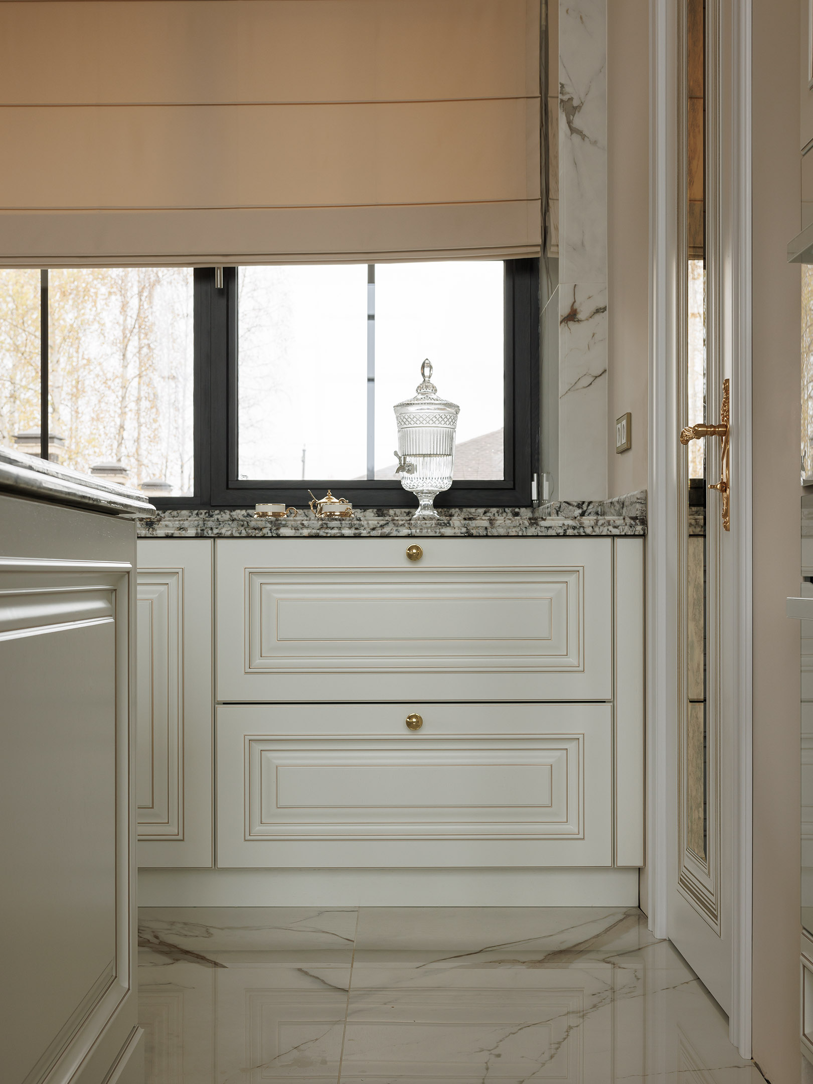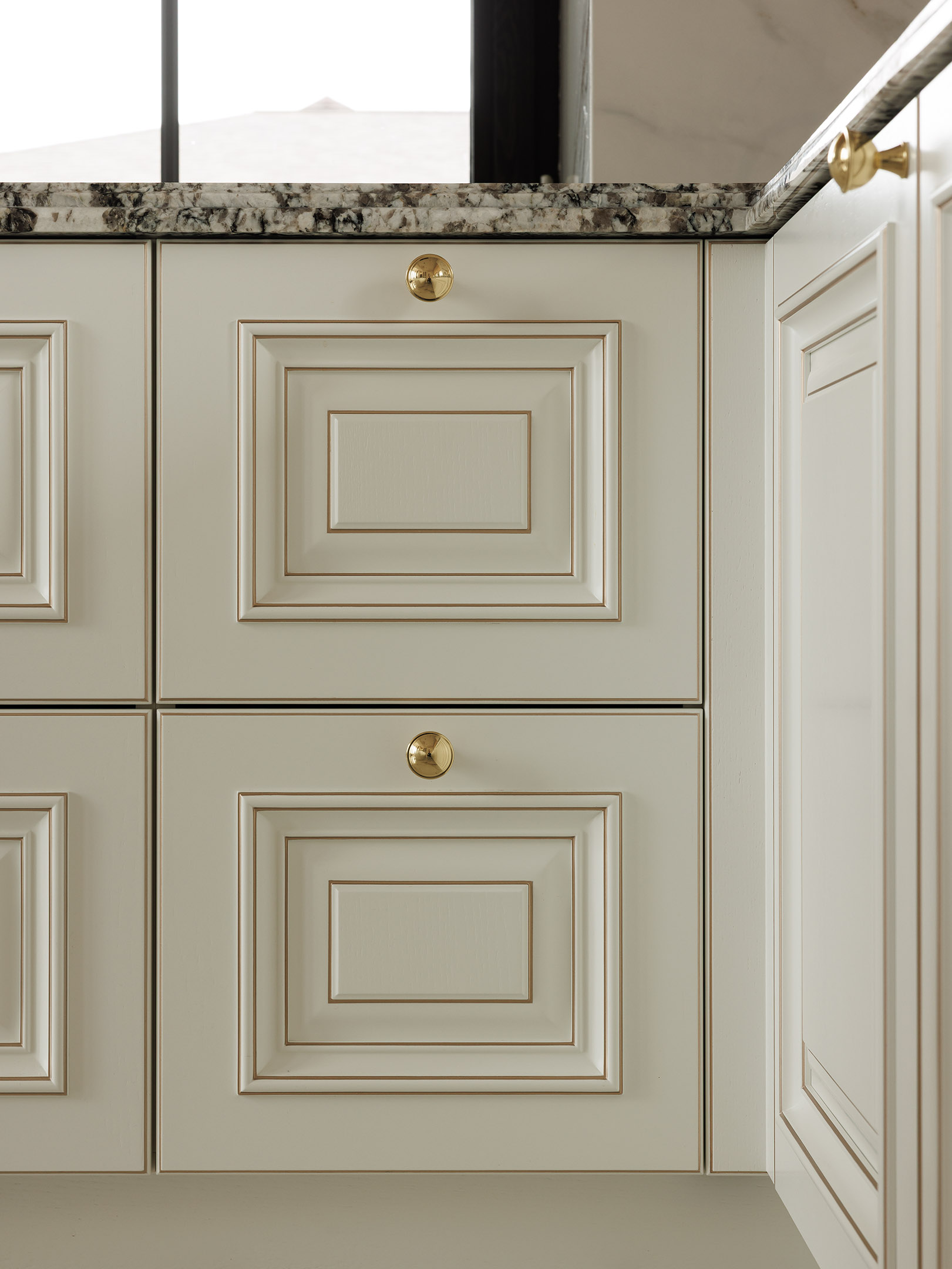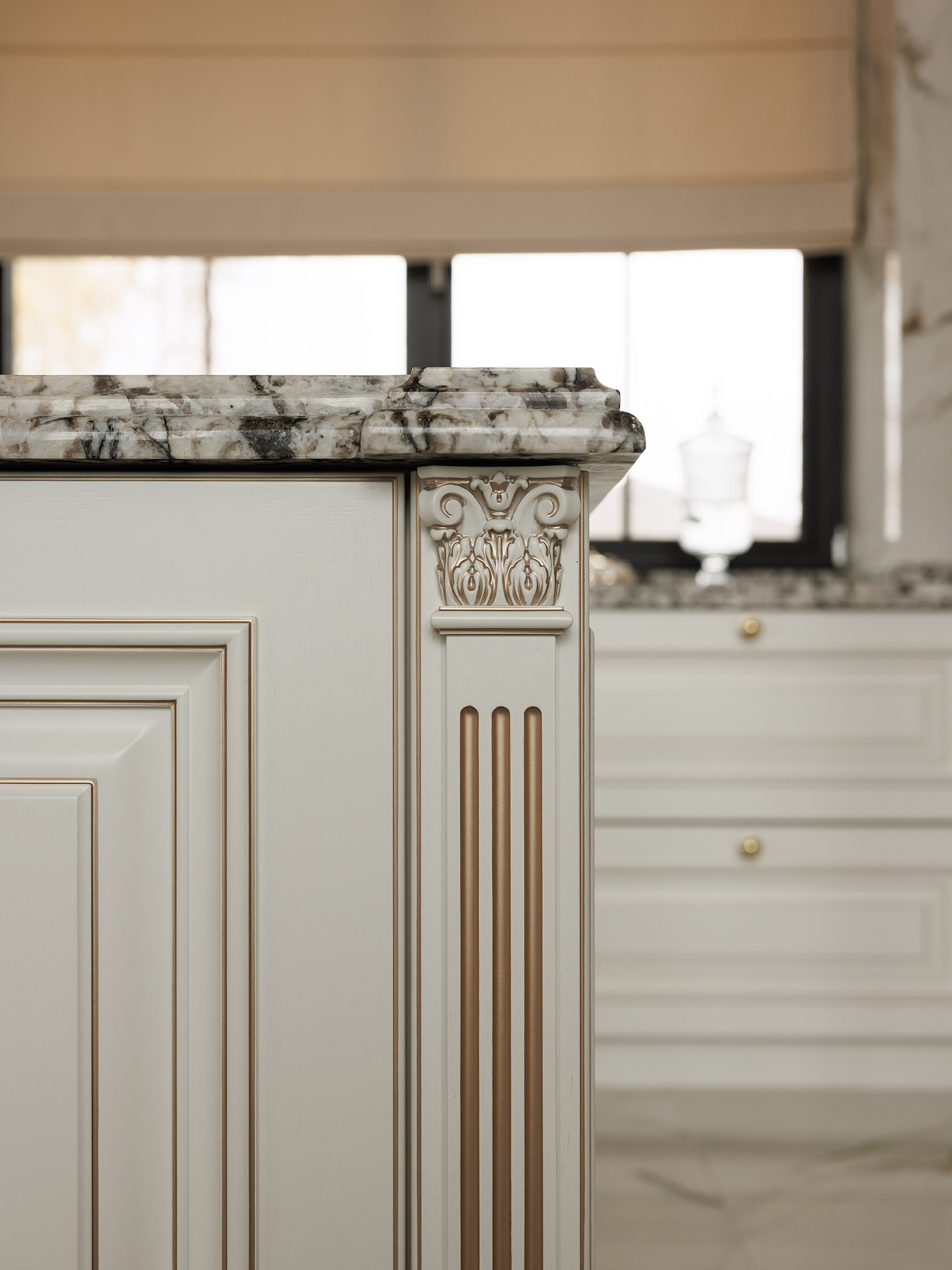 Классические сборные фасады выполнены с ручной проработкой рельефа. Патина здесь работает как инструмент — она подчёркивает глубину, делает перепады уровней читаемыми и придаёт фасадам объём даже в светлой гамме. Вертикальные элементы и резной декор заранее спроектированы под размеры кухни, чтобы сохранить чистоту пропорций и избежать случайных стыков.