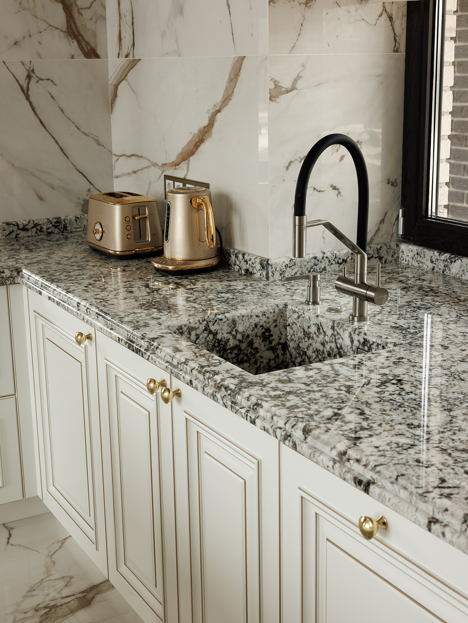 Натуральный камень в столешнице усиливает ощущение основательности и тактильного качества. Здесь нет отдельных акцентов — всё собрано в одной стилистике и поддерживает архитектуру кухни. Именно такая согласованность деталей и создаёт ощущение спокойной, выверенной классики, рассчитанной на долгие годы.
