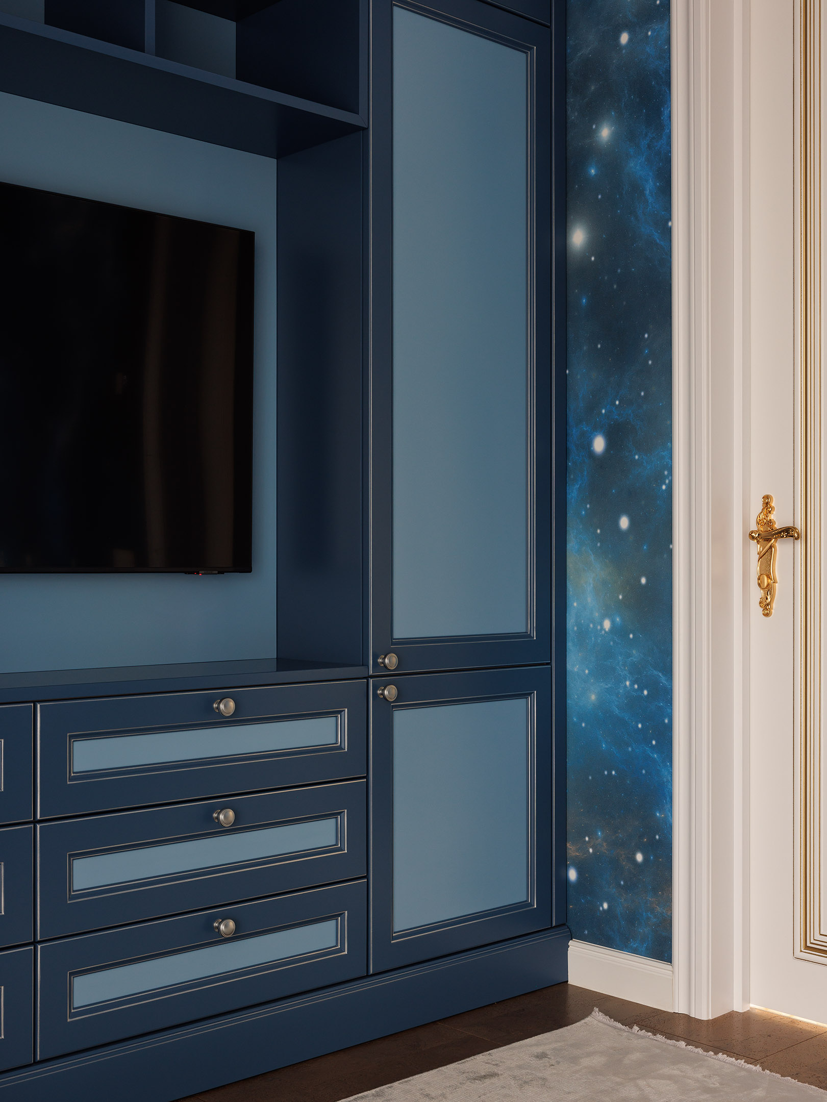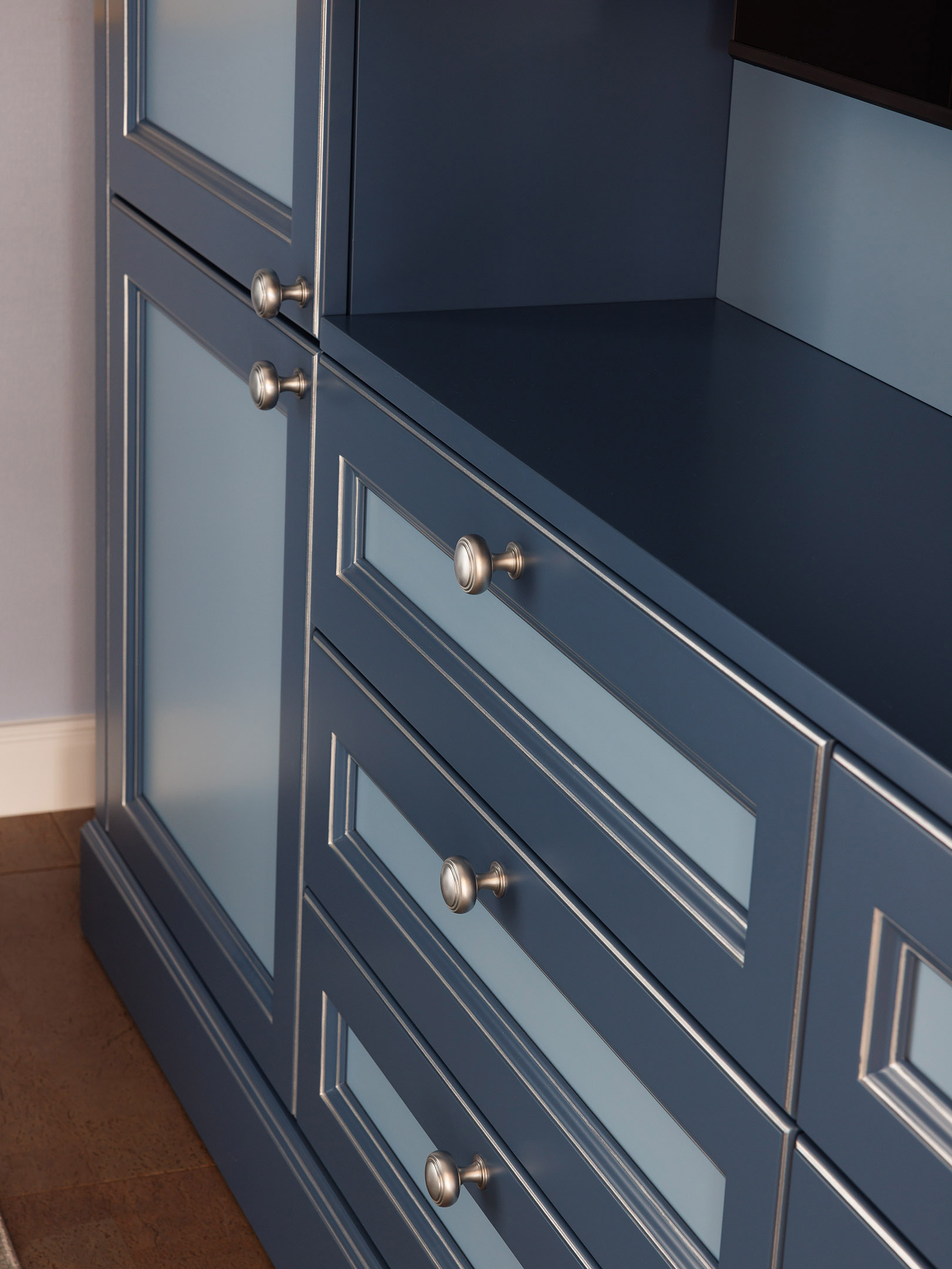 И, конечно, за внешней симметрией стоит работа проектировщика. Продуманные сценарии хранения, распределение ящиков и секций, баланс между закрытыми объёмами и центральной нишей под телевизор — всё это формирует не просто красивую композицию, а удобную, функциональную систему для жизни.