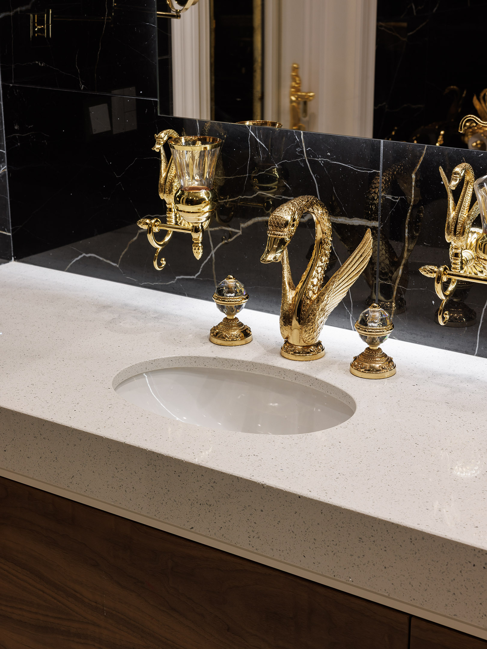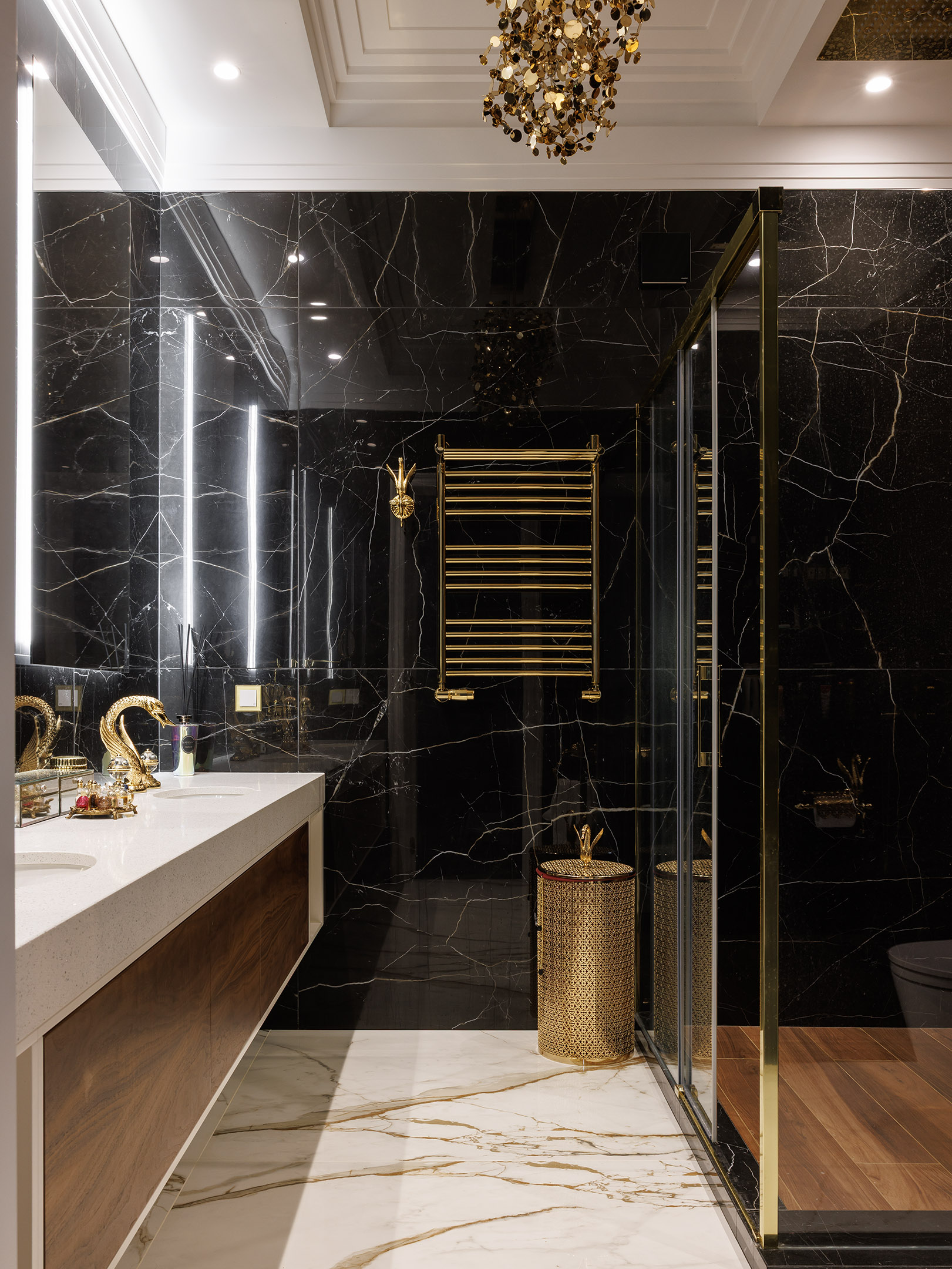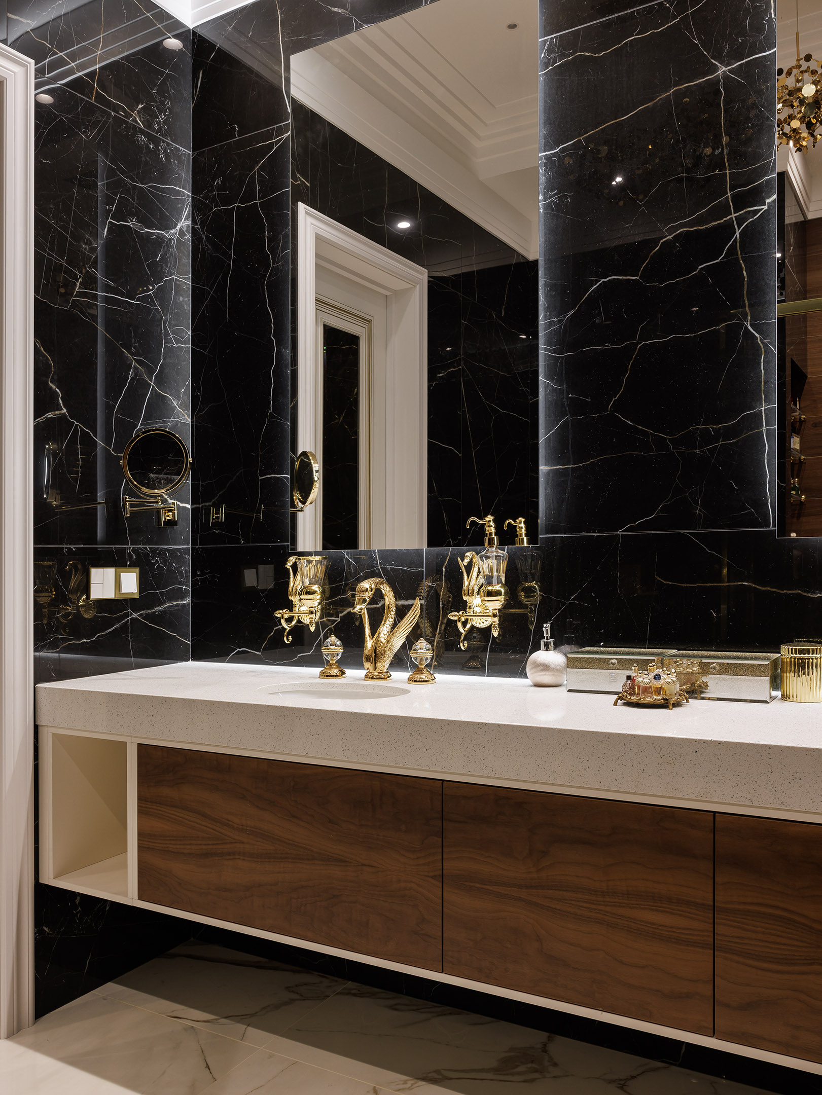 Шпон с выразительным рисунком уравновешивает графику чёрного мрамора, светлая столешница добавляет визуальную паузу, а подвесная конструкция облегчает объём.