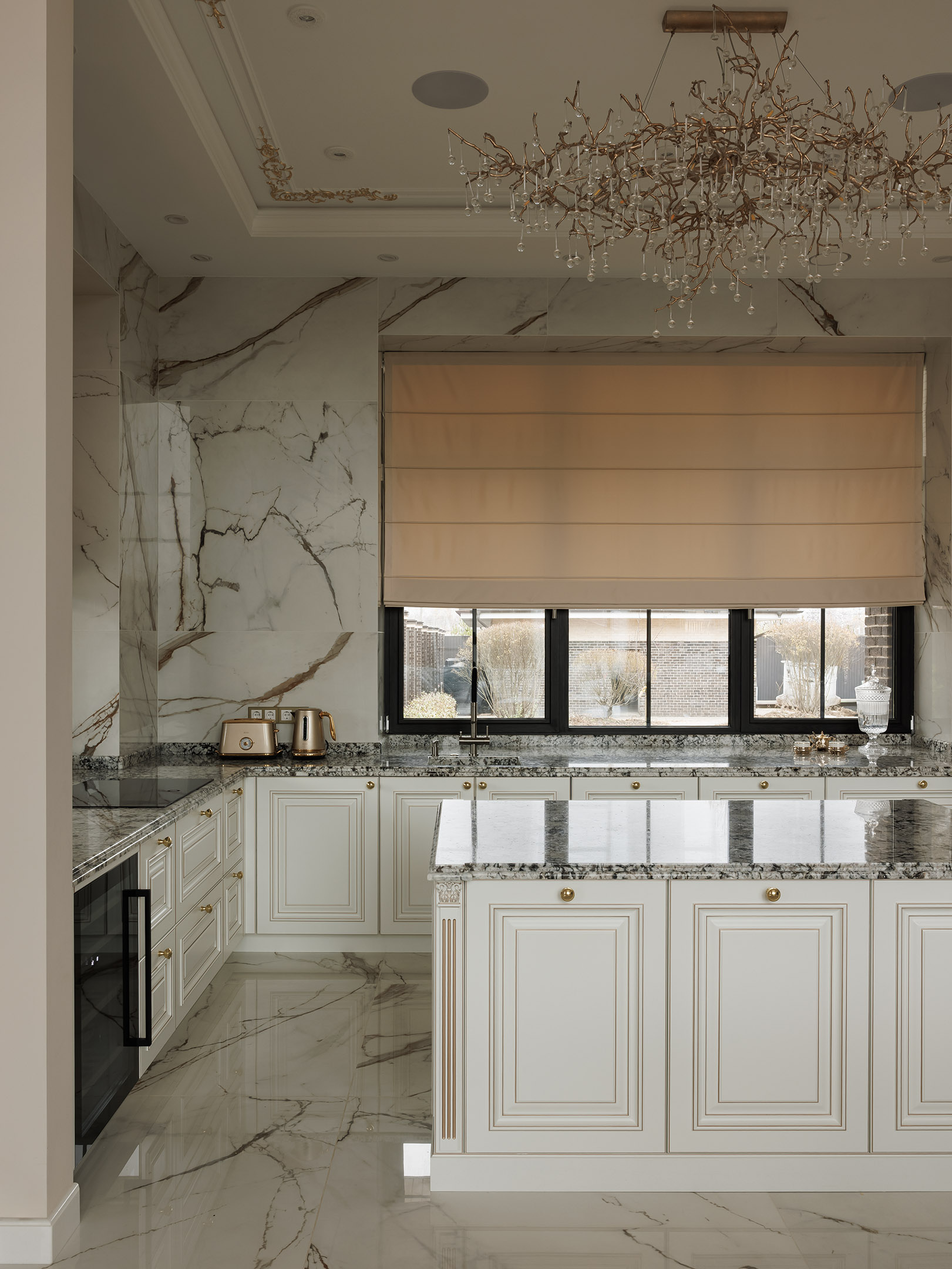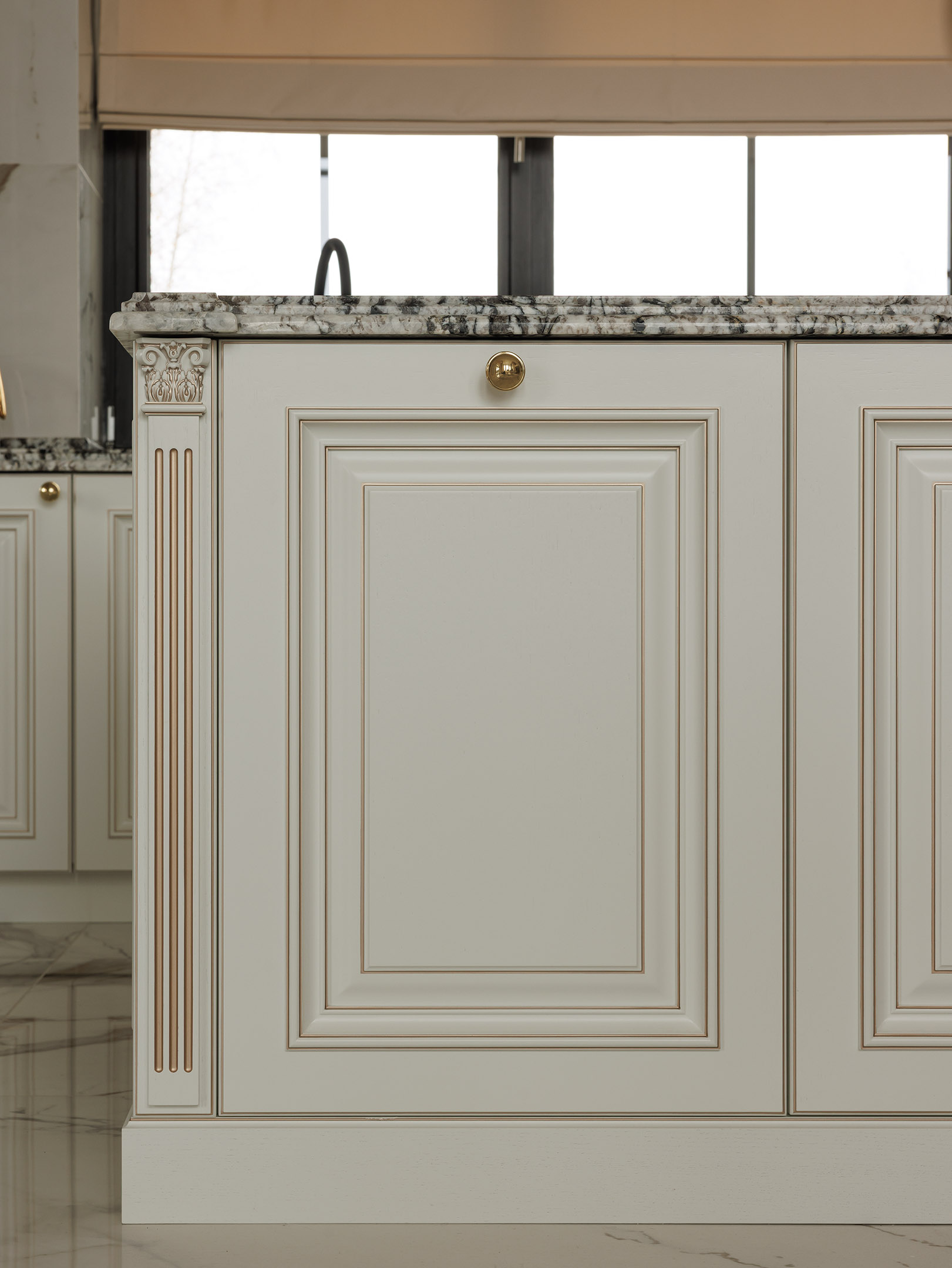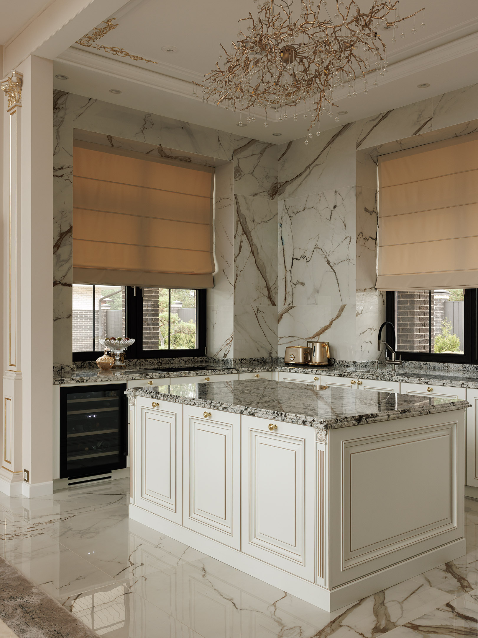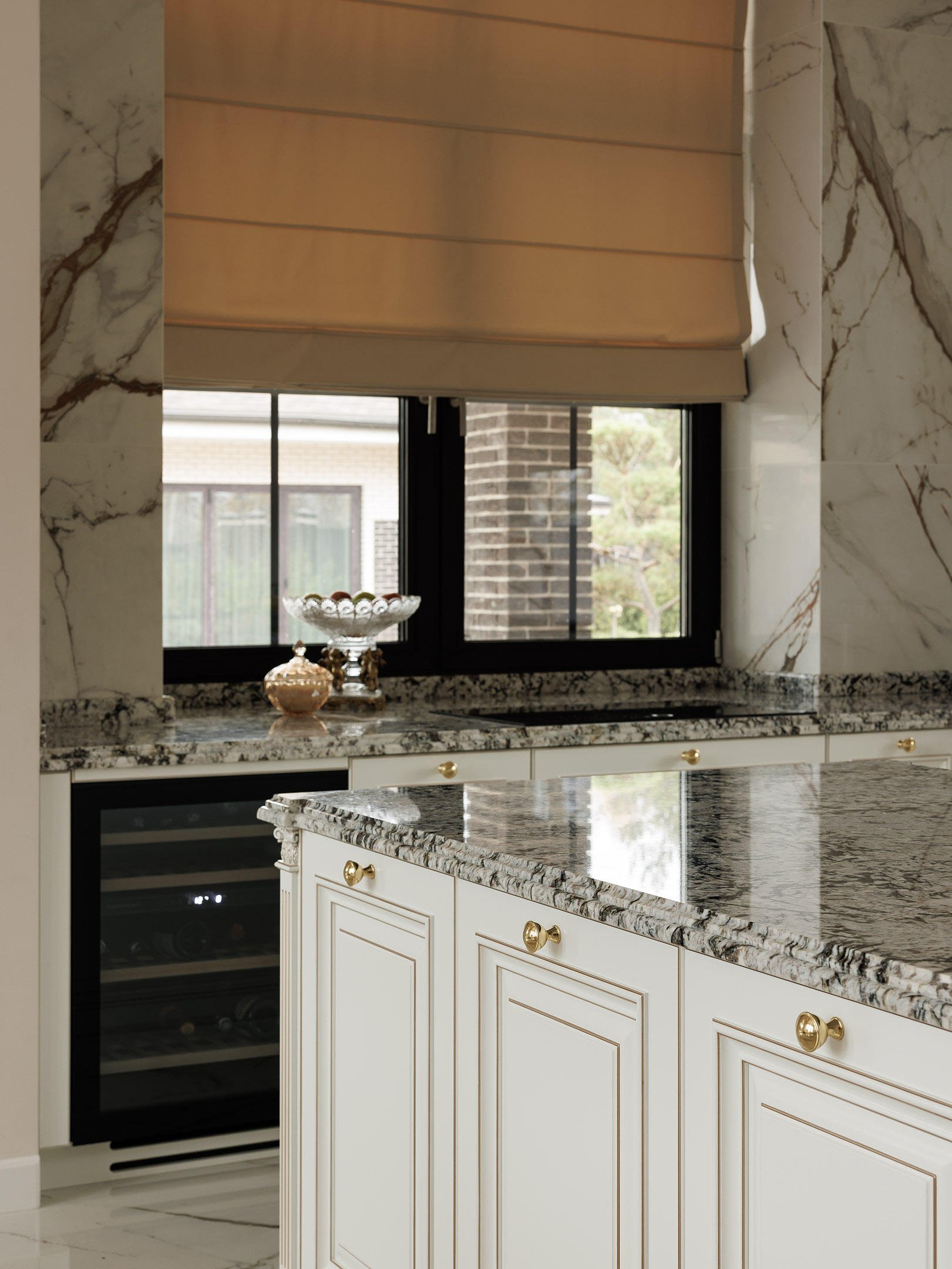 В результате остров работает как логичное продолжение кухни: функциональный, пропорциональный и собранный элемент, который объединяет пространство и подчёркивает статус всего интерьера.