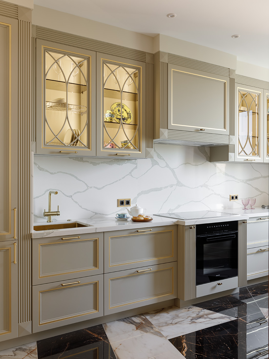 Немного солнечного тепла и уюта не помешает любой кухне. В этом проекте специалисты мебельной фабрики Orange Park Joinery сделали акцент на кремовой гамме, которая обеспечила интерьеру нежность, деликатность и легкие медовые переливы. Присутствие оригинальной фурнитуры торговой марки Hettich добавило всем функциональным элементам практичности, надежности и эстетики. Золотистая отделка мебельных фасадов эмалью расставила локальные акценты и выгодно подчеркнула базовую цветовую гамму. Столешница из белого кварцевого агломерата добавила свежести. За счет идеально продуманных шкафов и столов вся встраиваемая бытовая техника компактно разместилась по вертикали, сэкономив тем самым пространство в помещении. Мы учли каждую мелкую деталь и уделили внимание всем нюансам классического интерьера, который помимо выдержанности и лаконичности также приобрел изящный лоск.