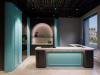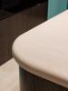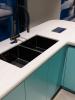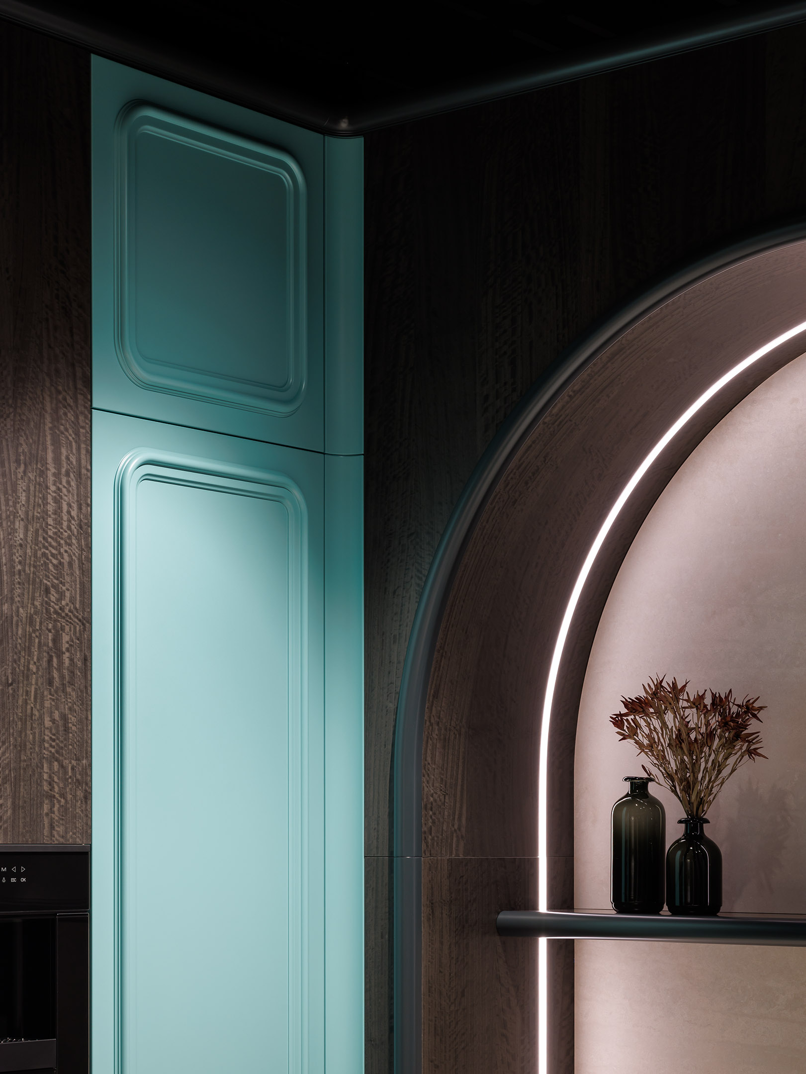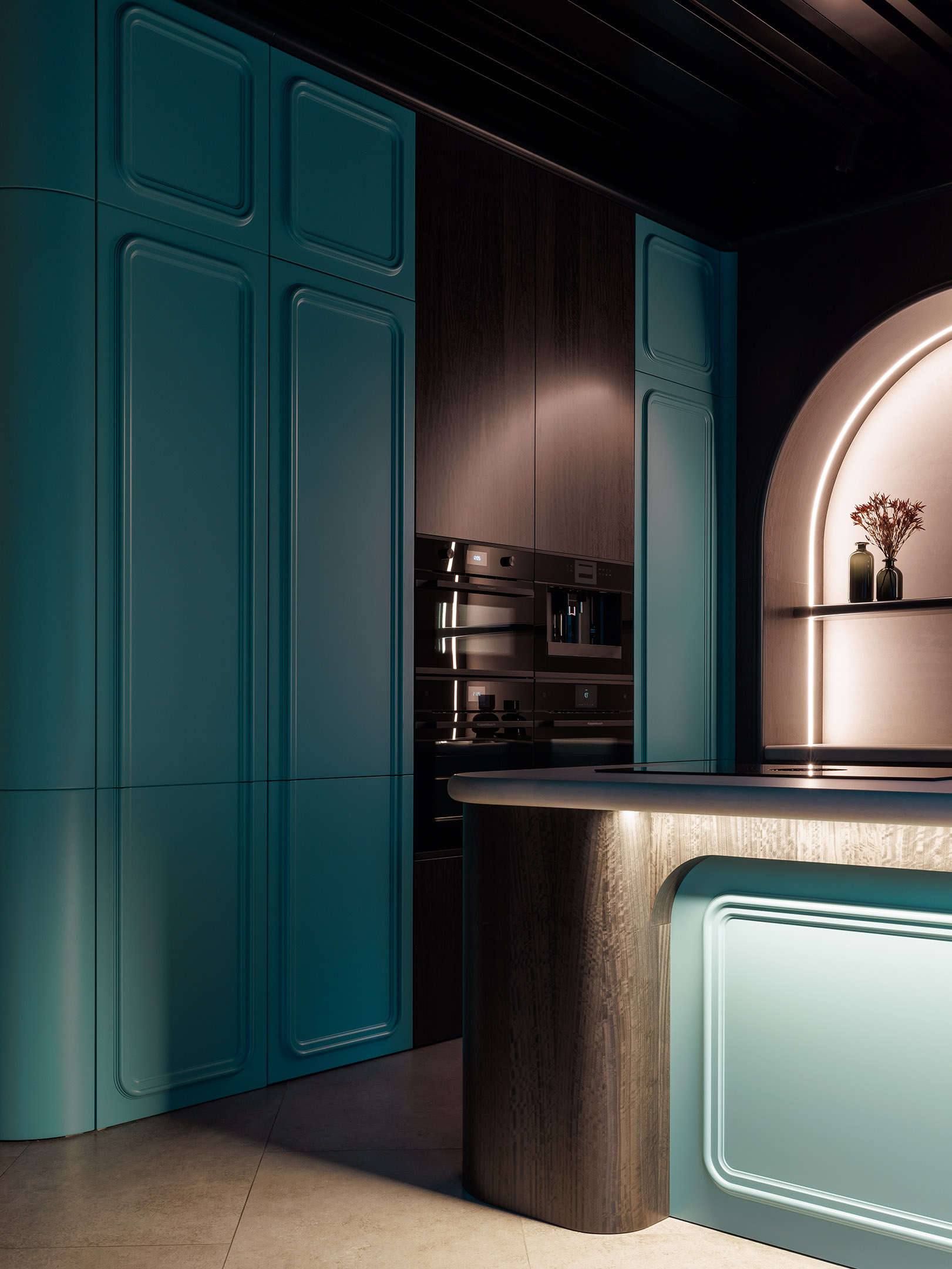Фасады выполнены в отделке натуральным шпоном эвкалипта и эмалью оттенка Tiffany.