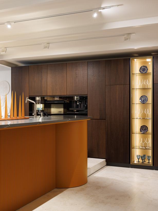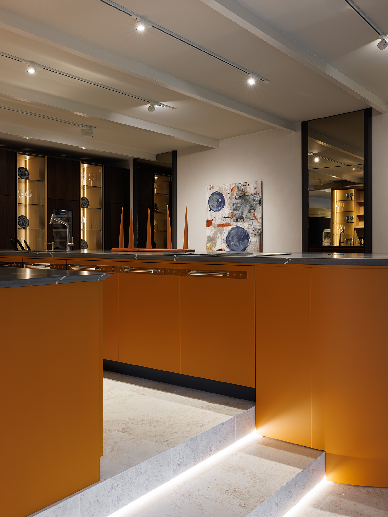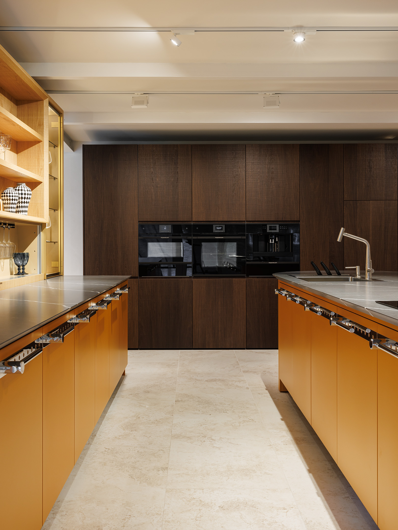 Вся фурнитура Blum, выдвижной механизм Kessebohmer с системой хранения. Витрины изготовлены из алюминиевых фасадов премиум-класса Mixal (Италия). Итальянский подъемный механизм функционального фартука.